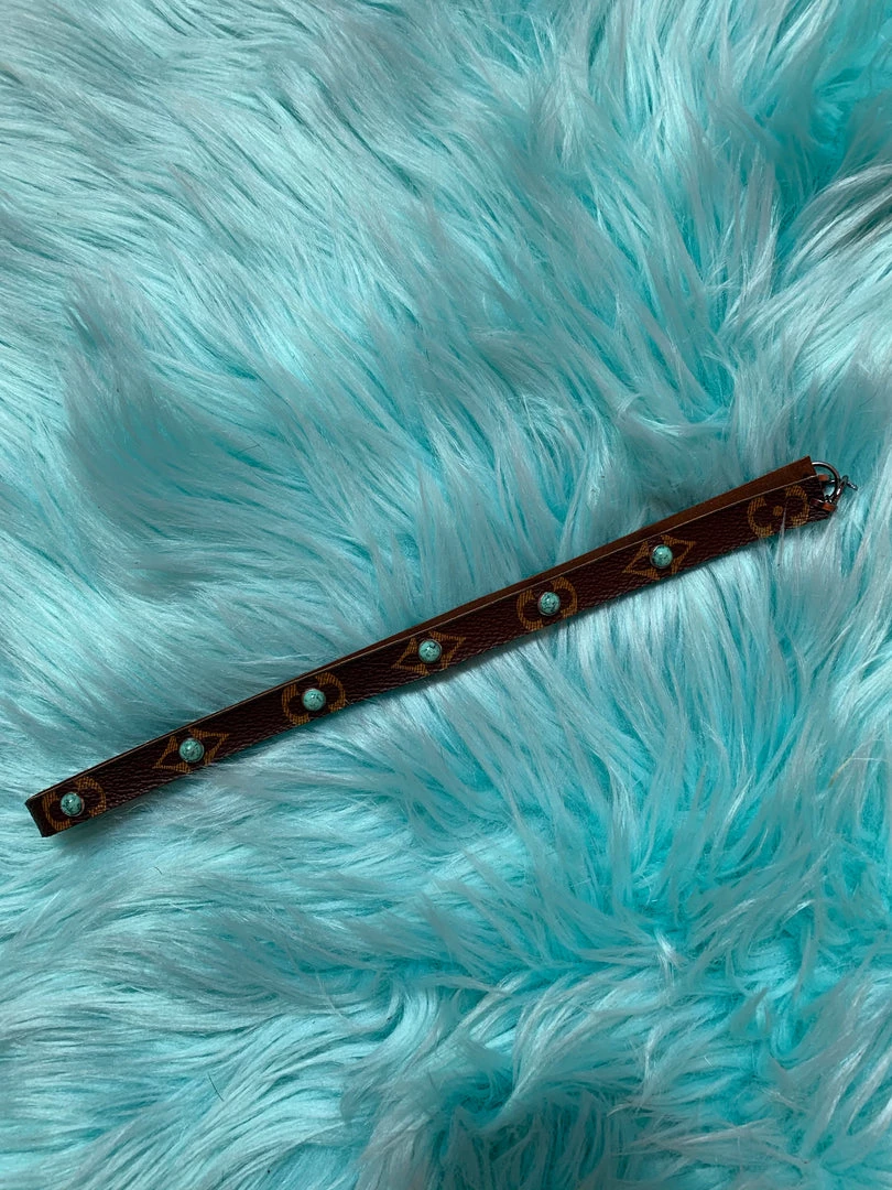 Designer inspired brown leather hatband with turquoise stones. Hatband also is perfect for a wrap bracelet.