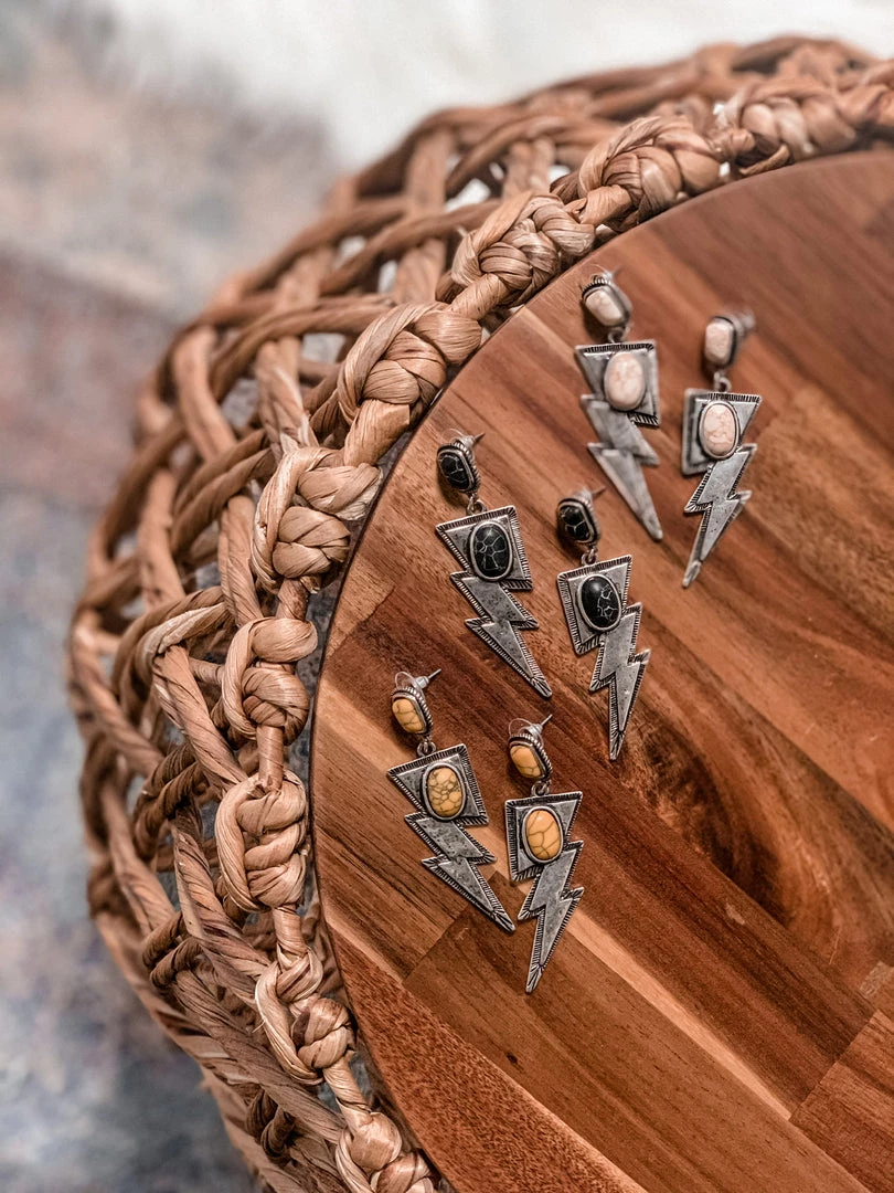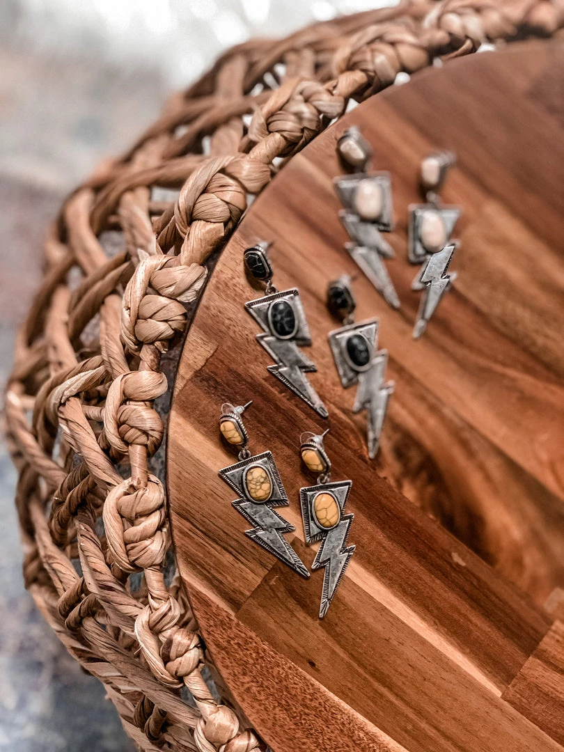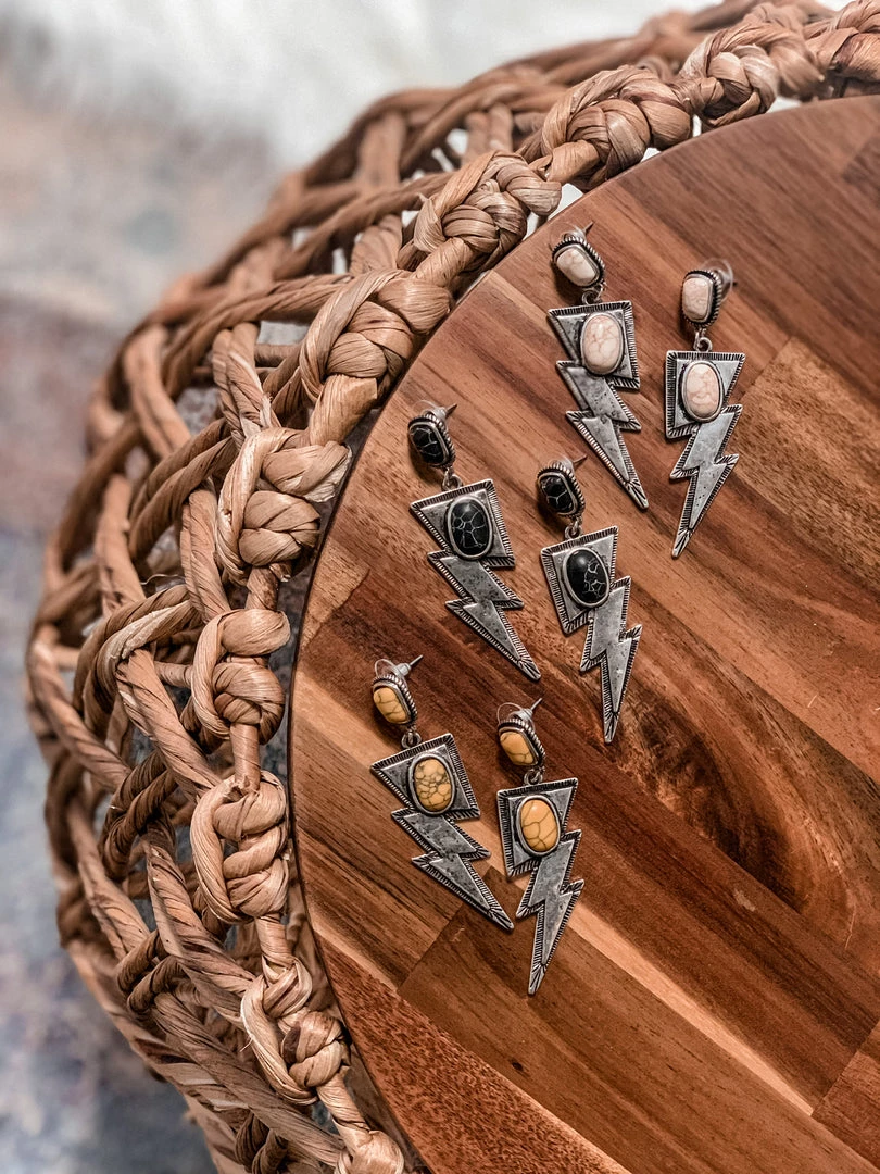 Beautiful metal lightning bolt earrings are the perfect touch to any look! Features an antique silver metal lightning bolt shape with a stone detail on a stone post set in a metal style setting. Earrings have three color options: black, ivory, and mustard.Â