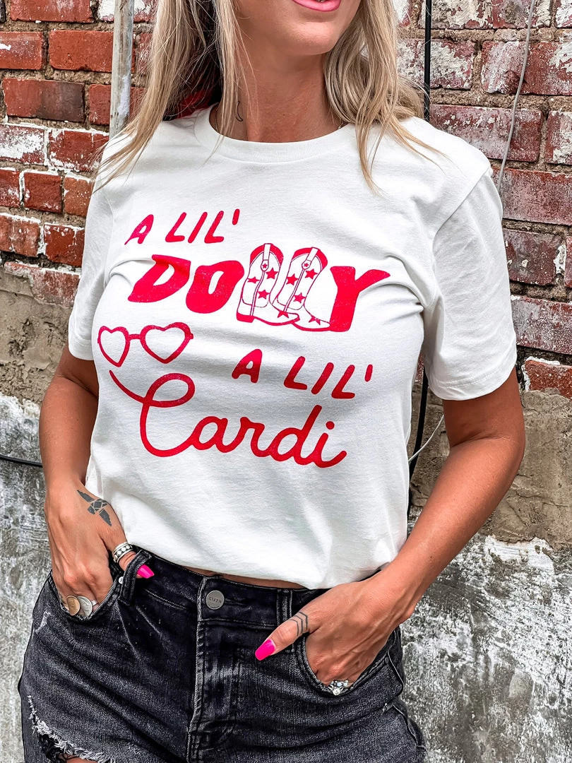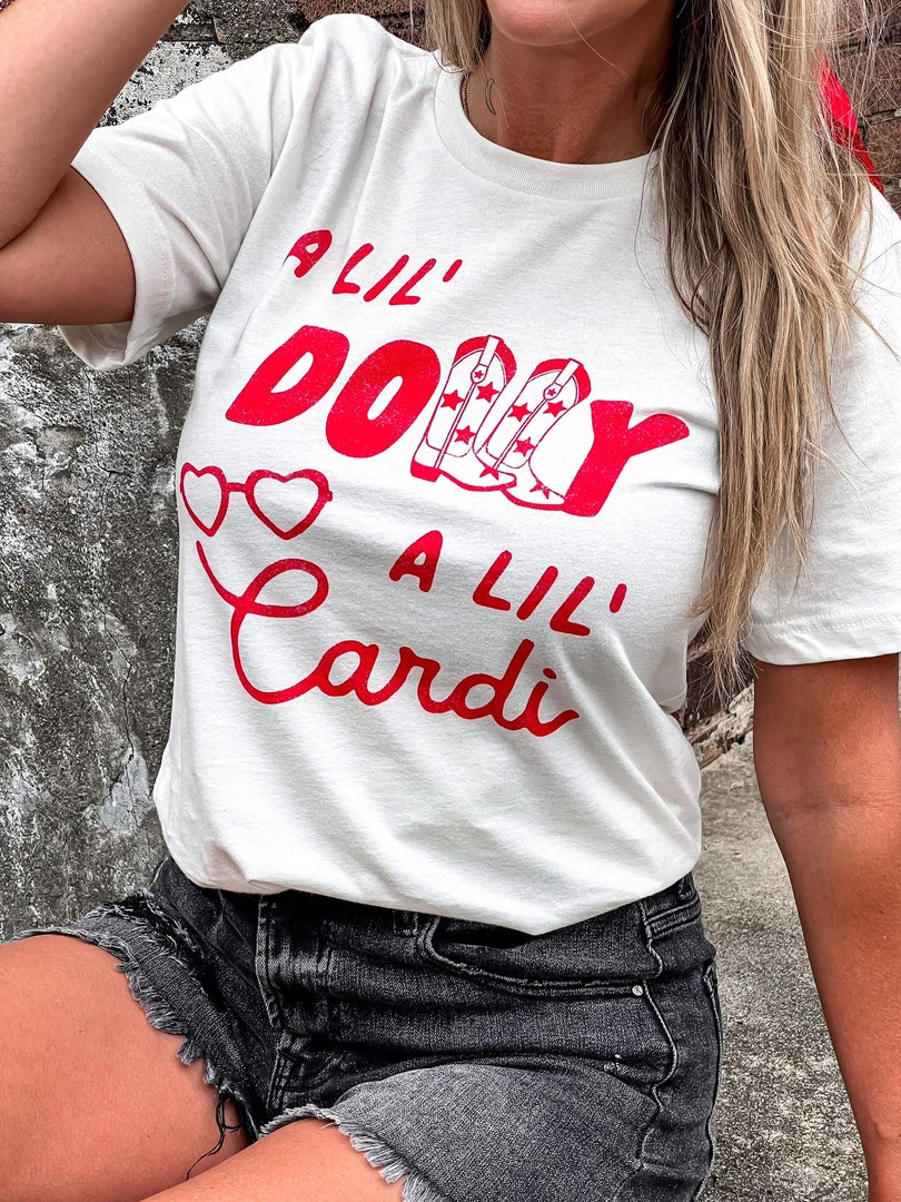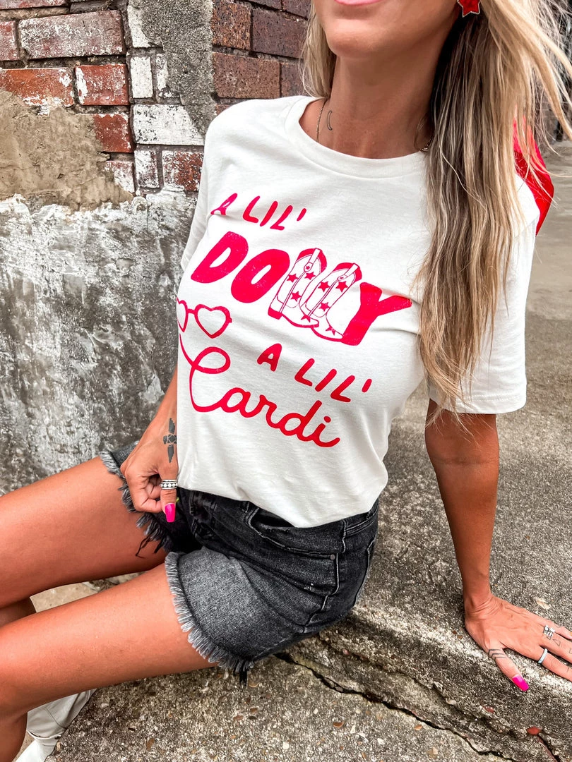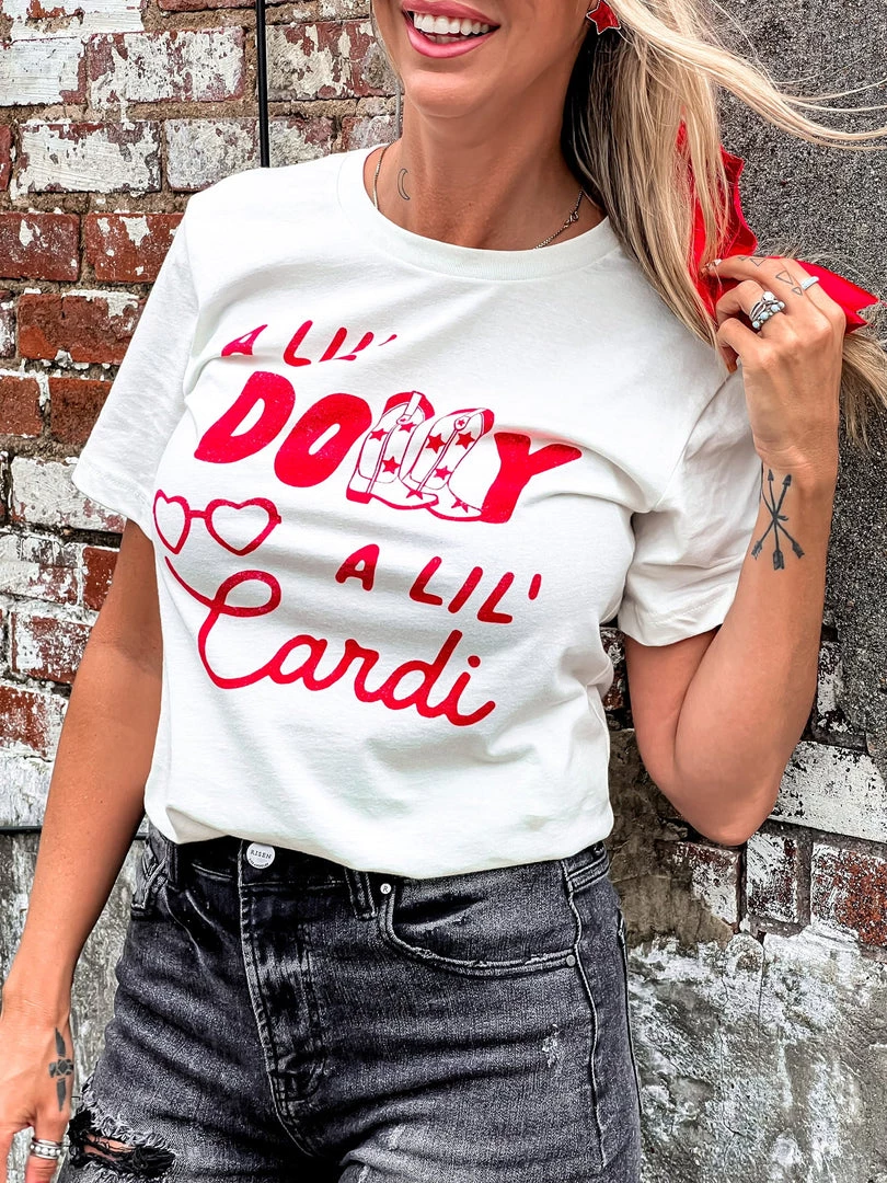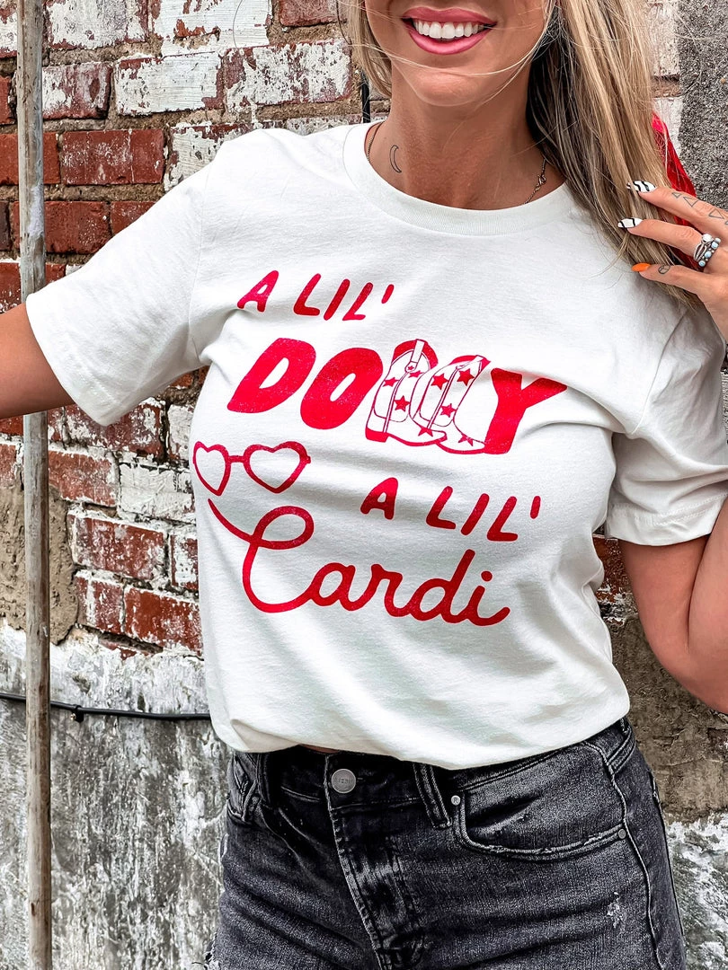 - Western “A Lil’ Dolly A Lil’ Cardi” on a vintage ivory white graphic tee