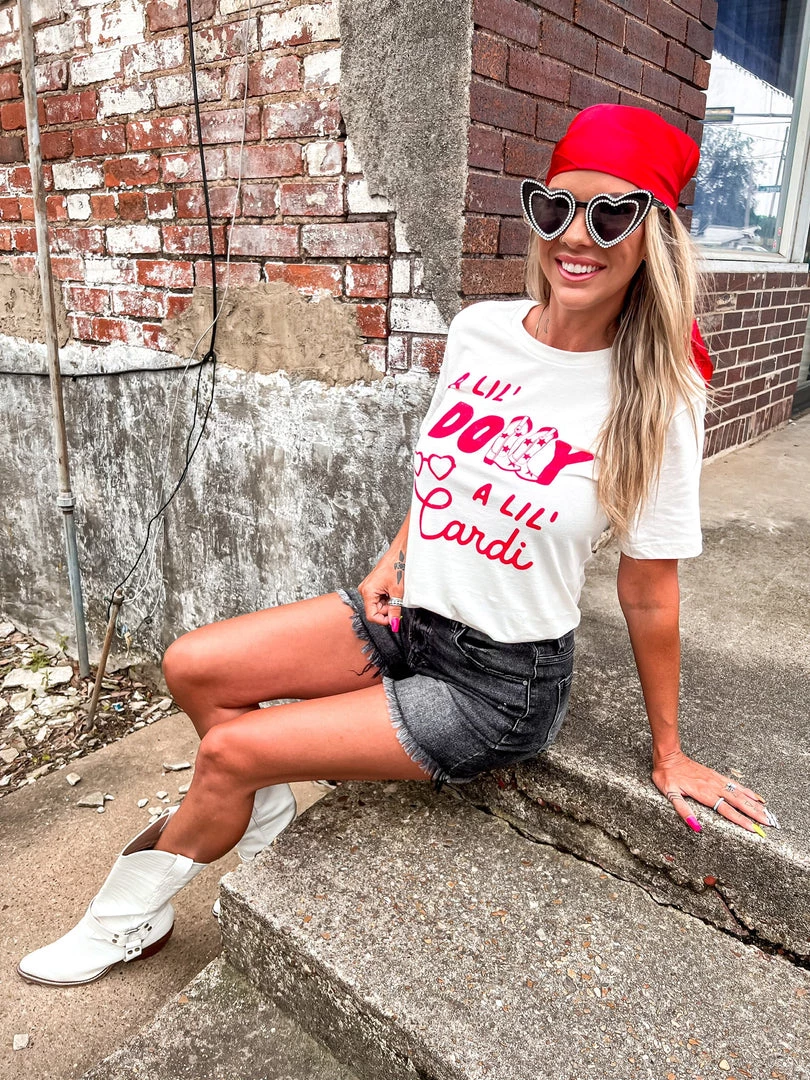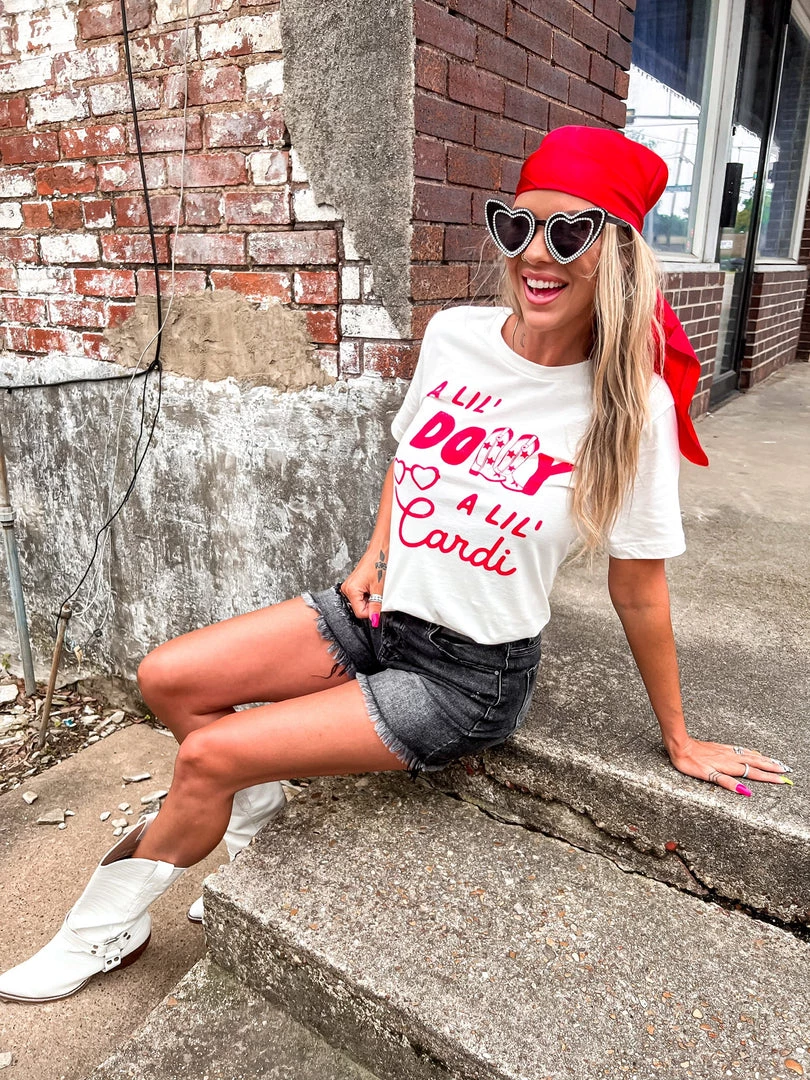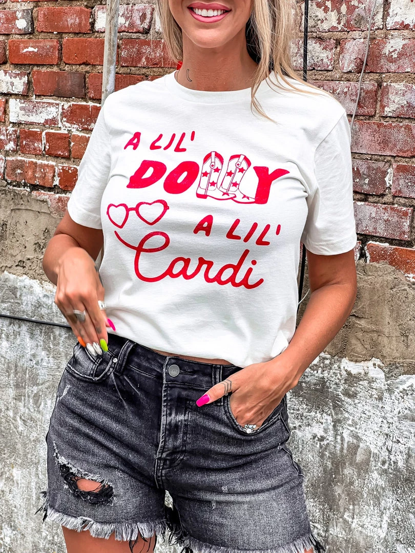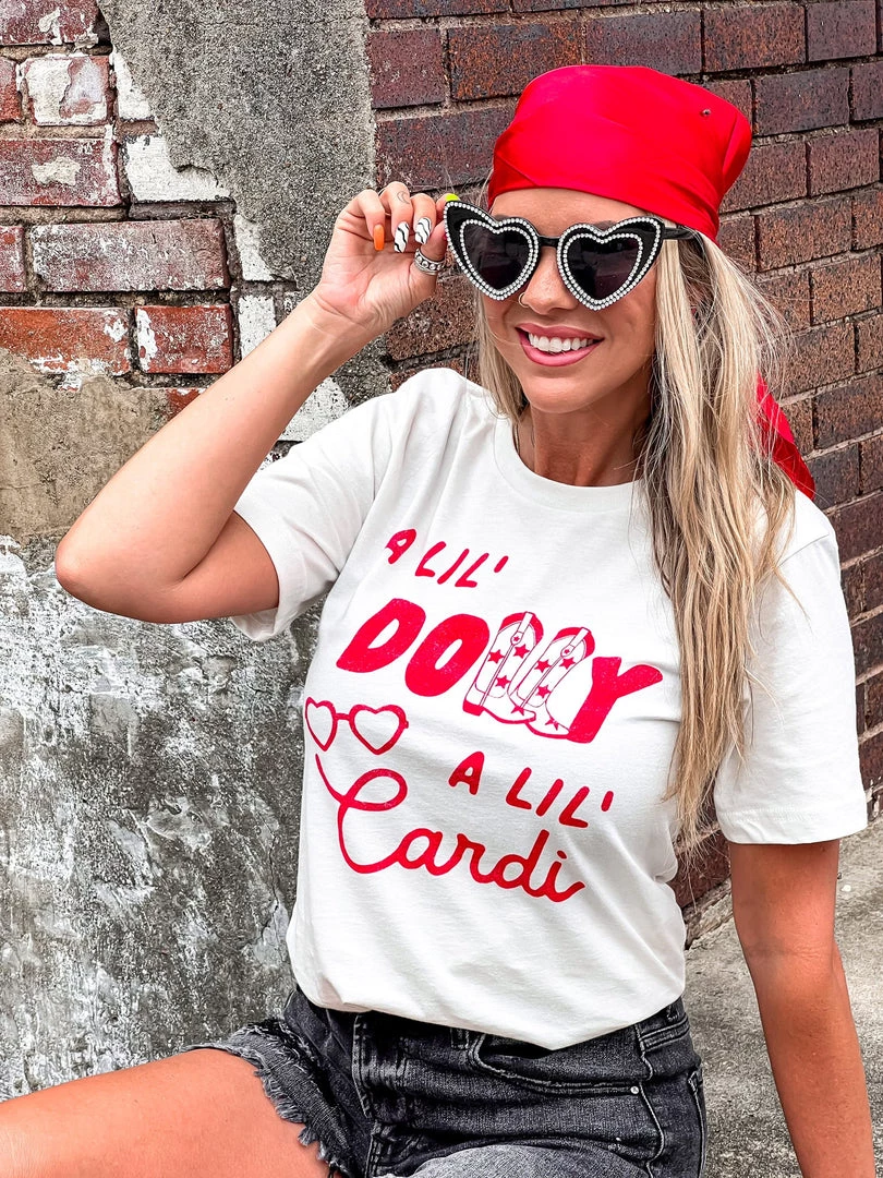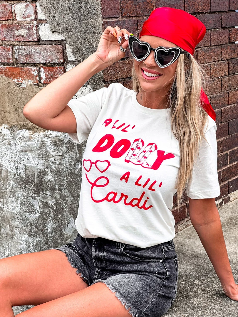 - Western “A Lil’ Dolly A Lil’ Cardi” on a vintage ivory white graphic tee
