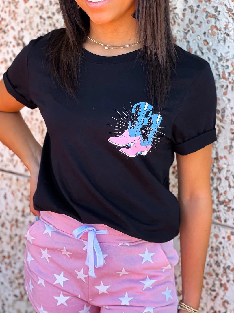 - Small pink and blue cowgirl boots graphic on the front left chest, “Howdy Howdy Howdy” quote in curvy font, floral pattern “Howdy”, white “Howdy”, pink “Howdy”