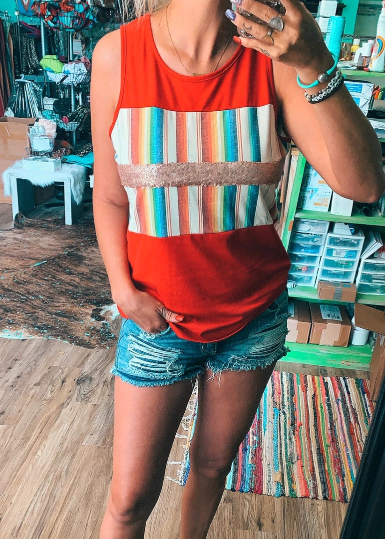 Red, serape, sequin color block tank is comfortable, stretchy, and super flattering. Such a show stopper tank top and we couldn’t be anymore obsessed. So soft and looks great with denim shorts.