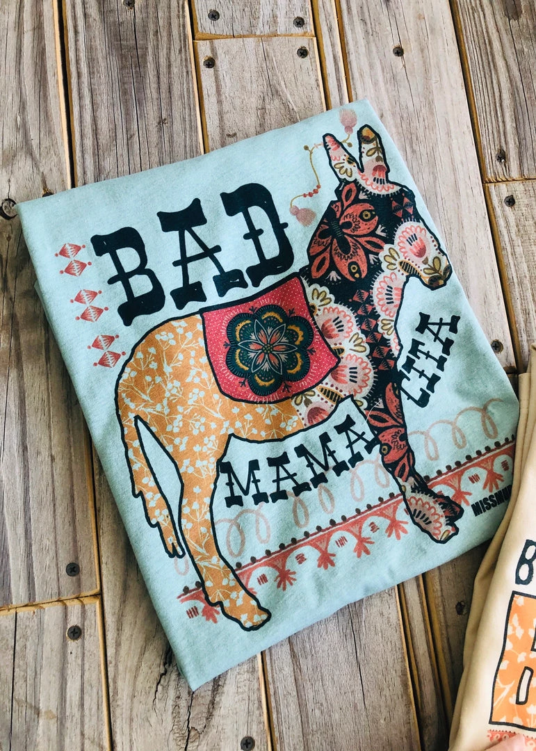 Heathered dusty blue colored boho bella canvas graphic tee with the graphic “BAD A** MAMACITA” Graphic features a boho donkey with words BAD MAMACITA above and under it. The donkey features a colorful boho design. So perfect for all our bad a** mamas! Pair with denim shorts and our Texas City Shoe in Black!