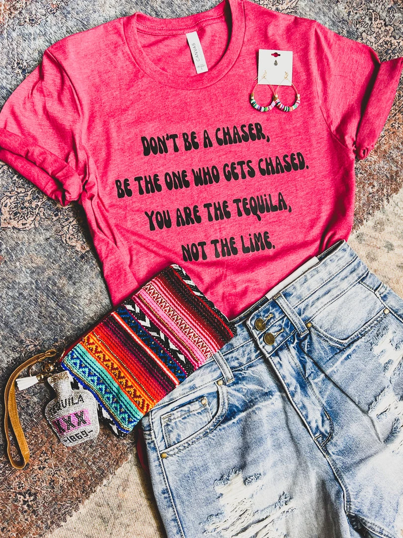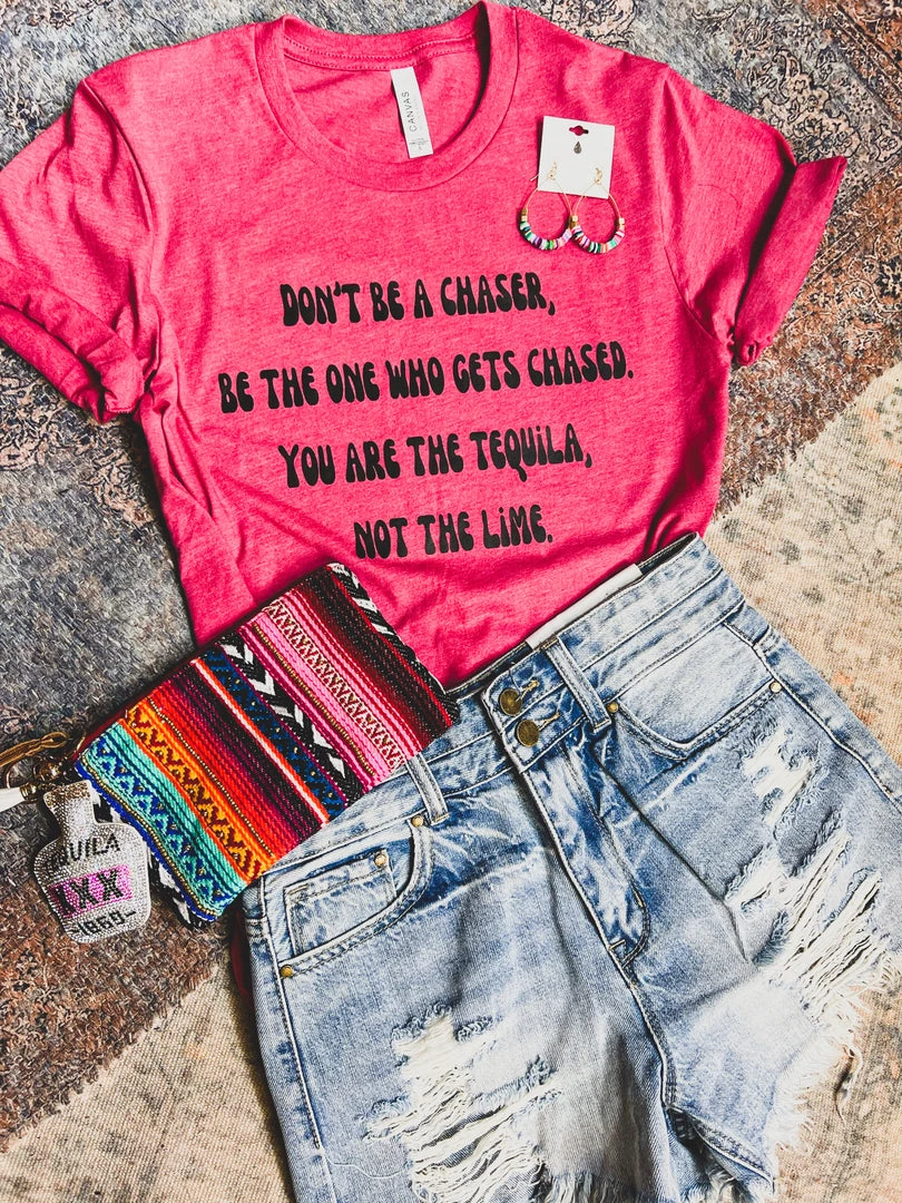 - Summertime “Don’t be a chaser, be the one who gets chased. You are the tequila, not the lime.” quote on a pink graphic tee