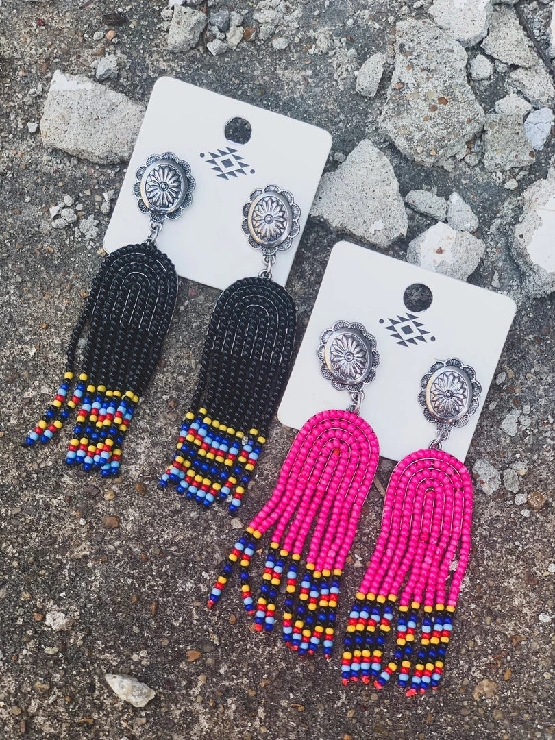 - Beaded dangle earring with beaded tassel fringe, fringe has colors of yellow, blue, and red