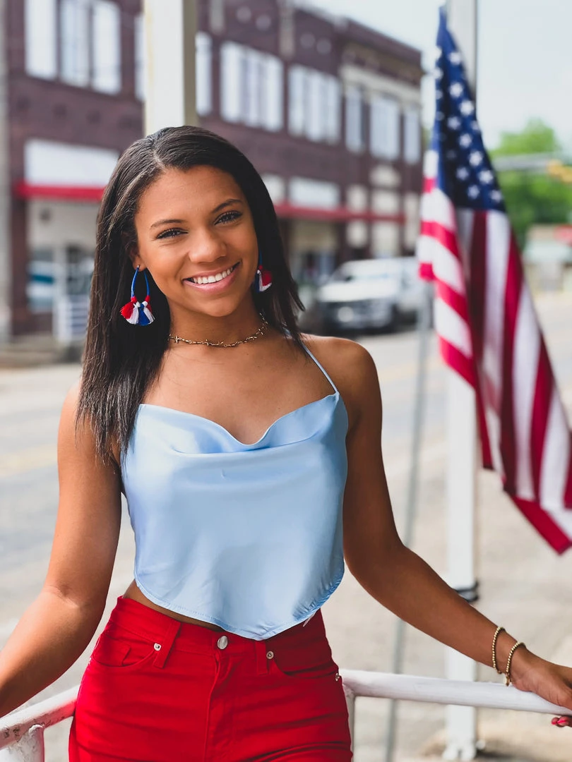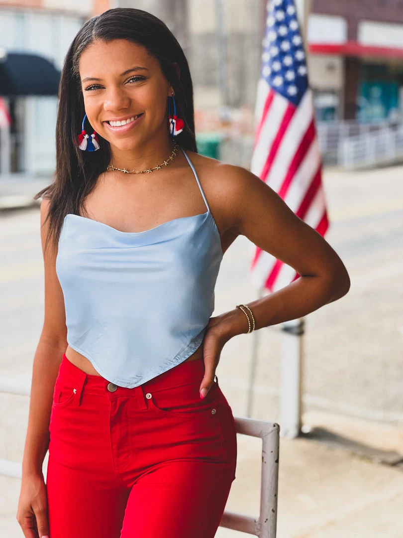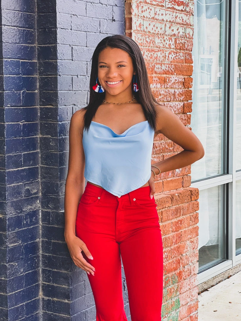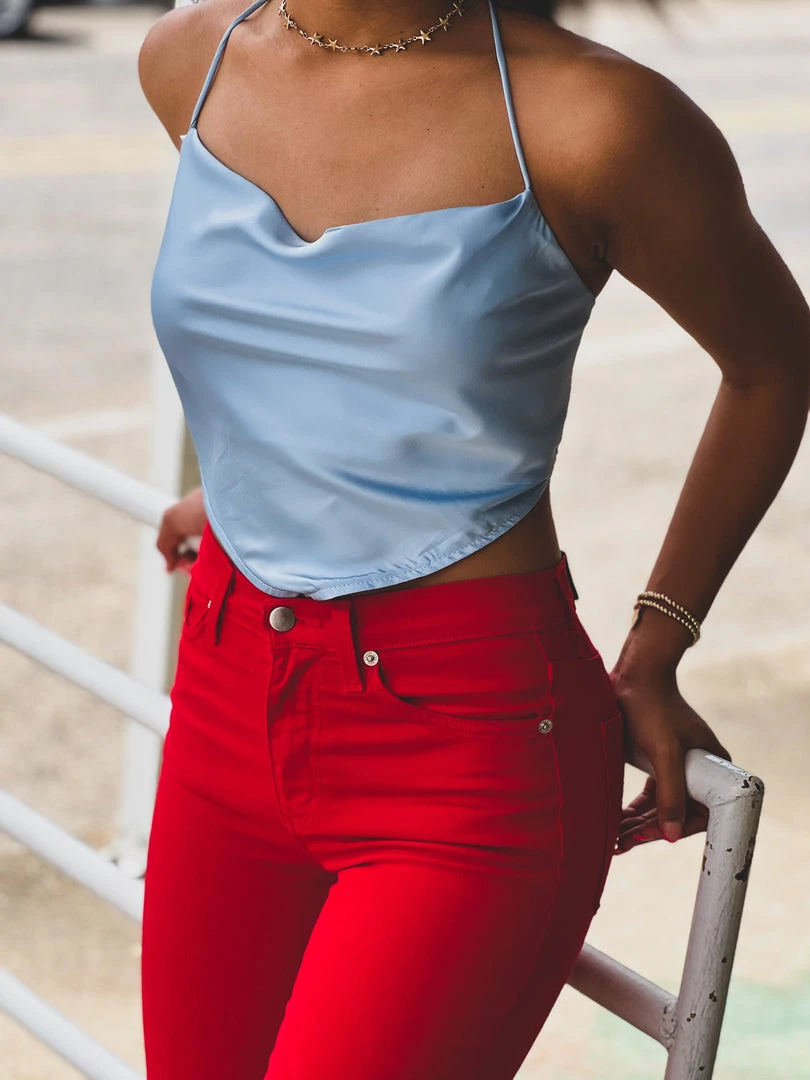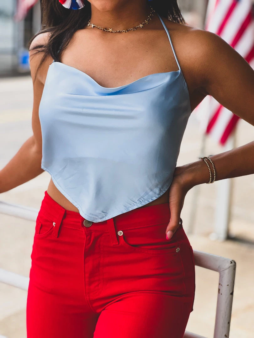 - Effortless pull on style with adjustable self tie back and neck, open back, pointed unique hemline, cowl style neckline, cropped length
