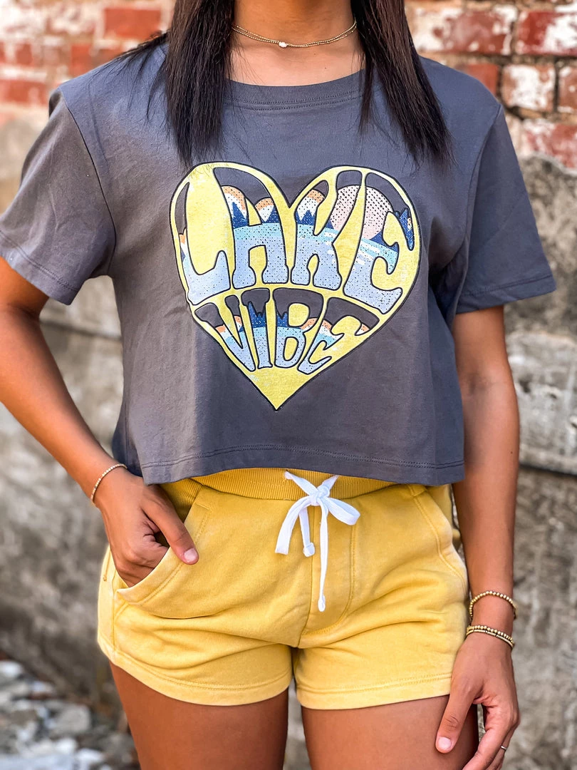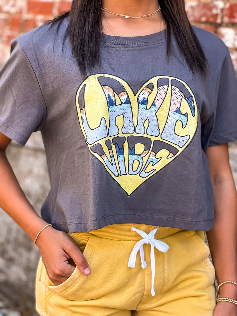 - Retro vintage “Lake Vibe” quote on a cropped gray graphic tee