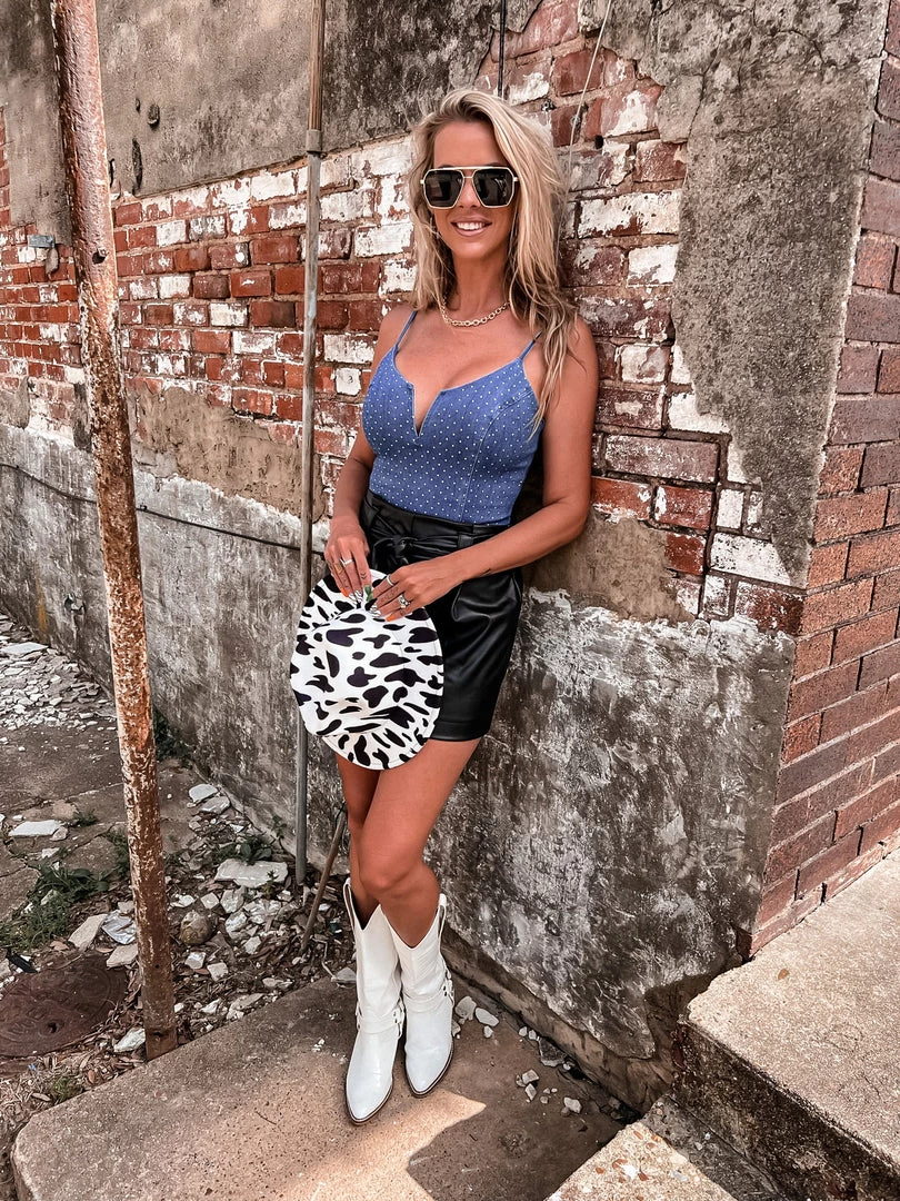 - Show stopping rhinestone denim bodysuit
