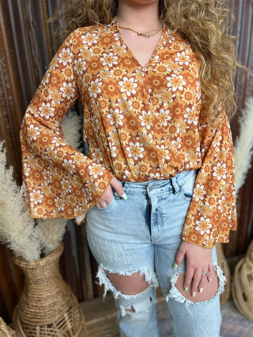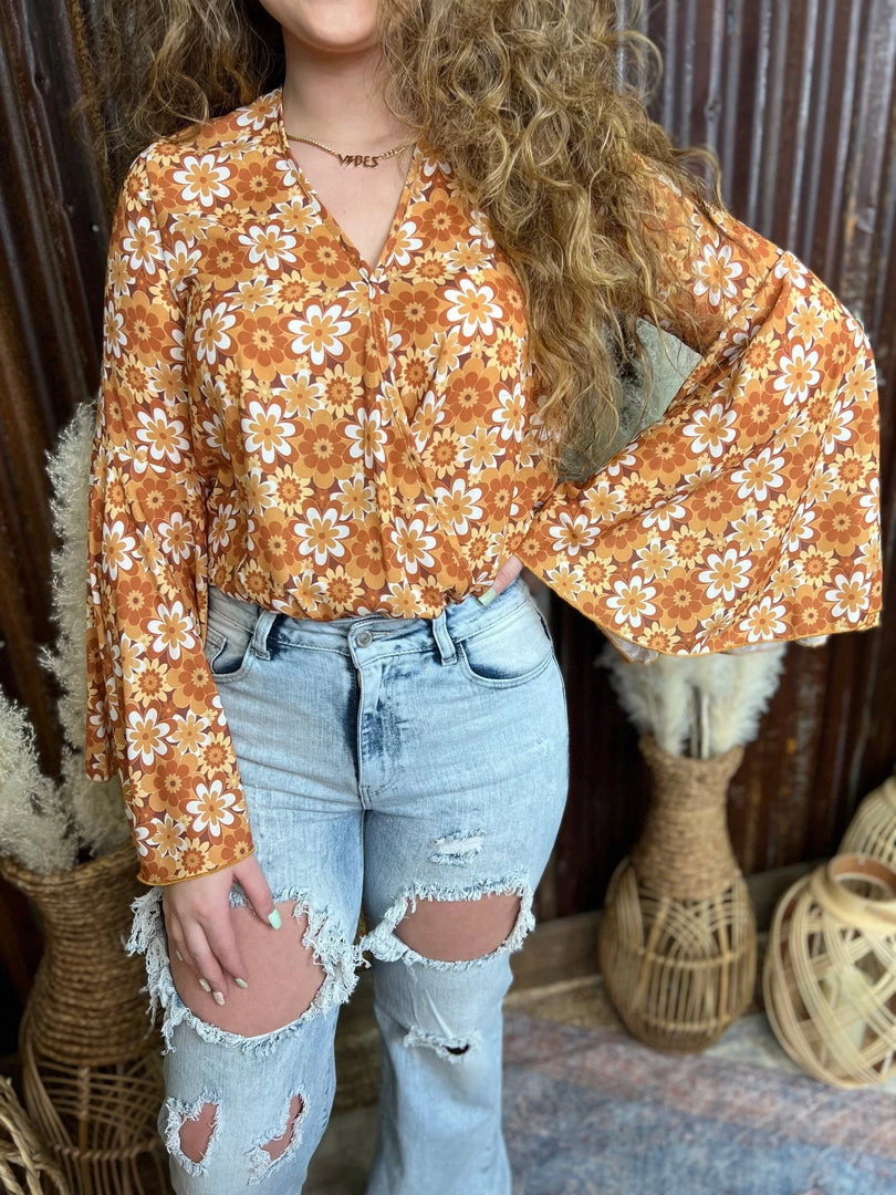 - Split V-neckline, mustard retro floral pattern, bell sleeves, open back with a self tie detail, and traditional button snap closure