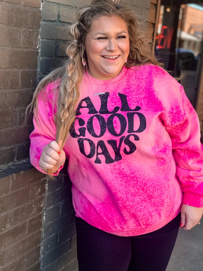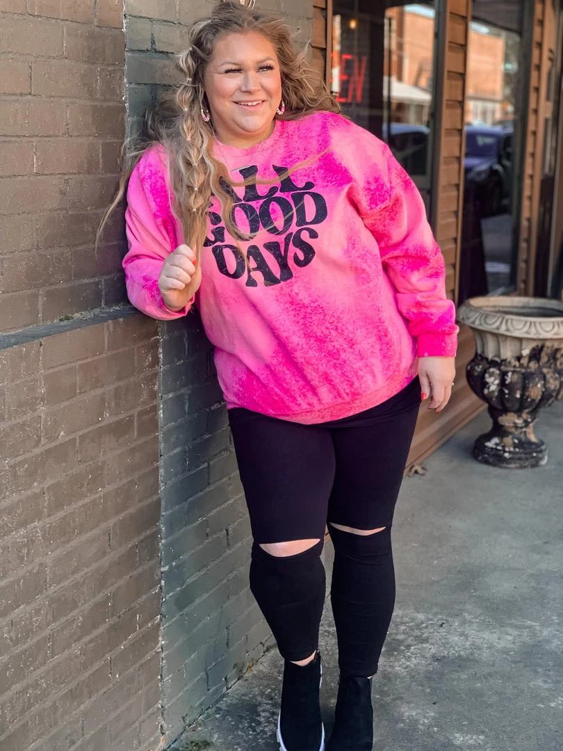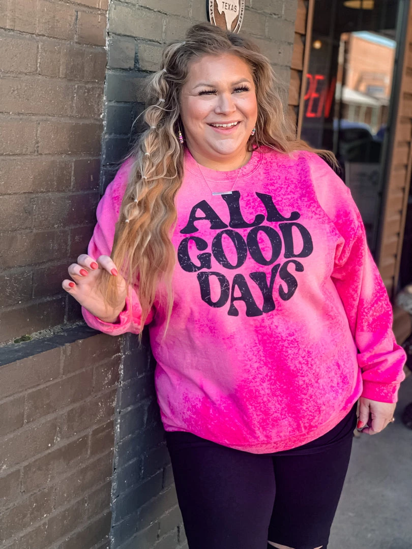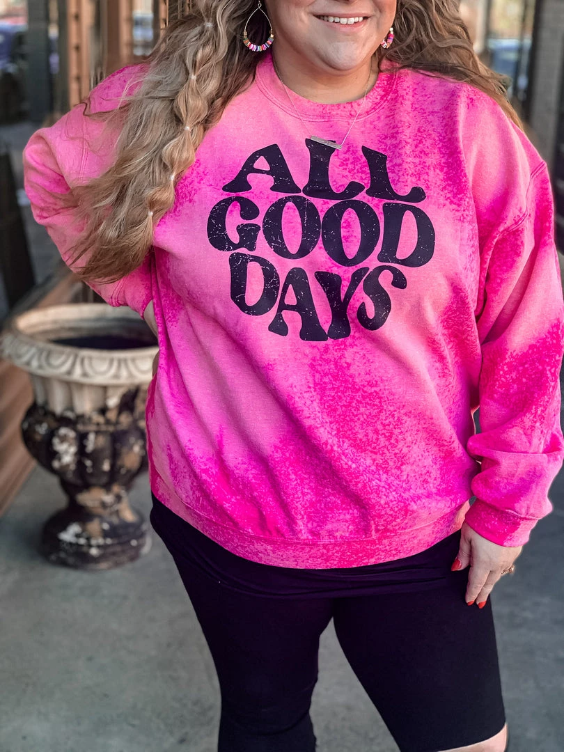 - Hand bleached pre-washed hot pink “All Good Days” sweatshirt. “All Good Days” graphic is distressed.