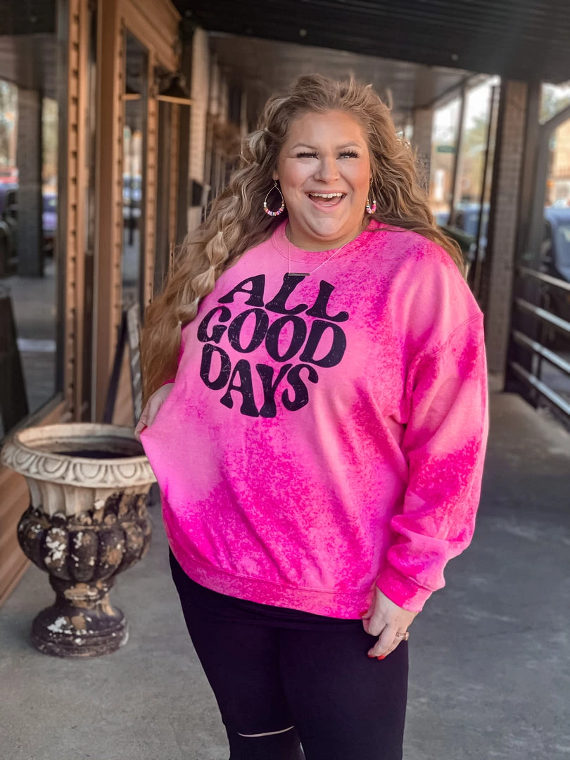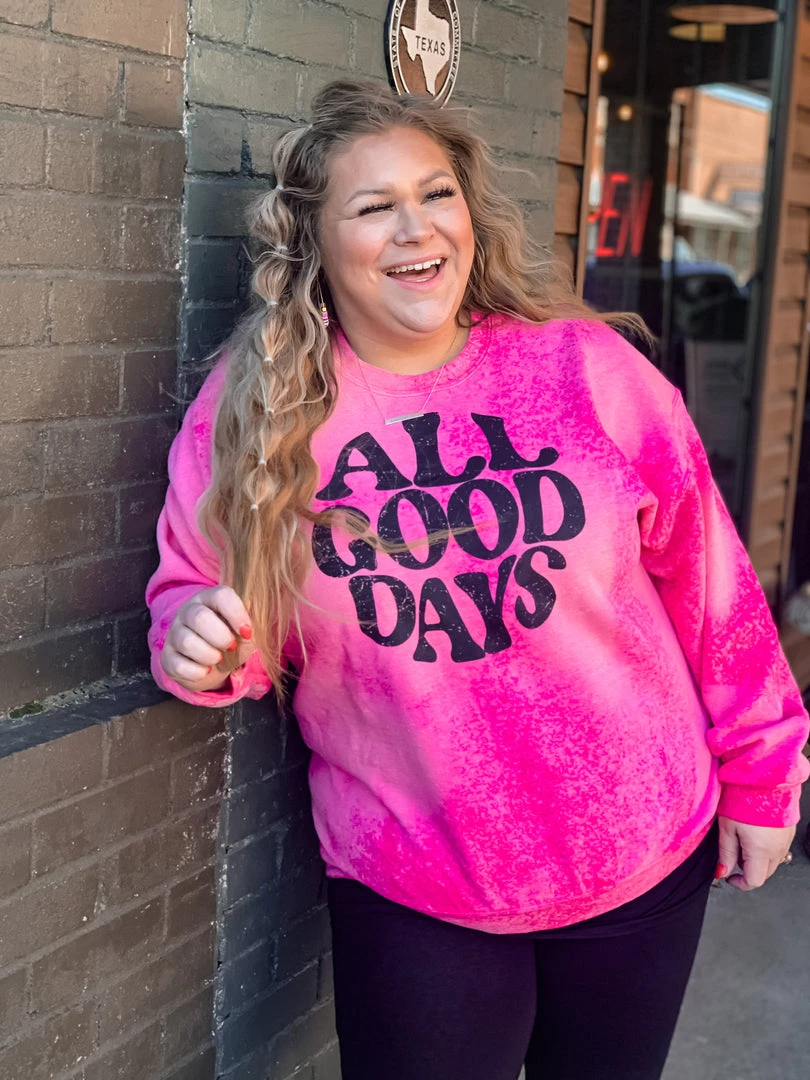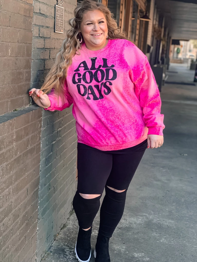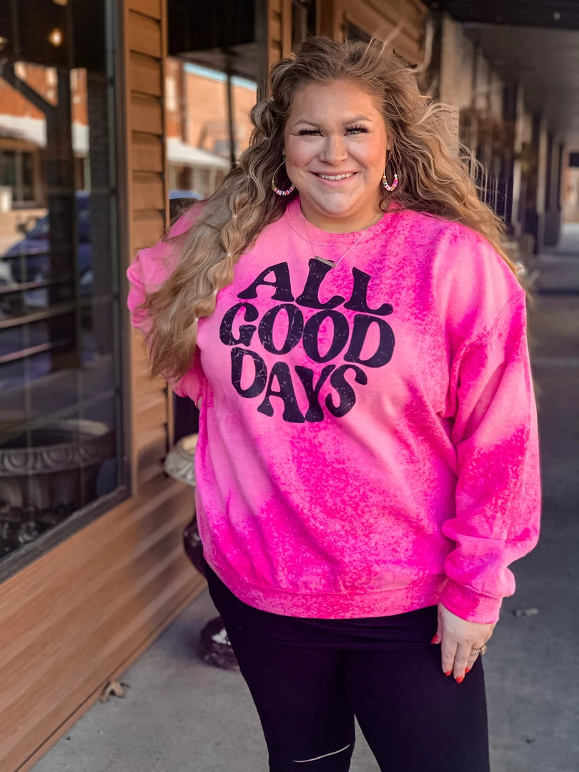 - Hand bleached pre-washed hot pink “All Good Days” sweatshirt. “All Good Days” graphic is distressed.