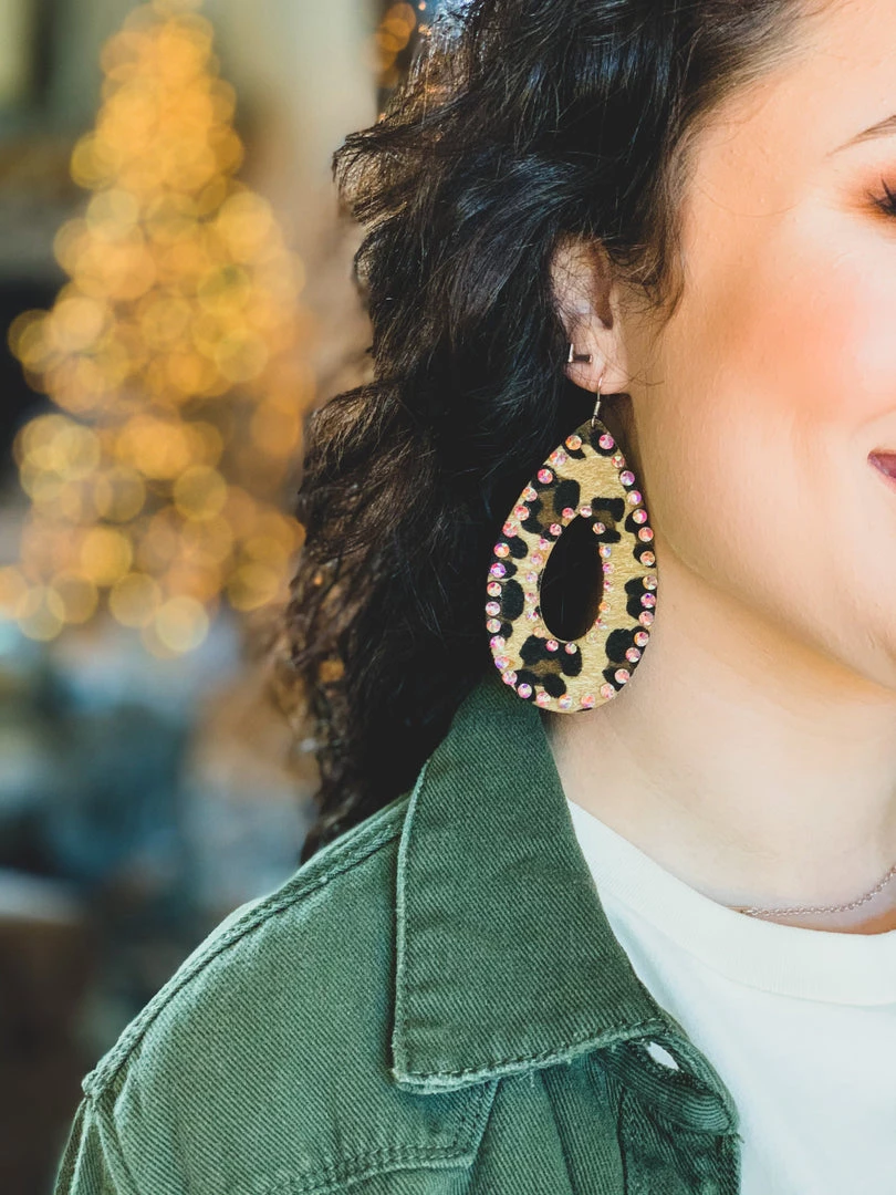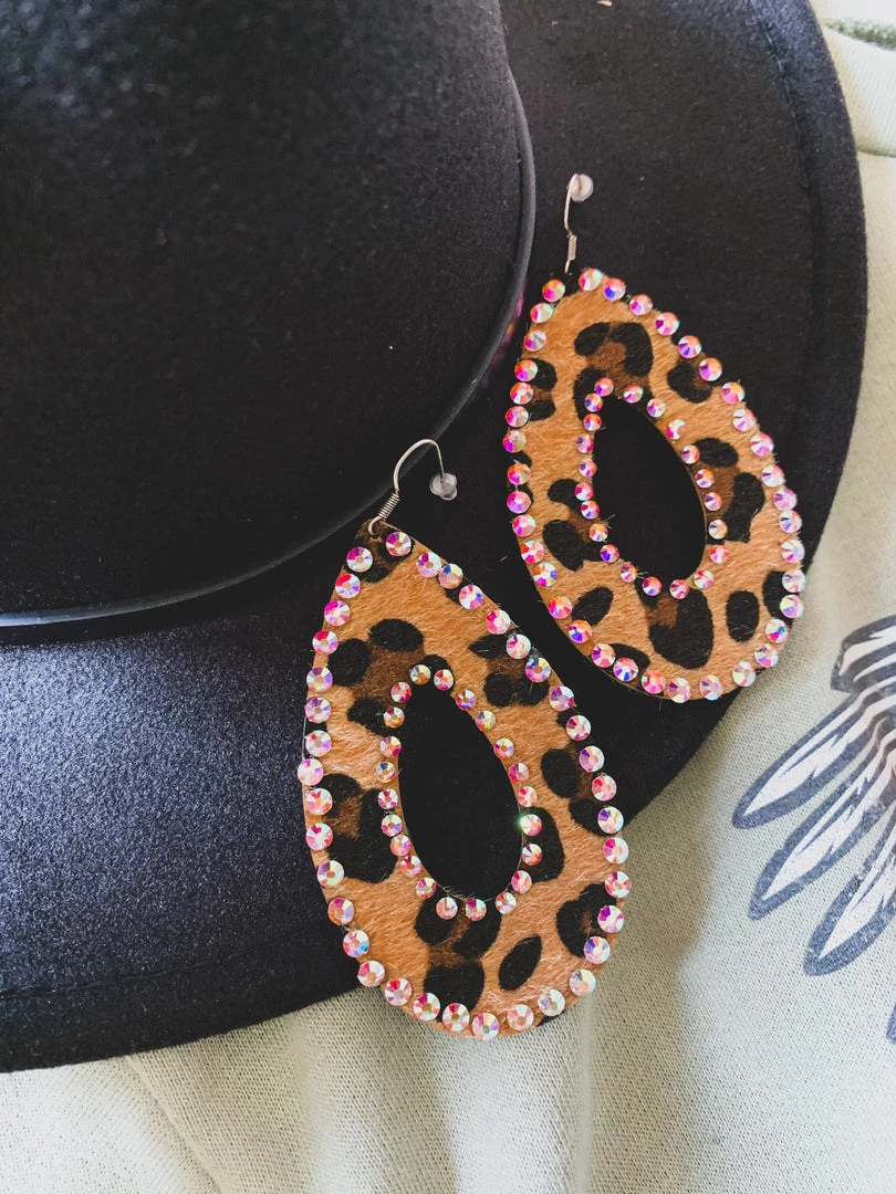 Leather leopard cowhide rhinestone teardrop shape earrings are light weight and oh so cute. Earrings feature leopard print, teardrop shape, a hollowed out center, and iridescent rhinestone borders. Perfect pop of leopard print for all your outfits!