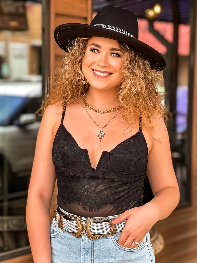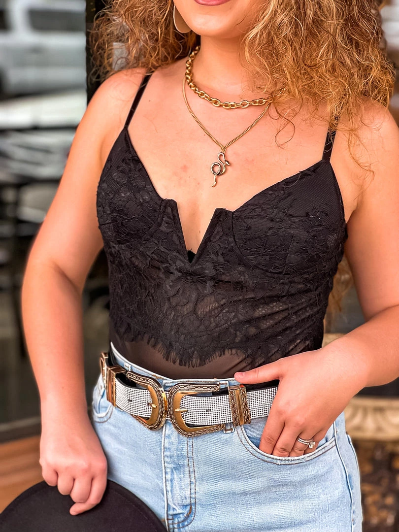 - Black lace and mesh fabric, padded bust, plunge v-neckline, mesh back, adjustable spaghetti straps, traditional bodysuit closure with a cheeky cut