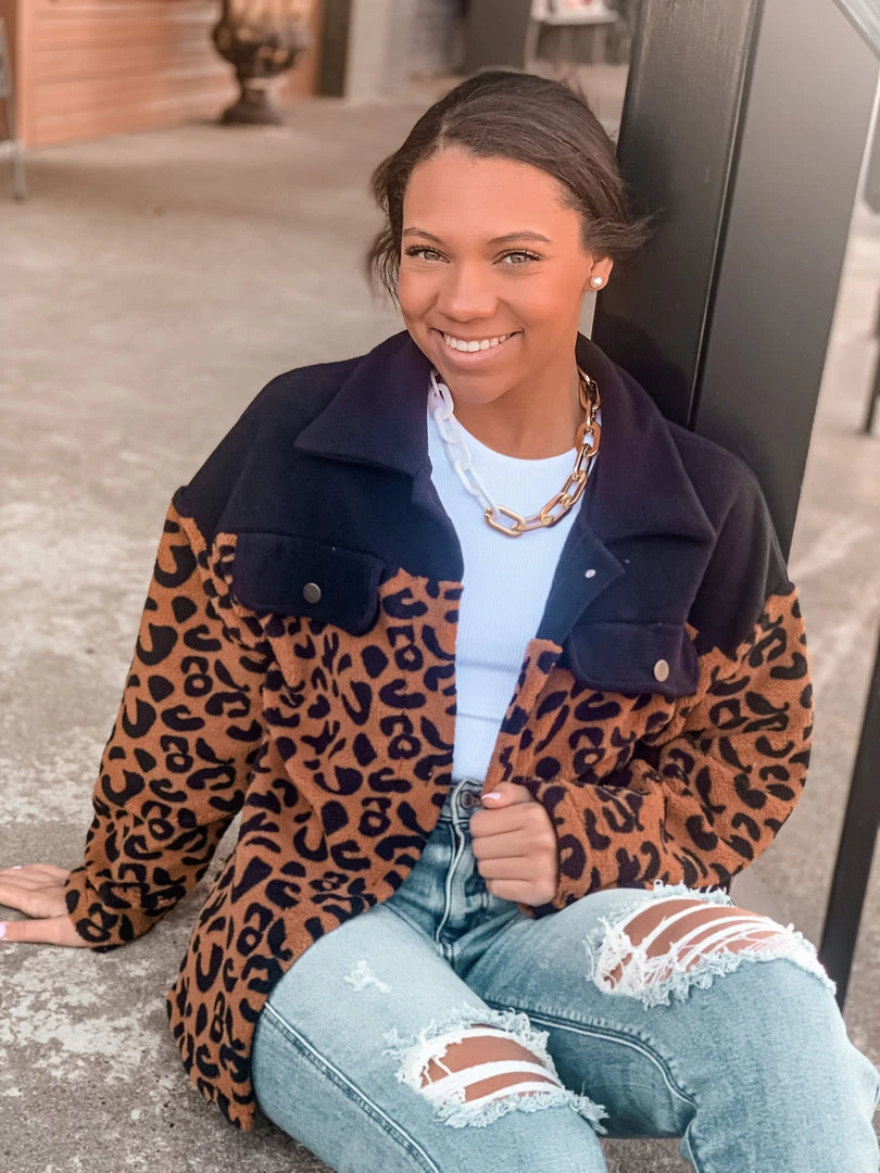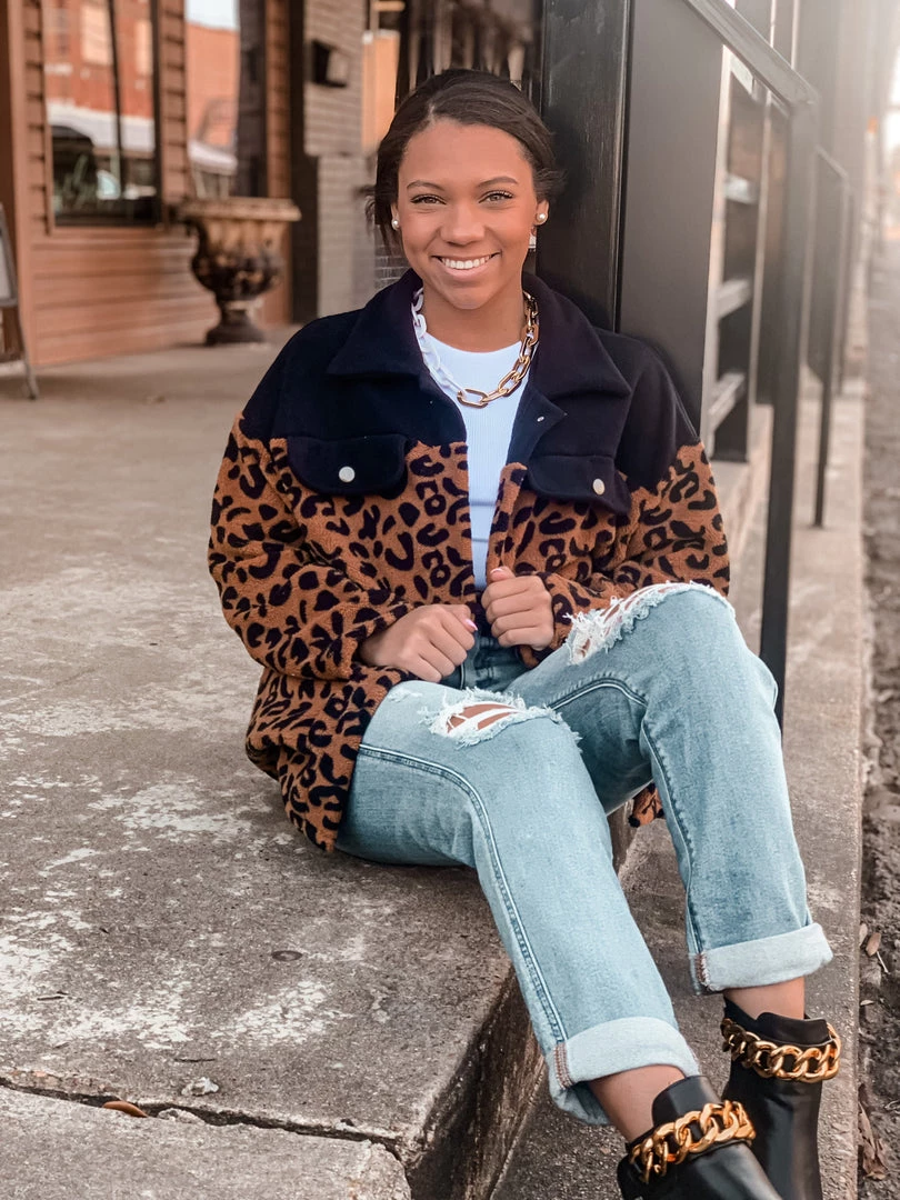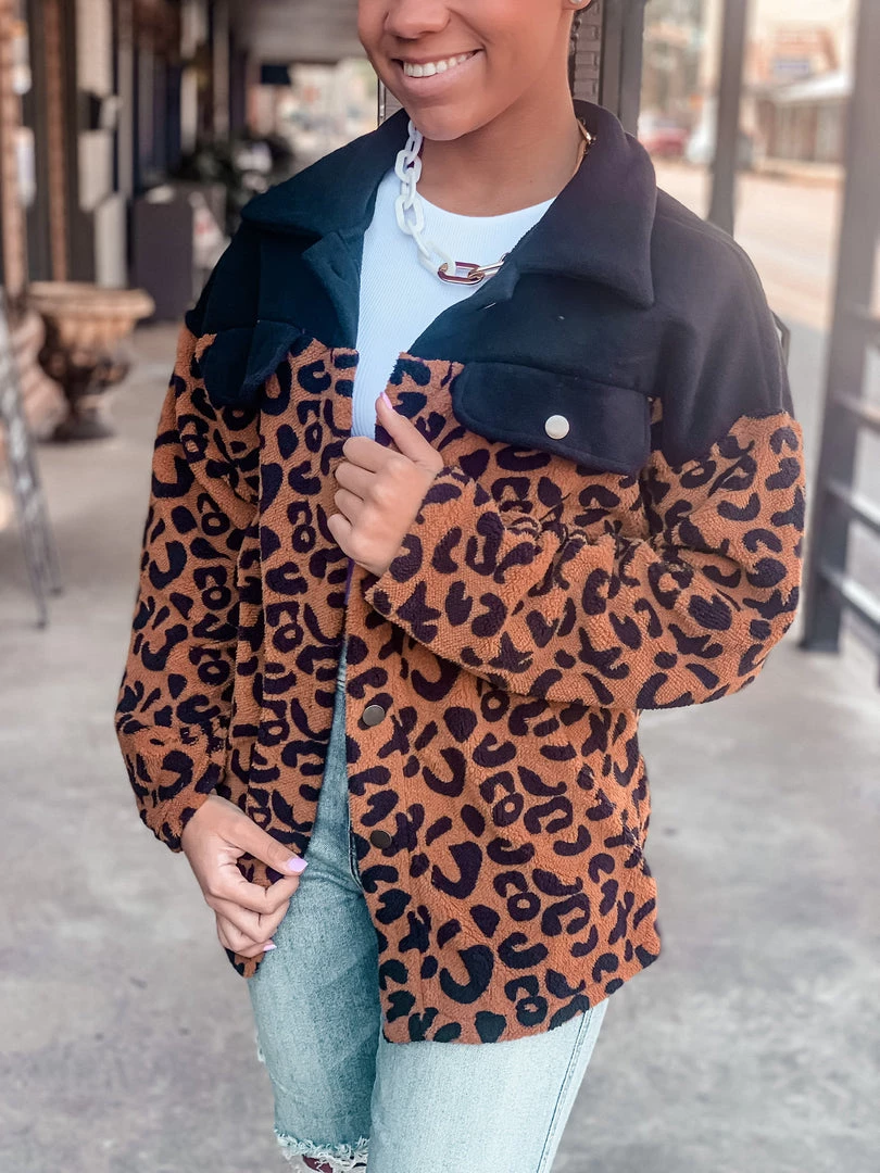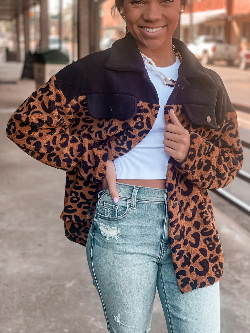 The coziest leopard print color block Shacket is a Winter season must! Features a black and leopard print color block style, leopard print super soft sherpa fabric with a black collar, button front closure, leopard print long sleeves, and faux chest pocket detail. Perfect to pair over your favorite bodysuits and crop tops for the Holiday season!