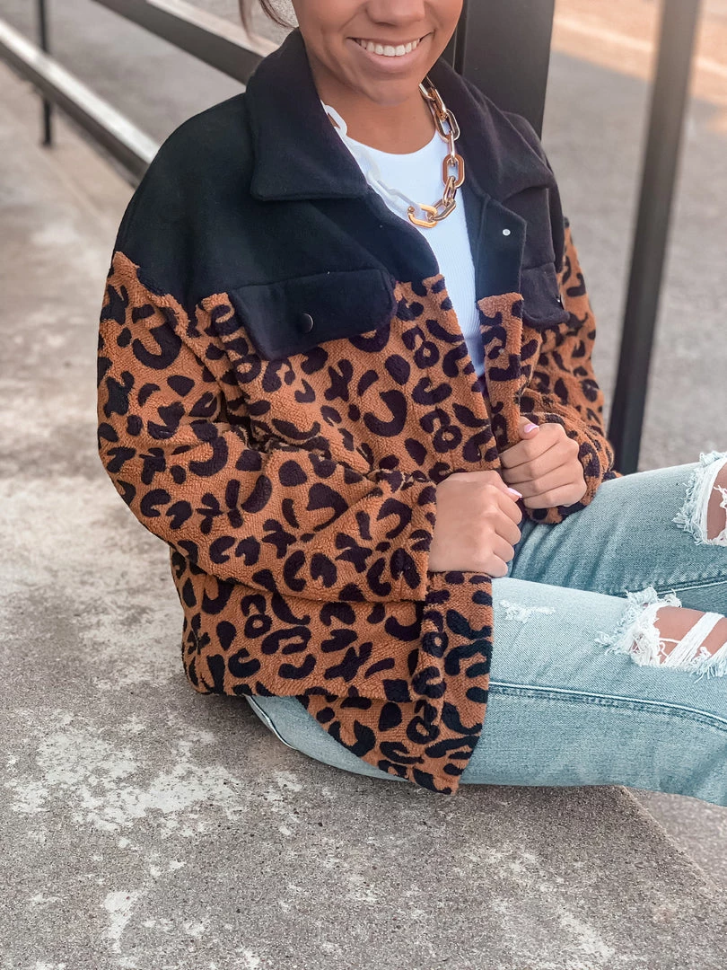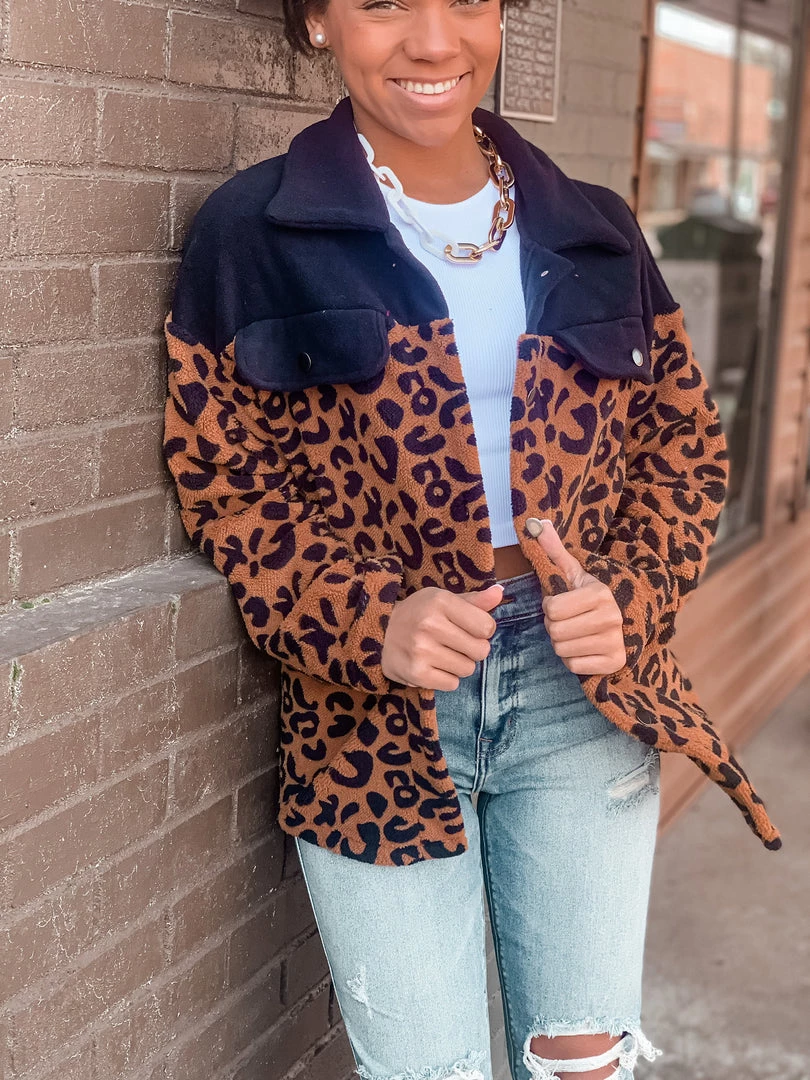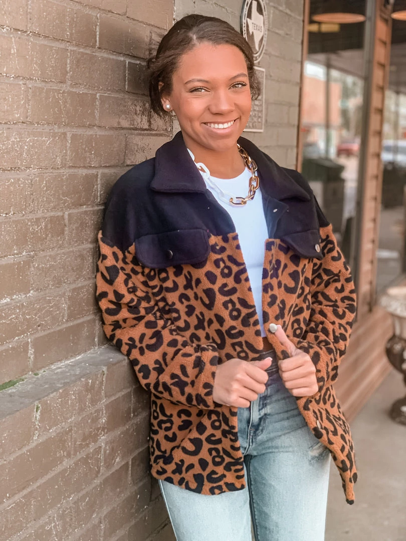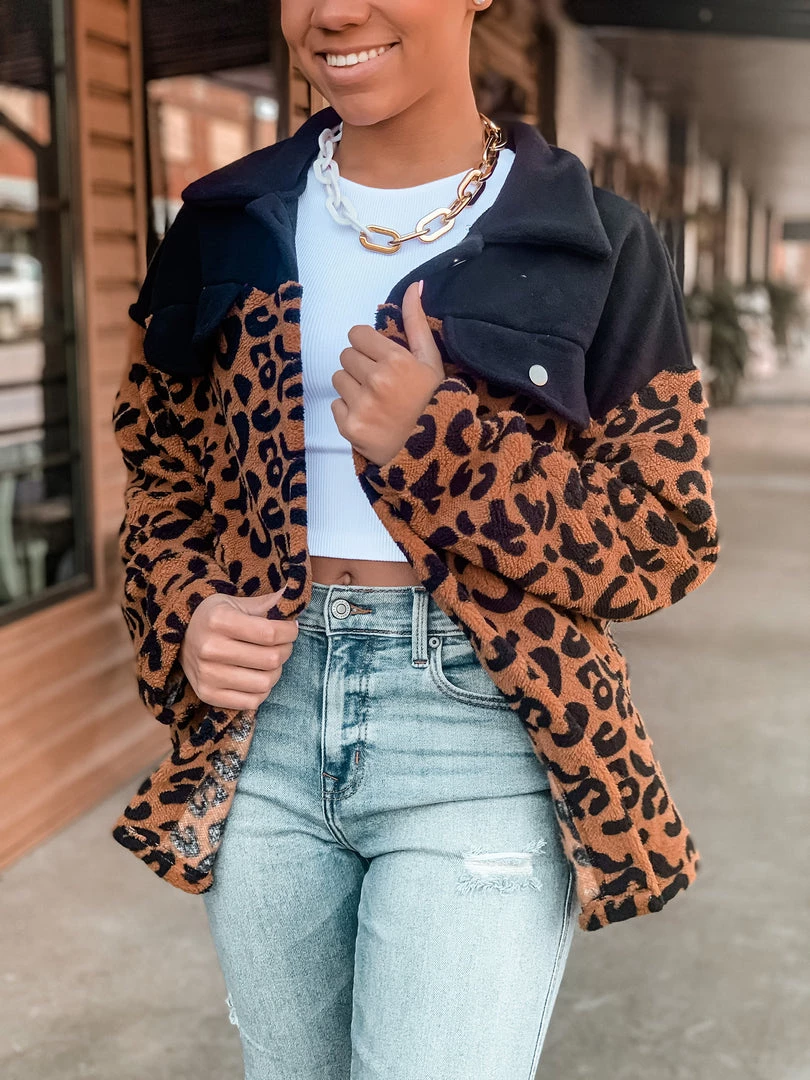 The coziest leopard print color block Shacket is a Winter season must! Features a black and leopard print color block style, leopard print super soft sherpa fabric with a black collar, button front closure, leopard print long sleeves, and faux chest pocket detail. Perfect to pair over your favorite bodysuits and crop tops for the Holiday season!
