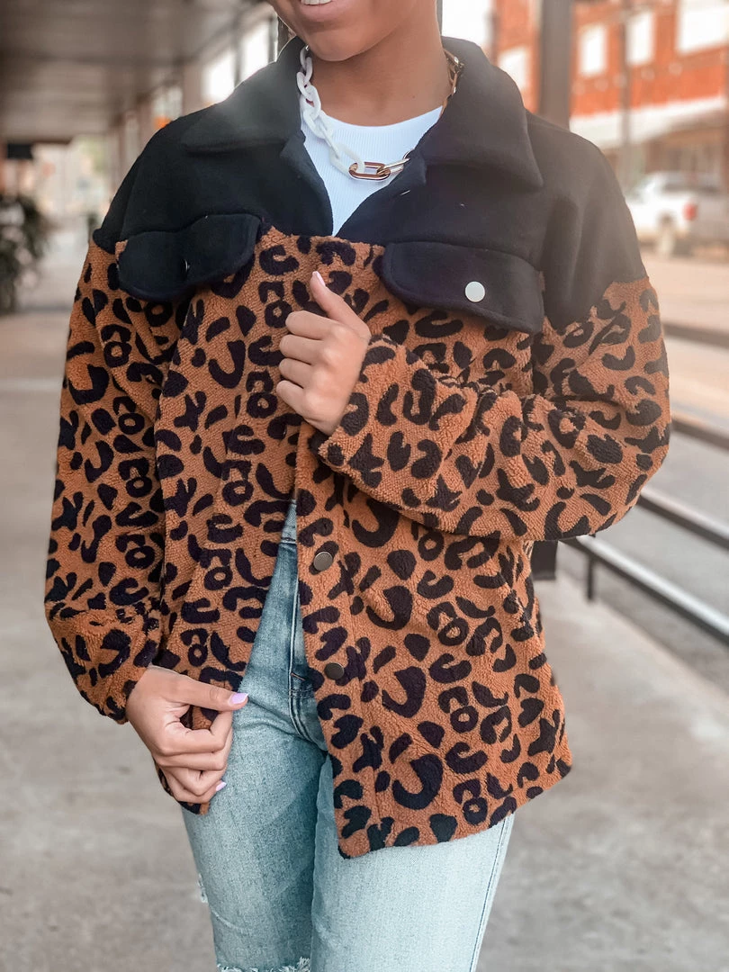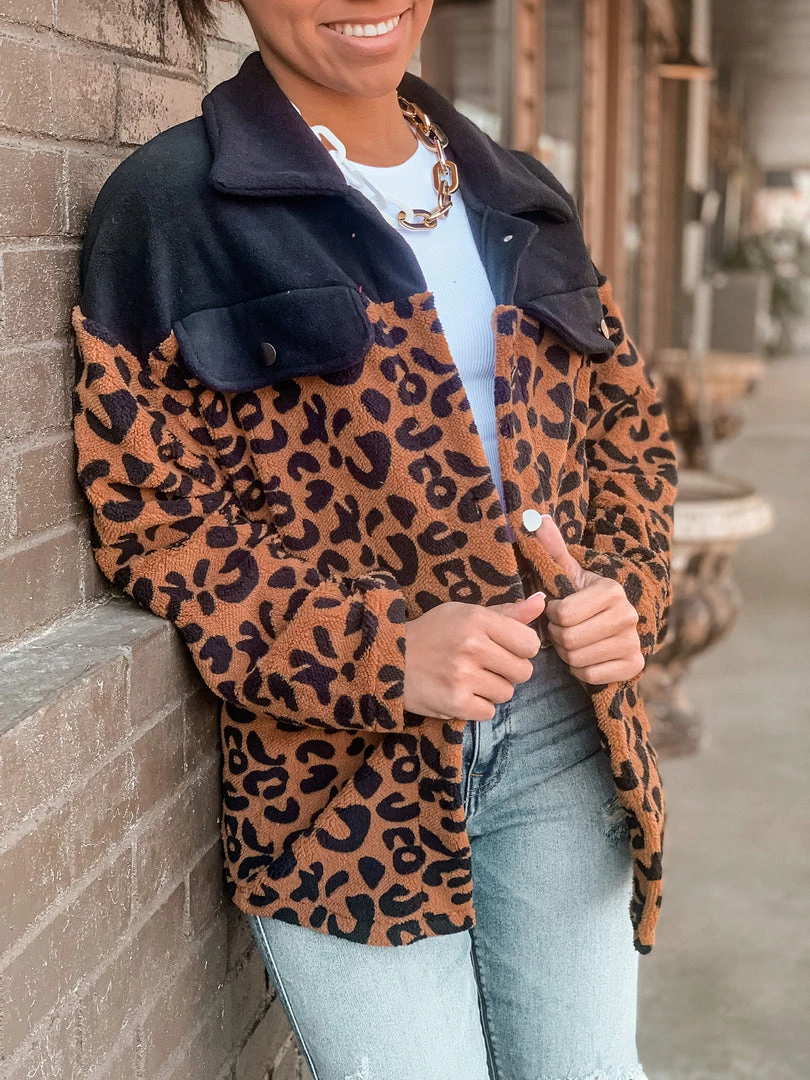 - Super soft leopard print and black color block jacket with button up front, long sleeves, and faux chest pocket detail.