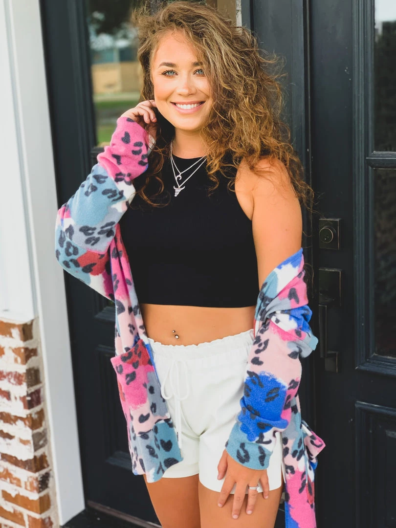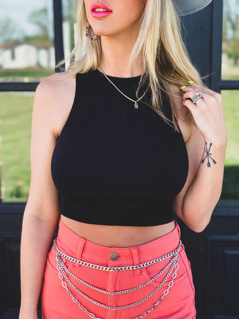 Black ribbed halter style neck tank crop top can easily be dressed up or go casual. Top features a super stretchy soft material, ribbed pattern, halter style neck, and is sleeveless. Top has a slight *CROPPED LENGTH* Top is one size! Super cute with all your shorts, joggers, and bell bottoms!