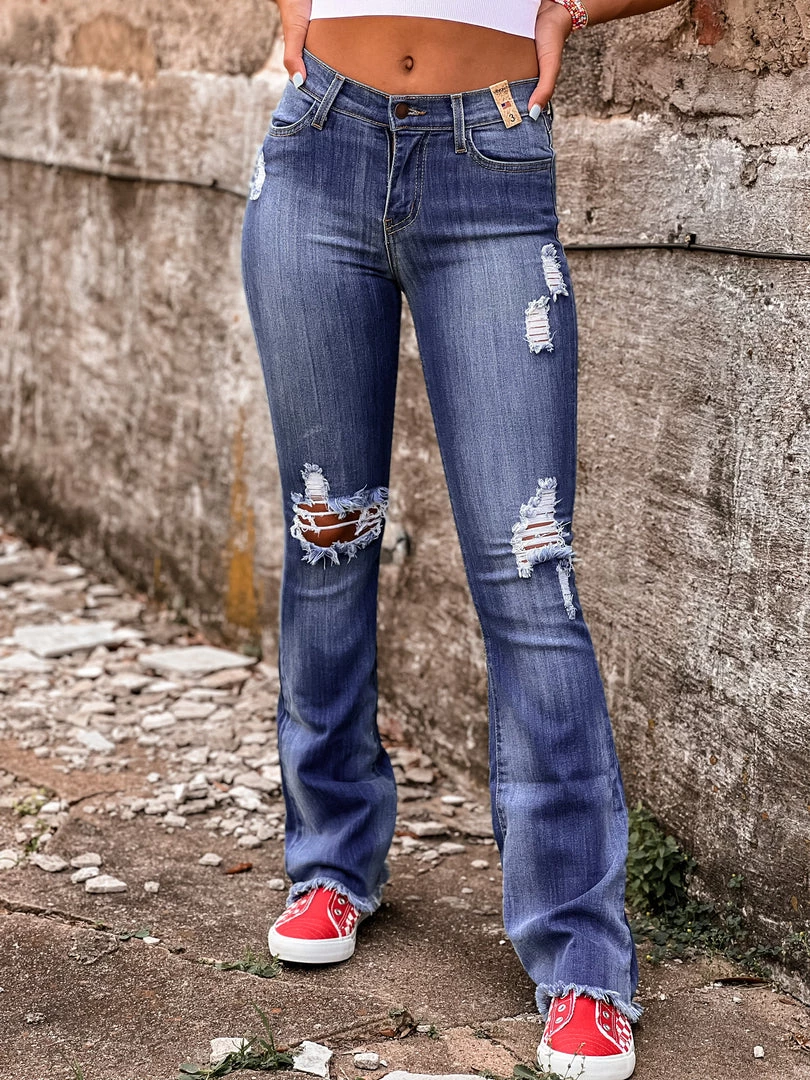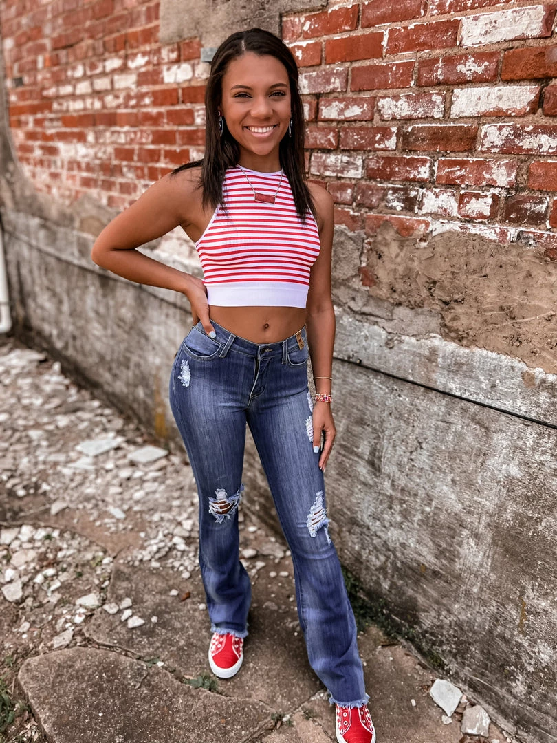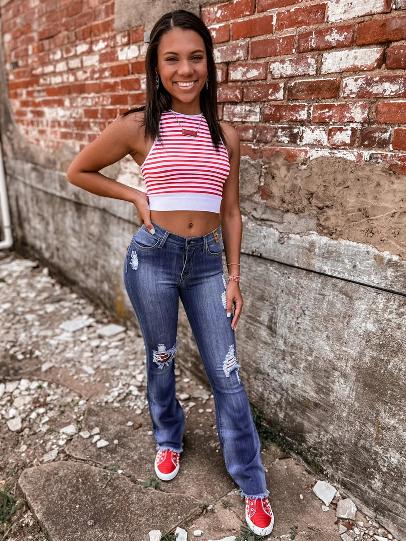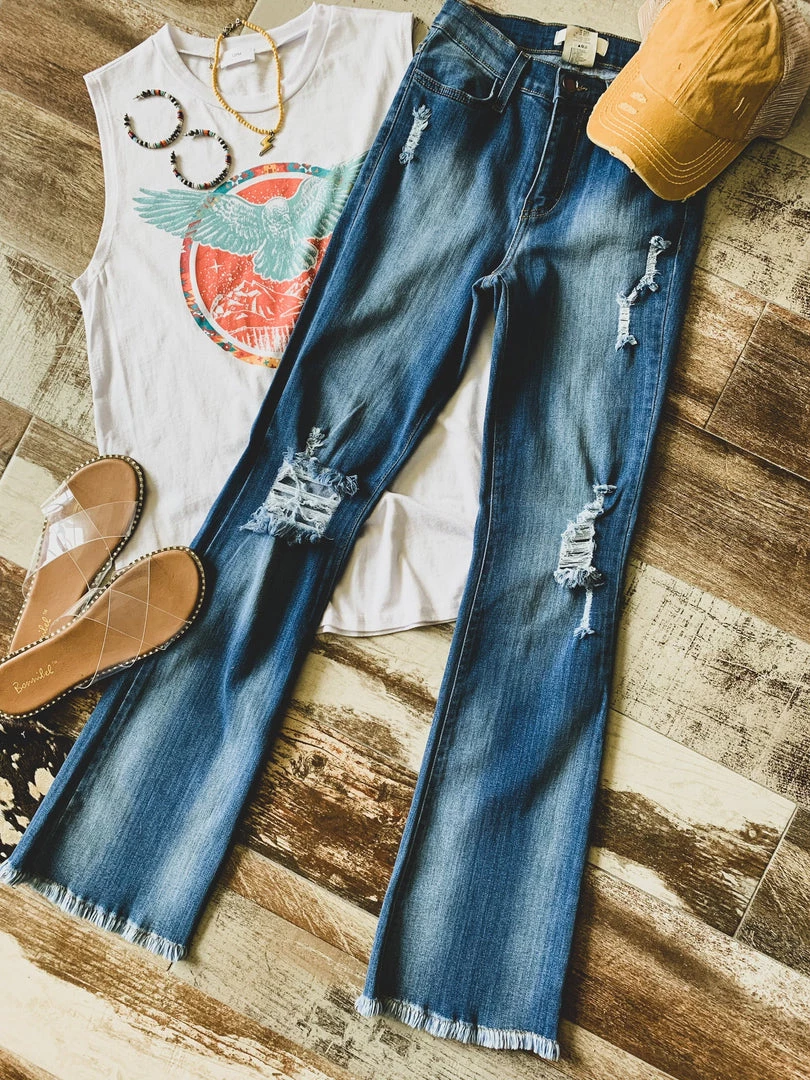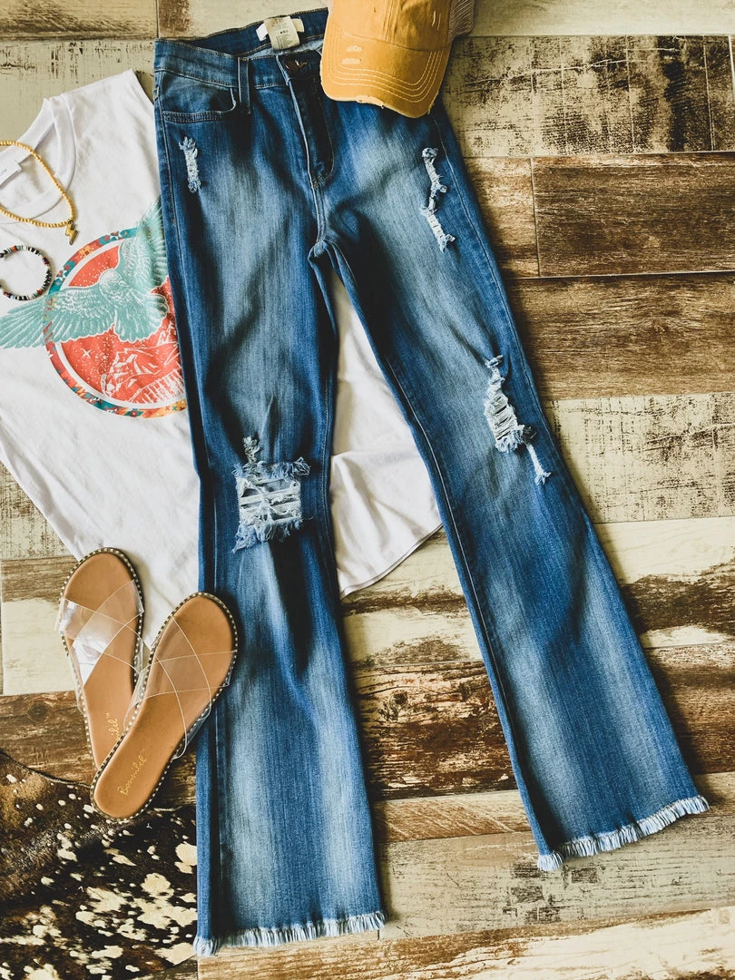 Retro distressed denim flares feature a stretchy fit, a high waist, thigh and knee distressing, traditional button and zipper closure, two front pockets, two back pockets, a cute slight flare, and a raw frayed hem. Such a cute pant for all your bodysuits and graphic tees.