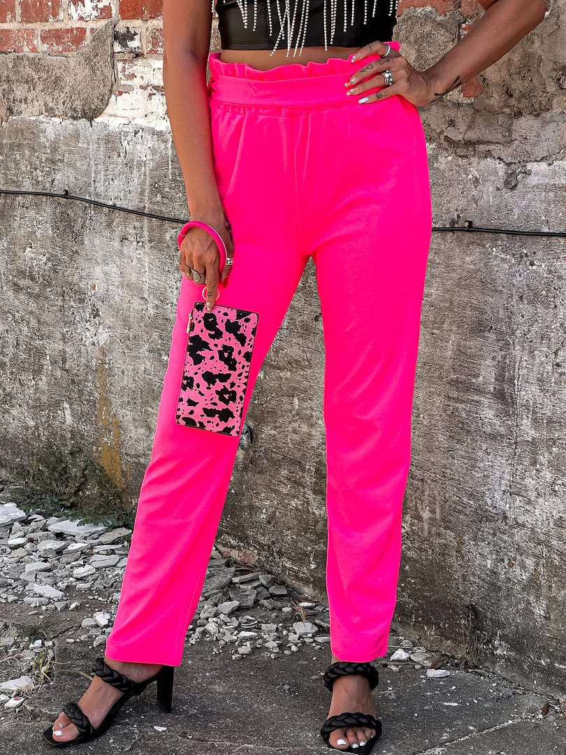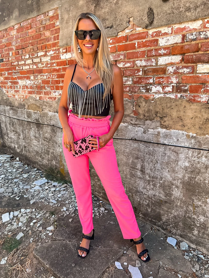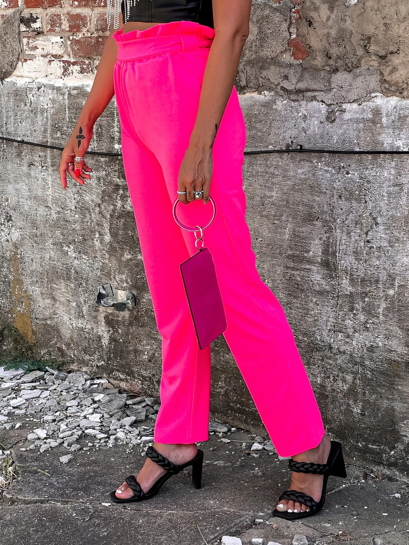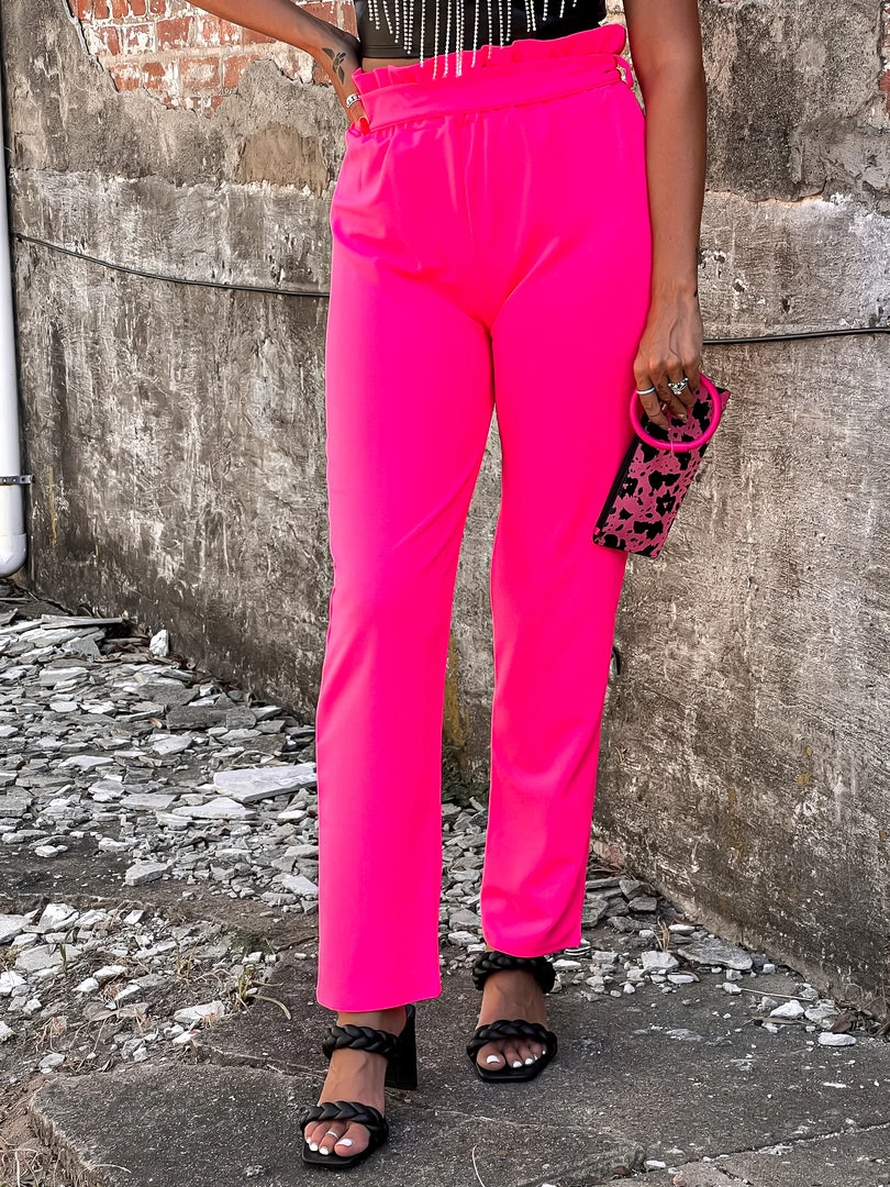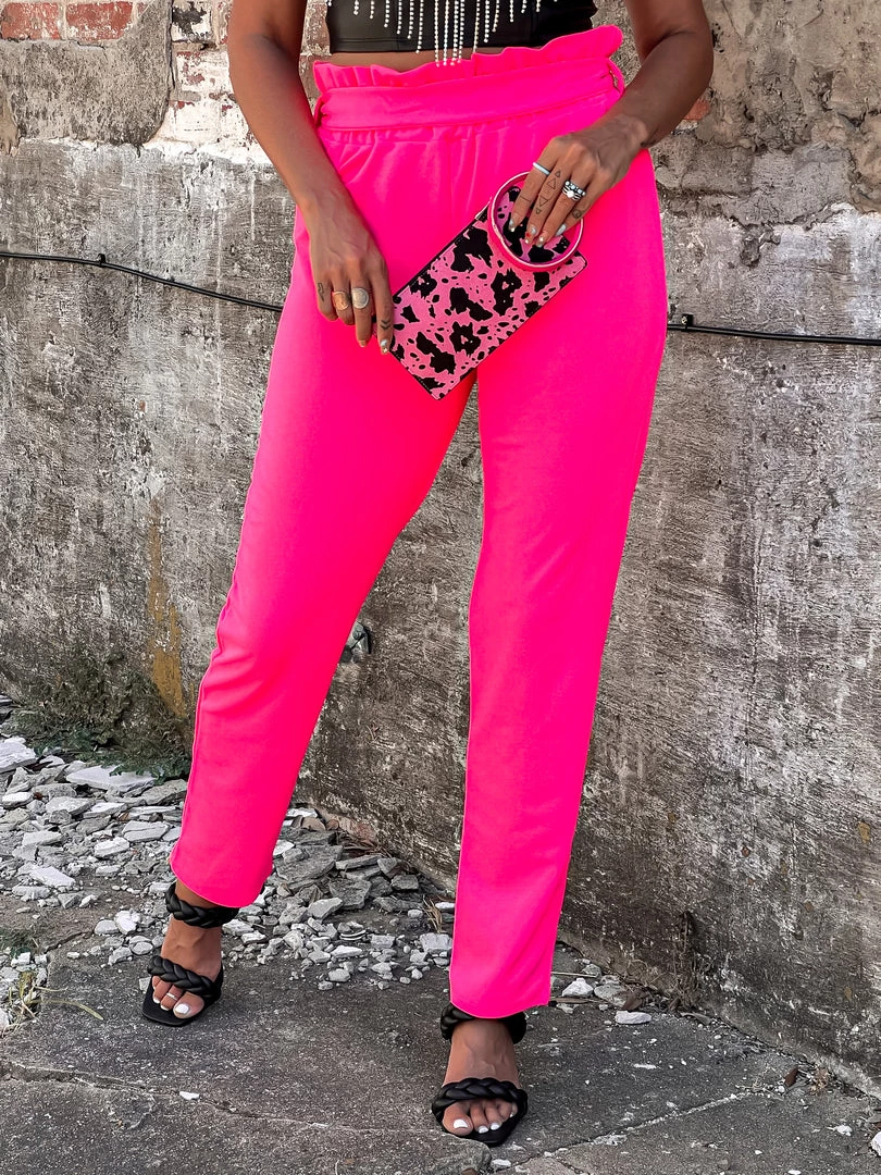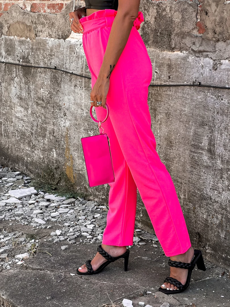 - Solid bright pink, paper bag style ruched waistband, elastic waistband with slip on style, self tie belt, straight leg pant