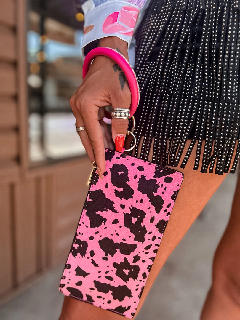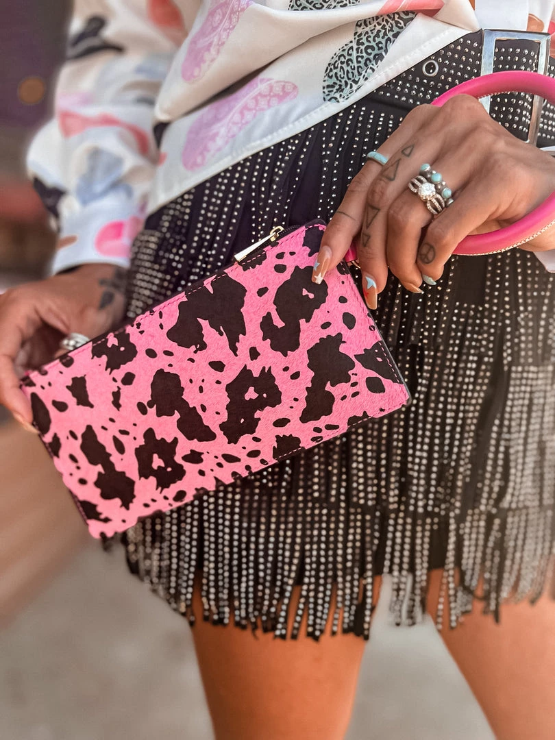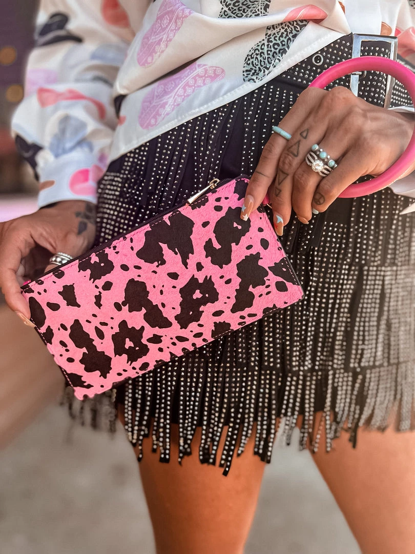 - Black and pink cow print pattern, cowhide front, pink leather back