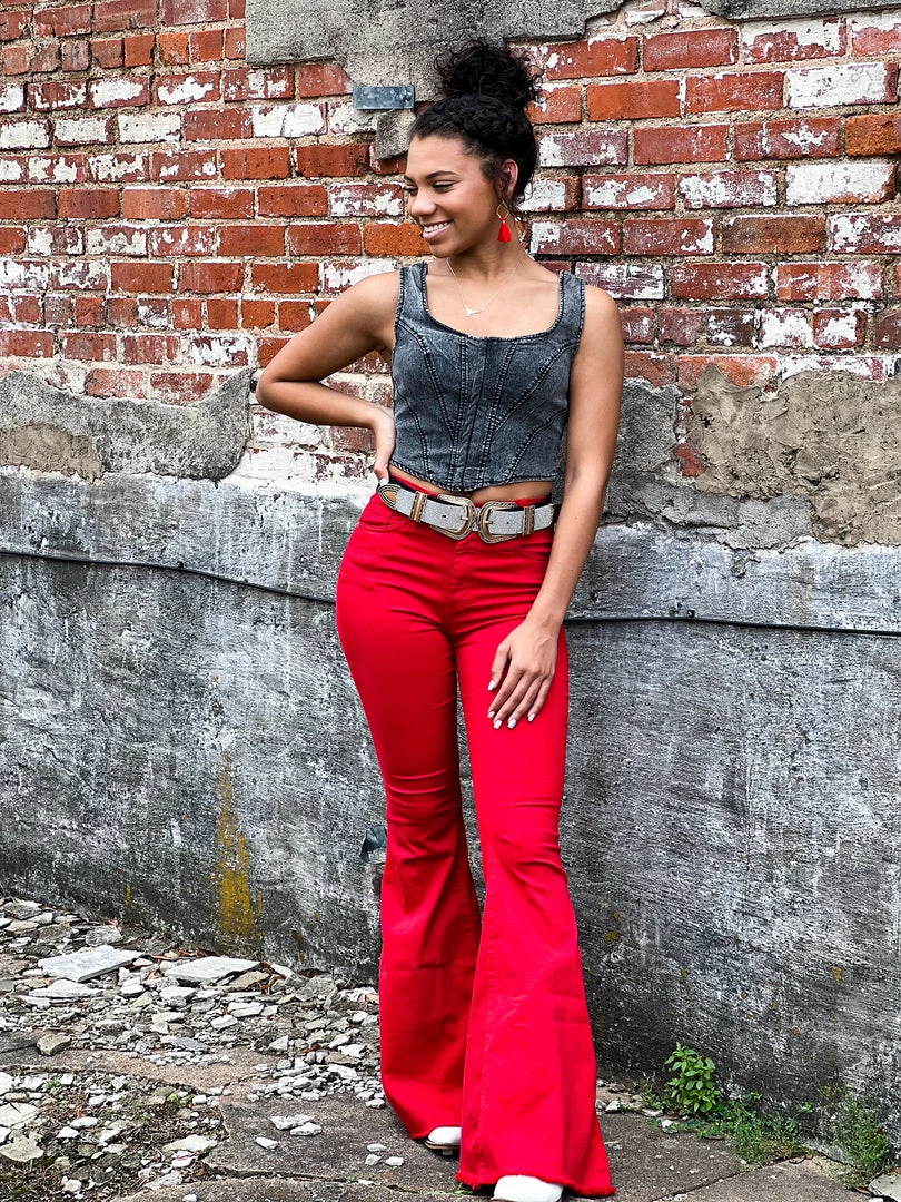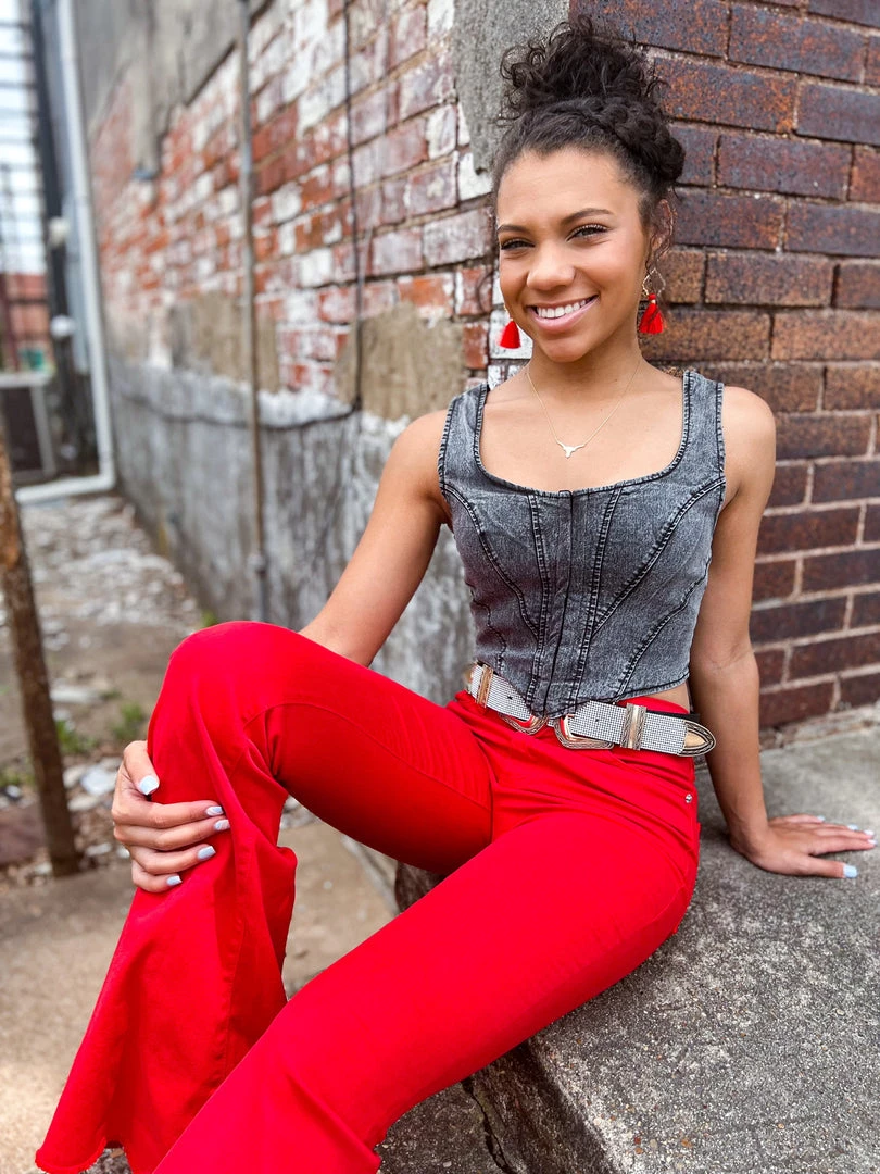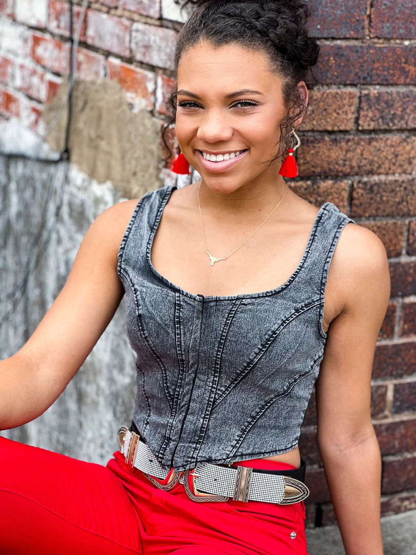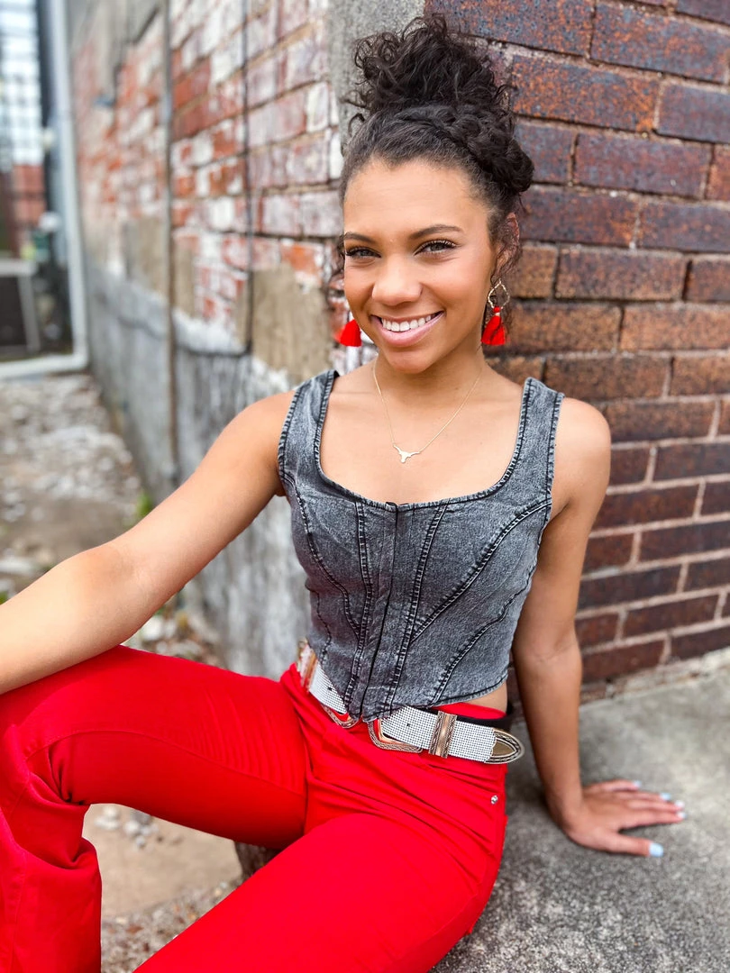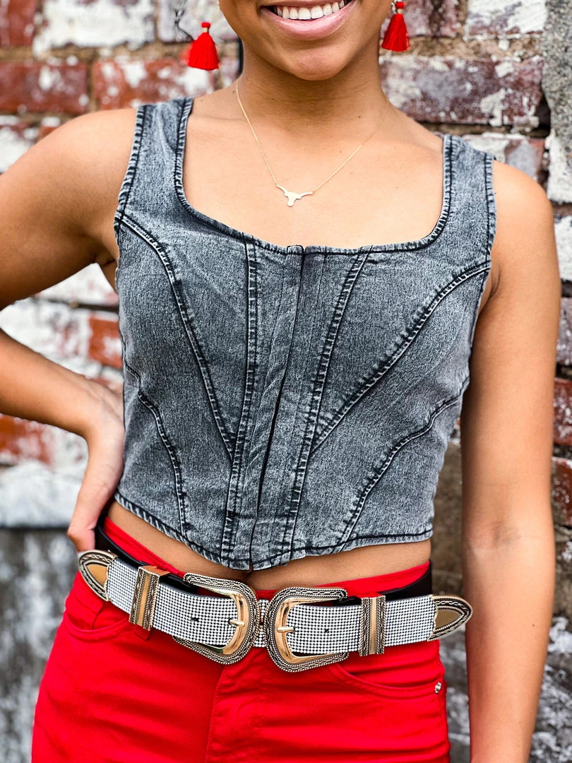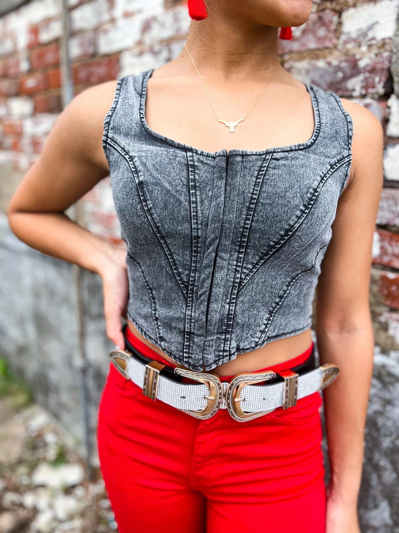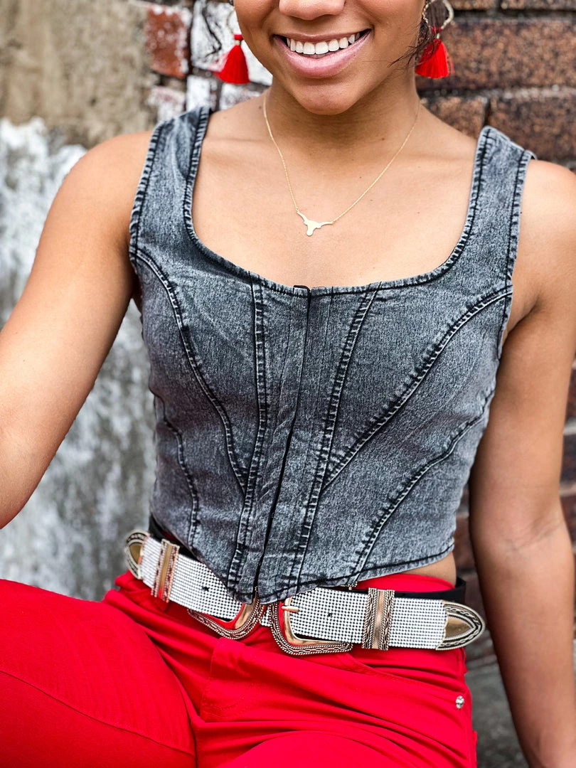 - Black acid wash denim, thick shoulder straps, corset style, cropped length, exposed seams