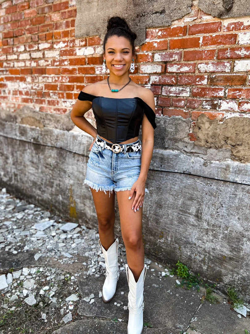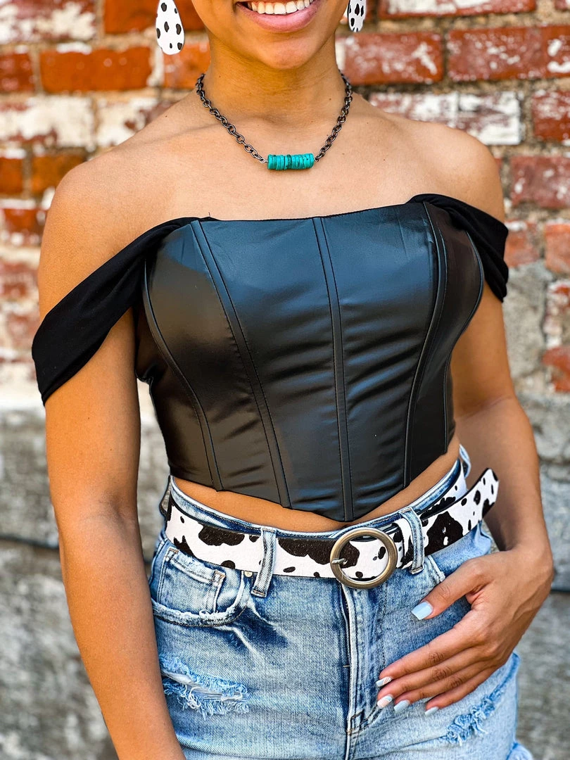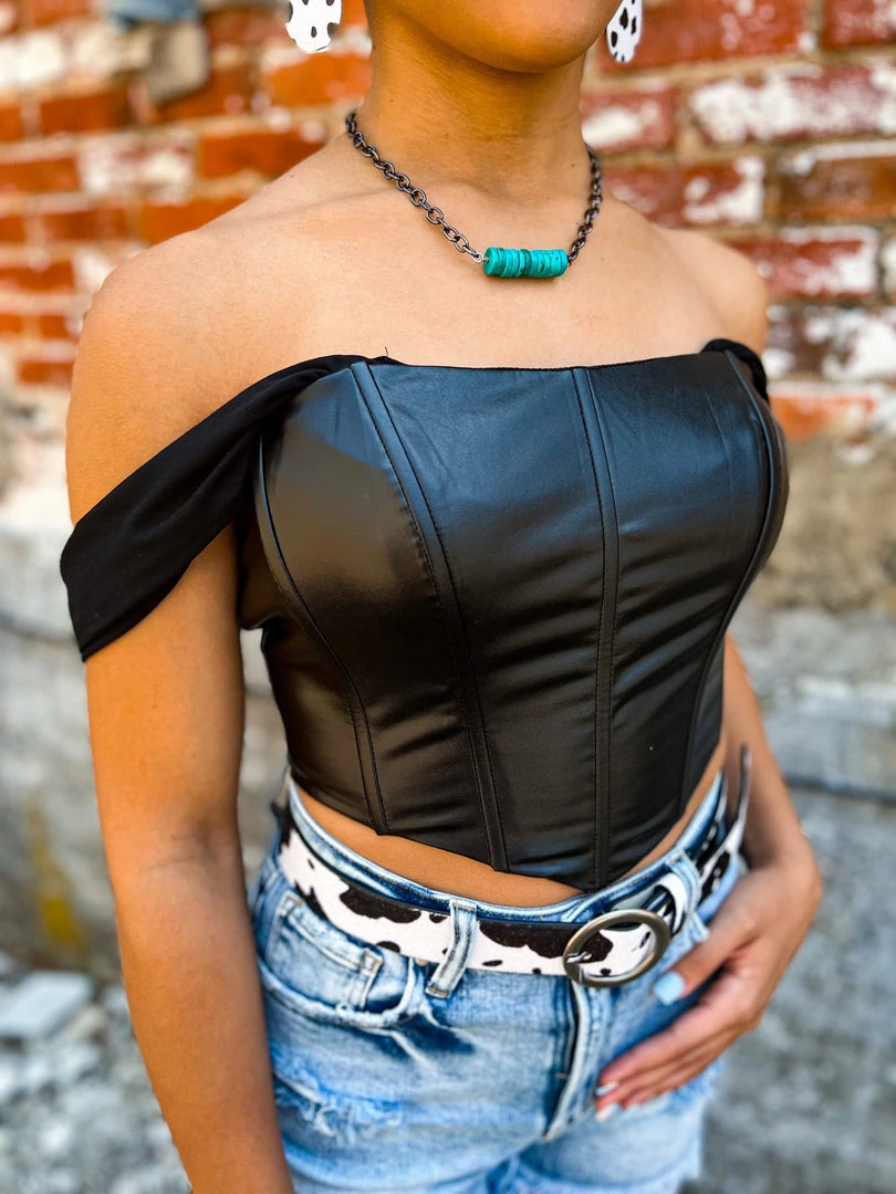 - Black leather top with loose mesh off shoulder straps, angled hemline, seamed, cropped length, back zipper closure