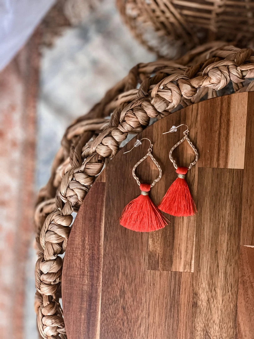 Gold metal hollow out earrings with red fringe tassels. Earrings feature an engaved gold metal with red fringe. Earrings are super light weight, simple, and the perfect touch to all your outfits!