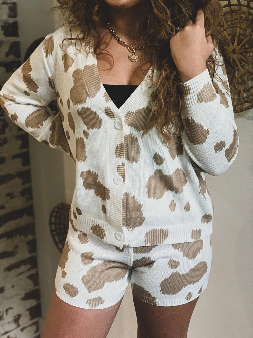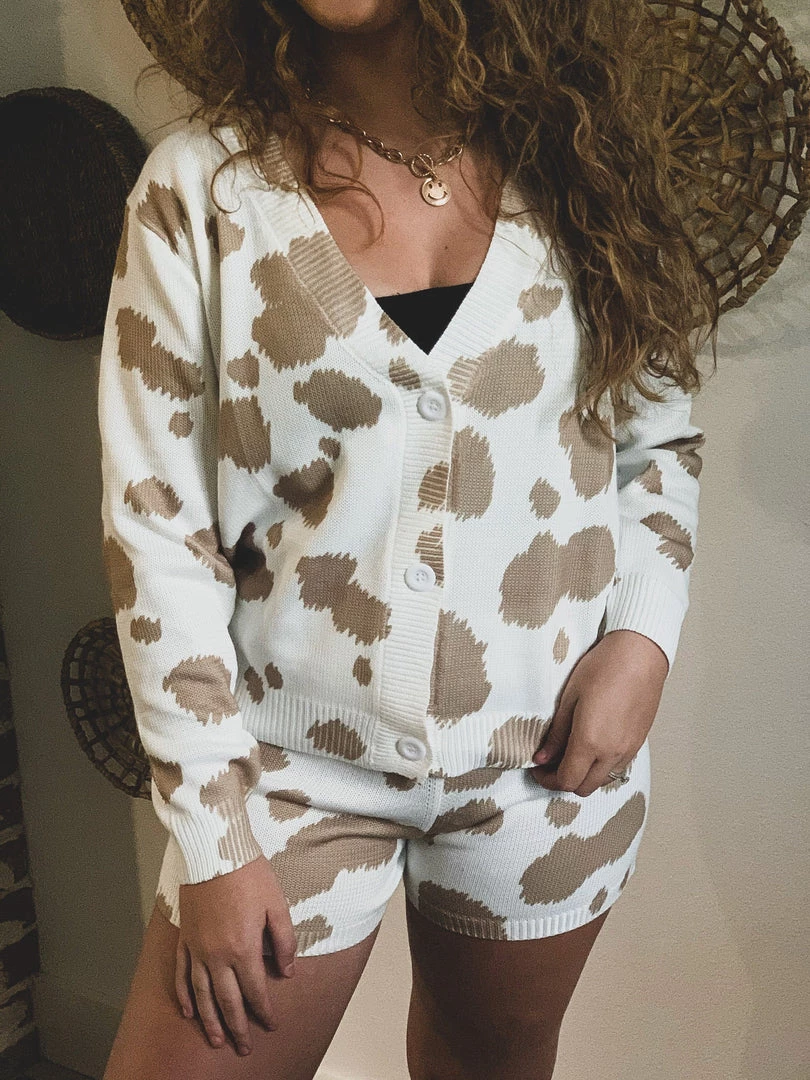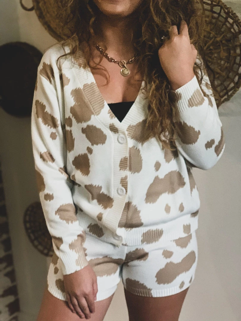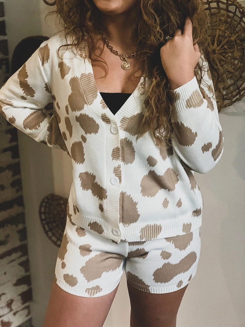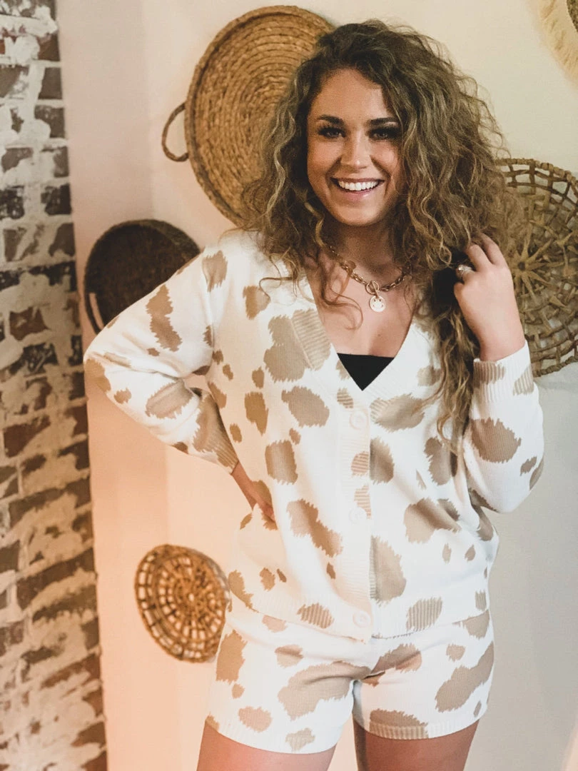 Tan cow print knit two piece lounge set has our Gypsy Waltz staff obsessed! Top features trendy tan cow print patterns, cozy knit material, long sleeves, v-neckline with button front closure. Shorts feature a trendy tan cow print pattern, cozy knit material, and an elastic stretchy waistband. So cute and cozy! Pair with your favorite crop top underneath and your favorite sneakers for the complete look!