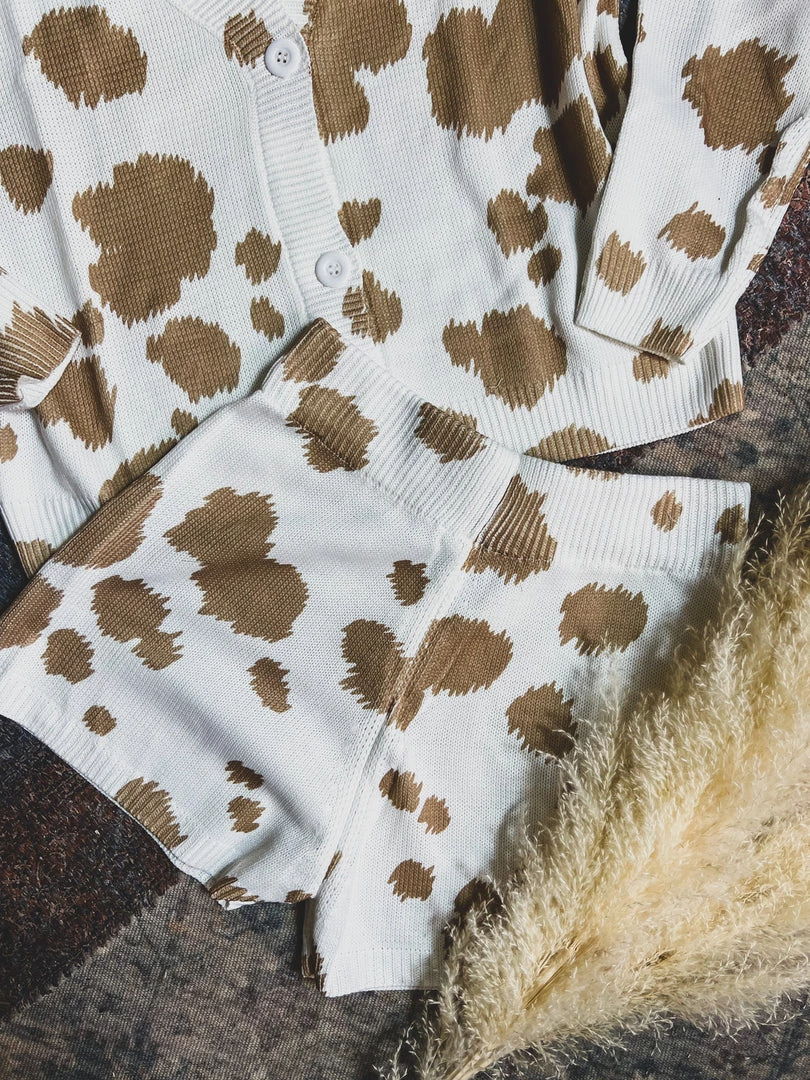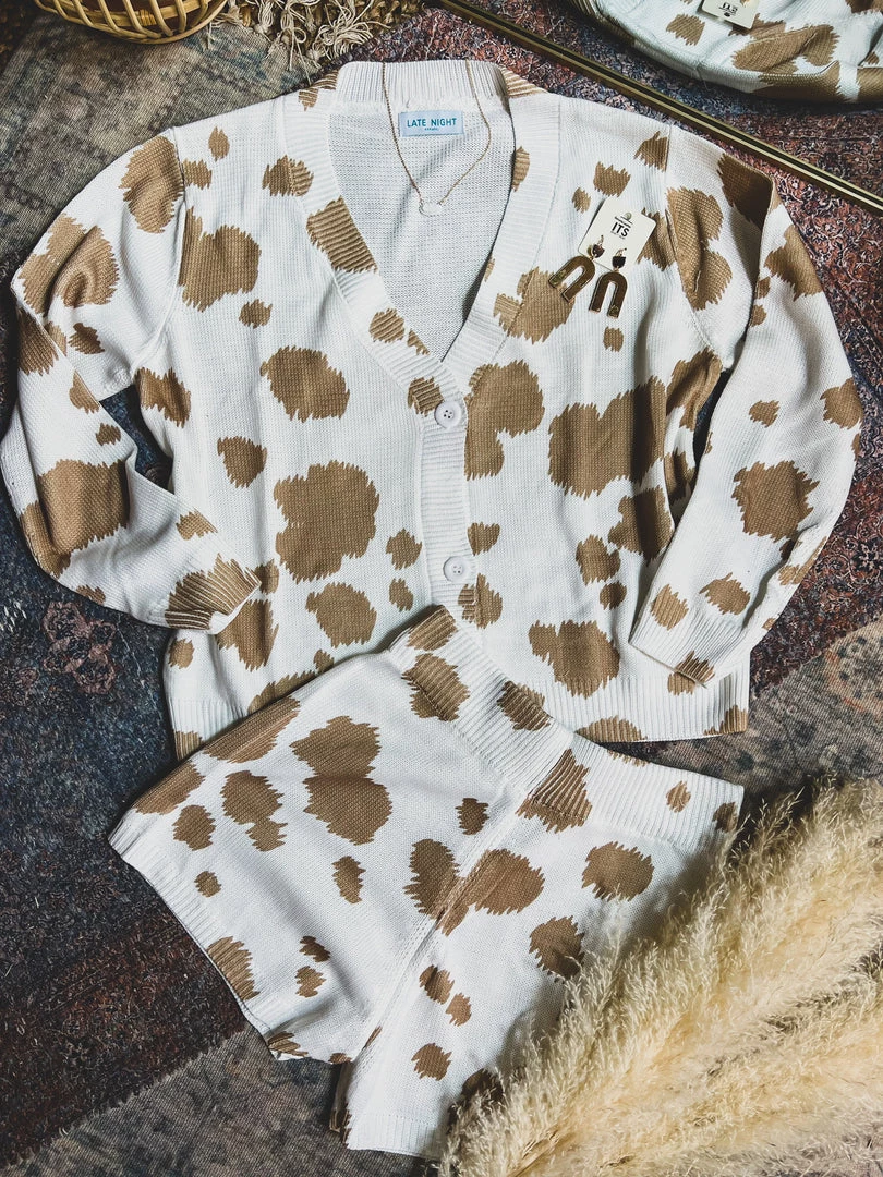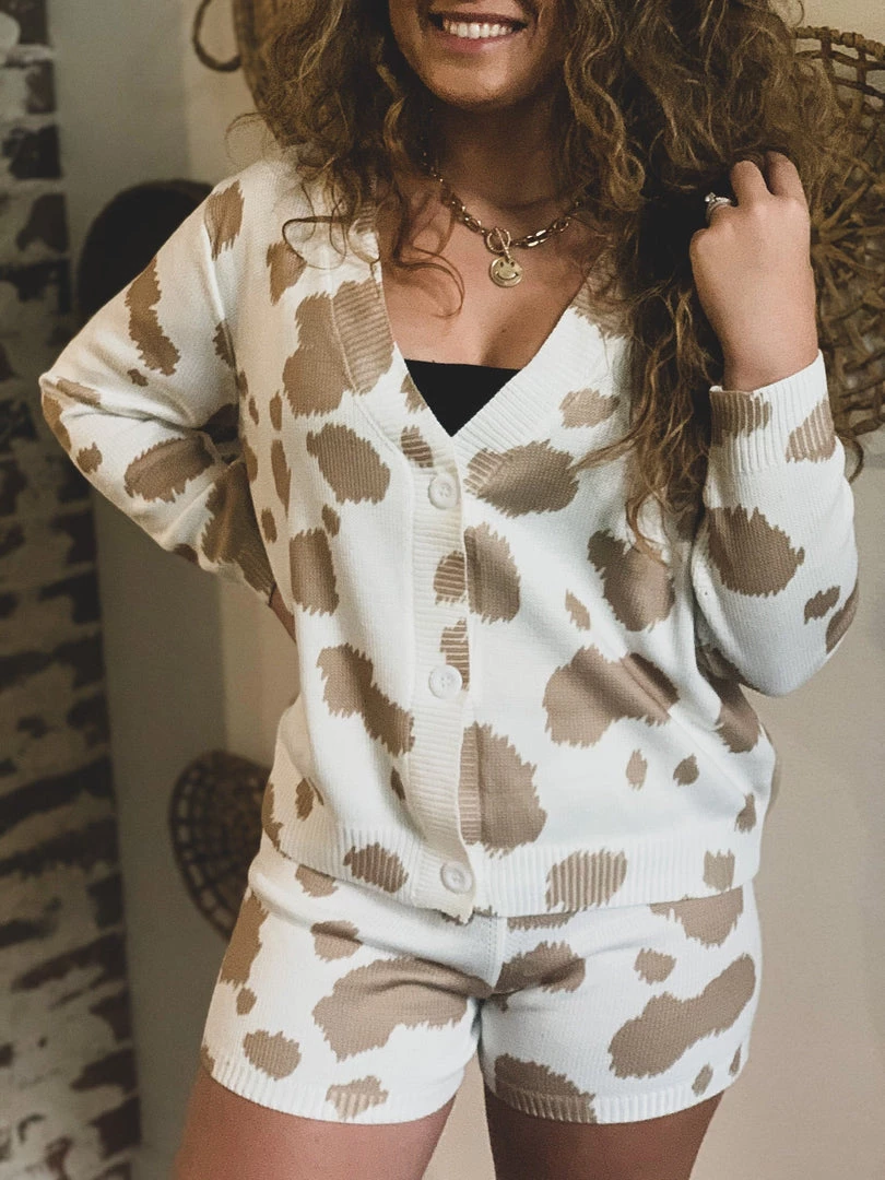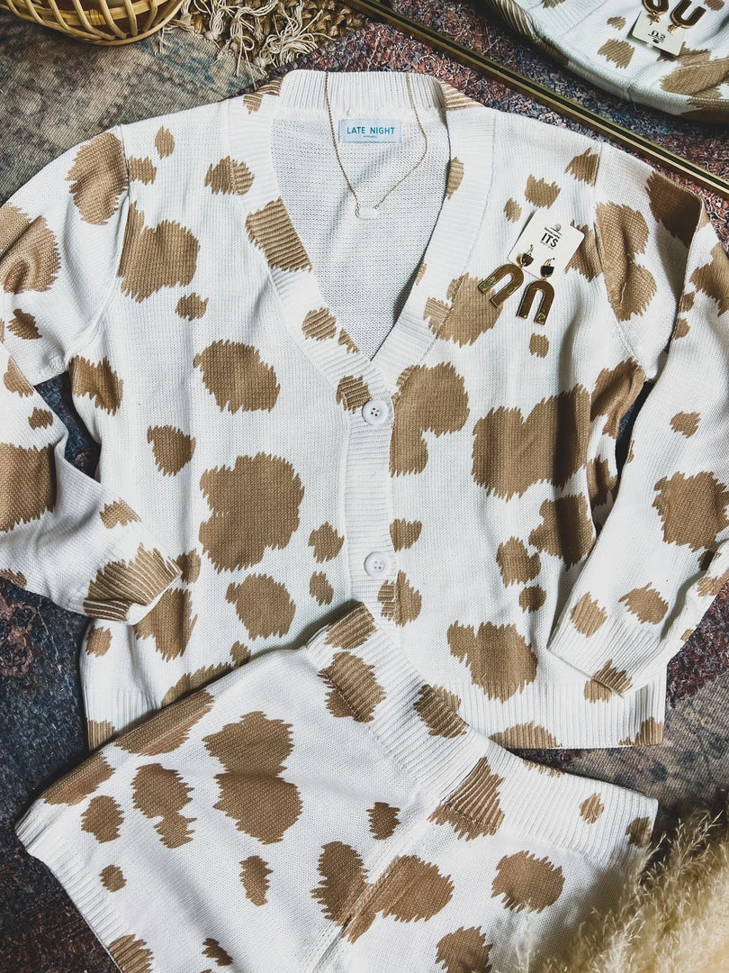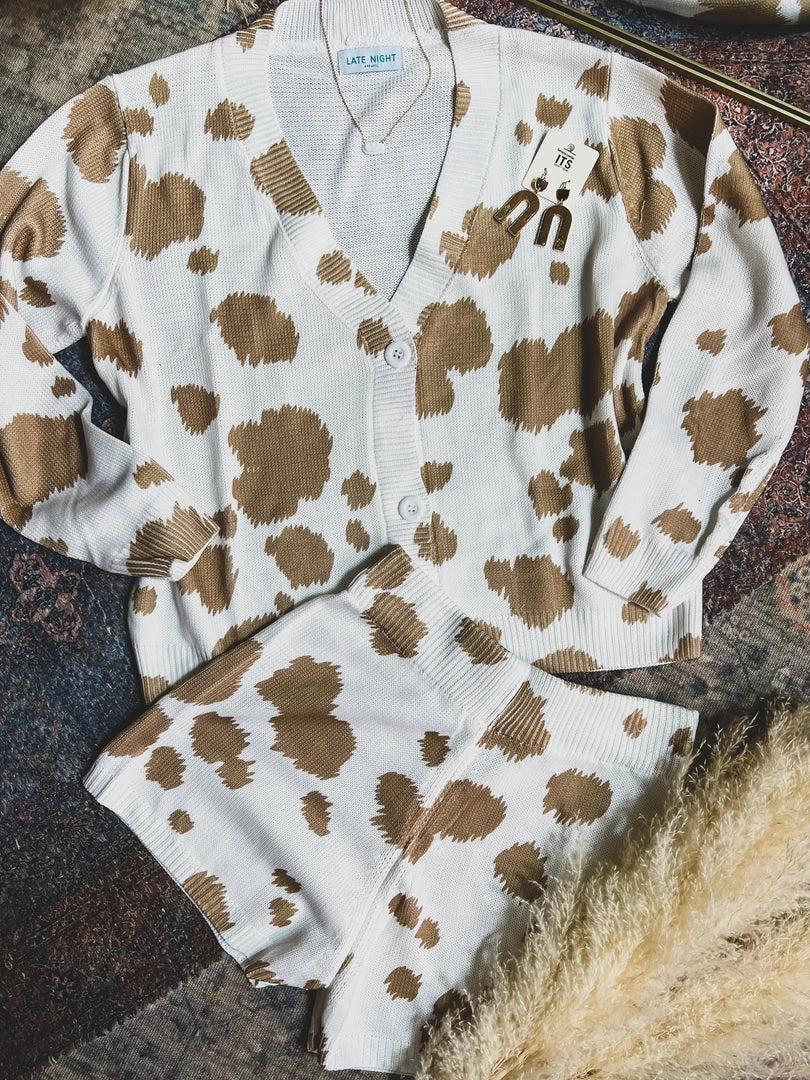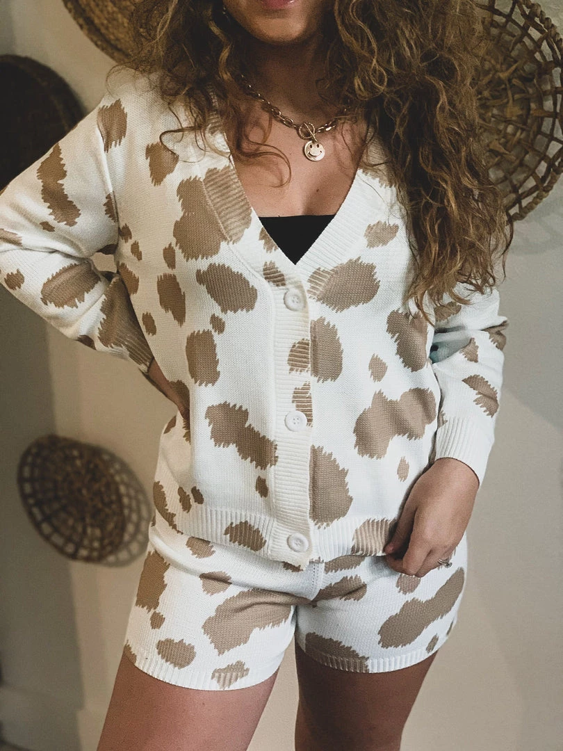 Tan cow print knit two piece lounge set has our Gypsy Waltz staff obsessed! Top features trendy tan cow print patterns, cozy knit material, long sleeves, v-neckline with button front closure. Shorts feature a trendy tan cow print pattern, cozy knit material, and an elastic stretchy waistband. So cute and cozy! Pair with your favorite crop top underneath and your favorite sneakers for the complete look!