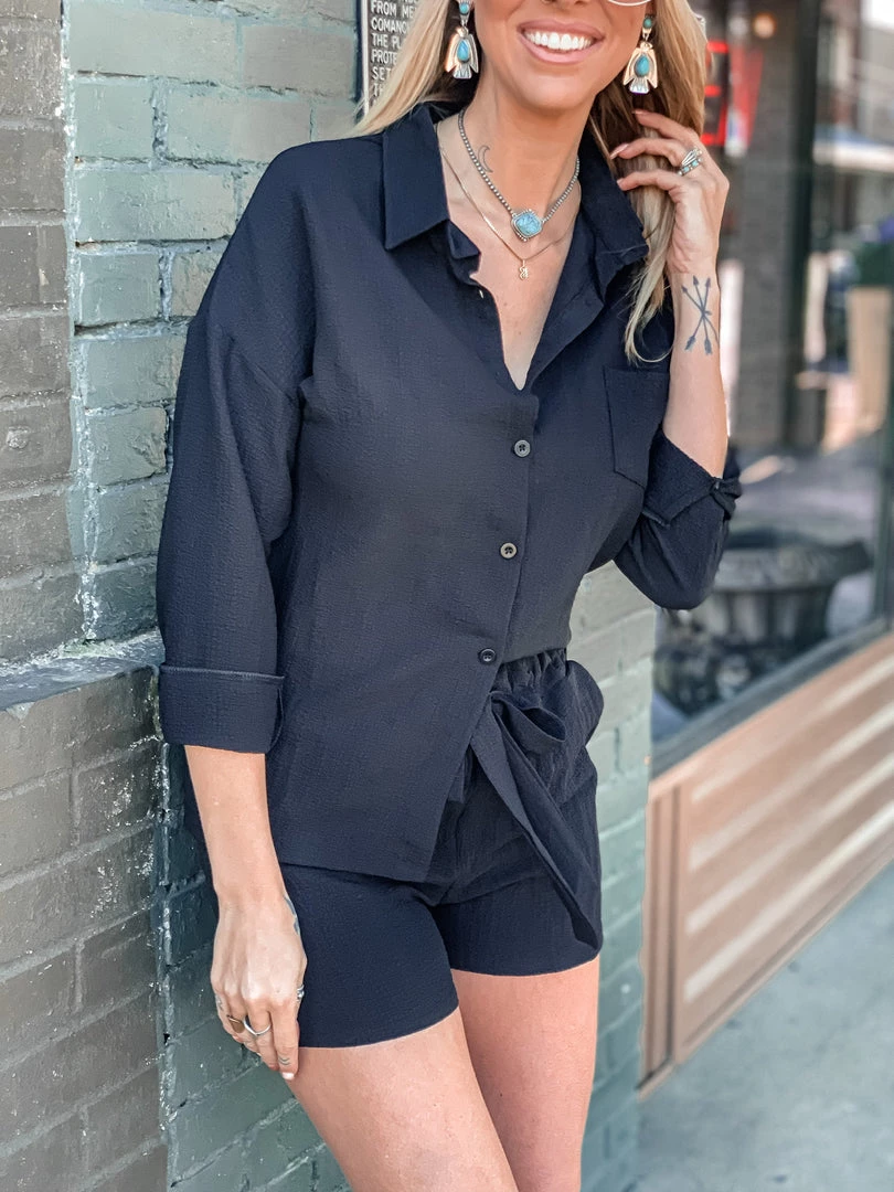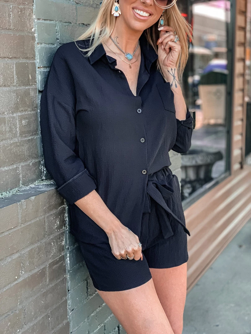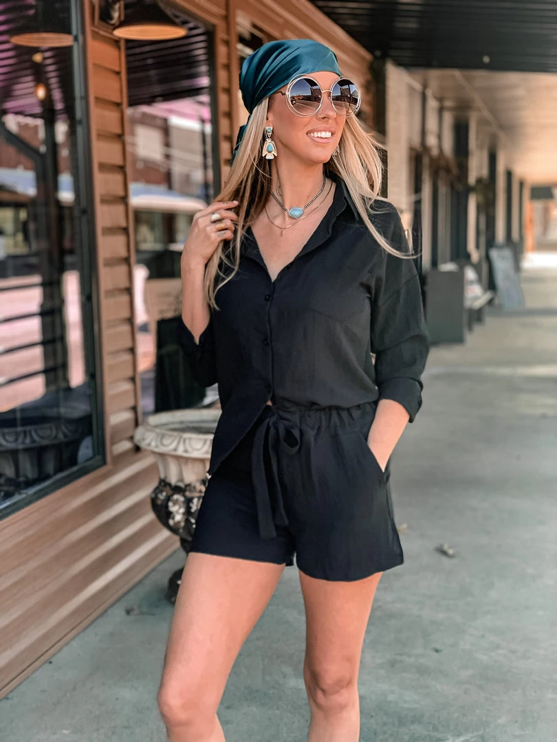 Black two piece set is so fun to style. Casual, western, dressy – have fun with this set in your wardrobe with the endless ways to style it. Features a light weight fabric, long sleeves with button wrist cuffs, collared, chest pockets, and button front closure. Shorts feature a gathered elastic waistband with a faux waist tie, pockets, and a cute length. Pair with our Celeste Boots, Screenbuster Wild Rag Head Scarfs, and our Vidor Turquoise Earrings and Necklace.