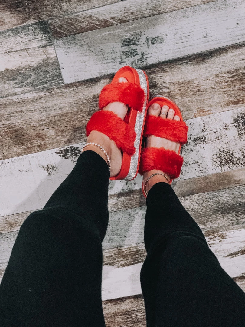 RED double strap FUR slip on sandal shoe with a rhinestone platform. Shoes feature thick rhinestone platform and two black fuzzy fur straps. Super glam and perfect for leggings and flannels this Fall!