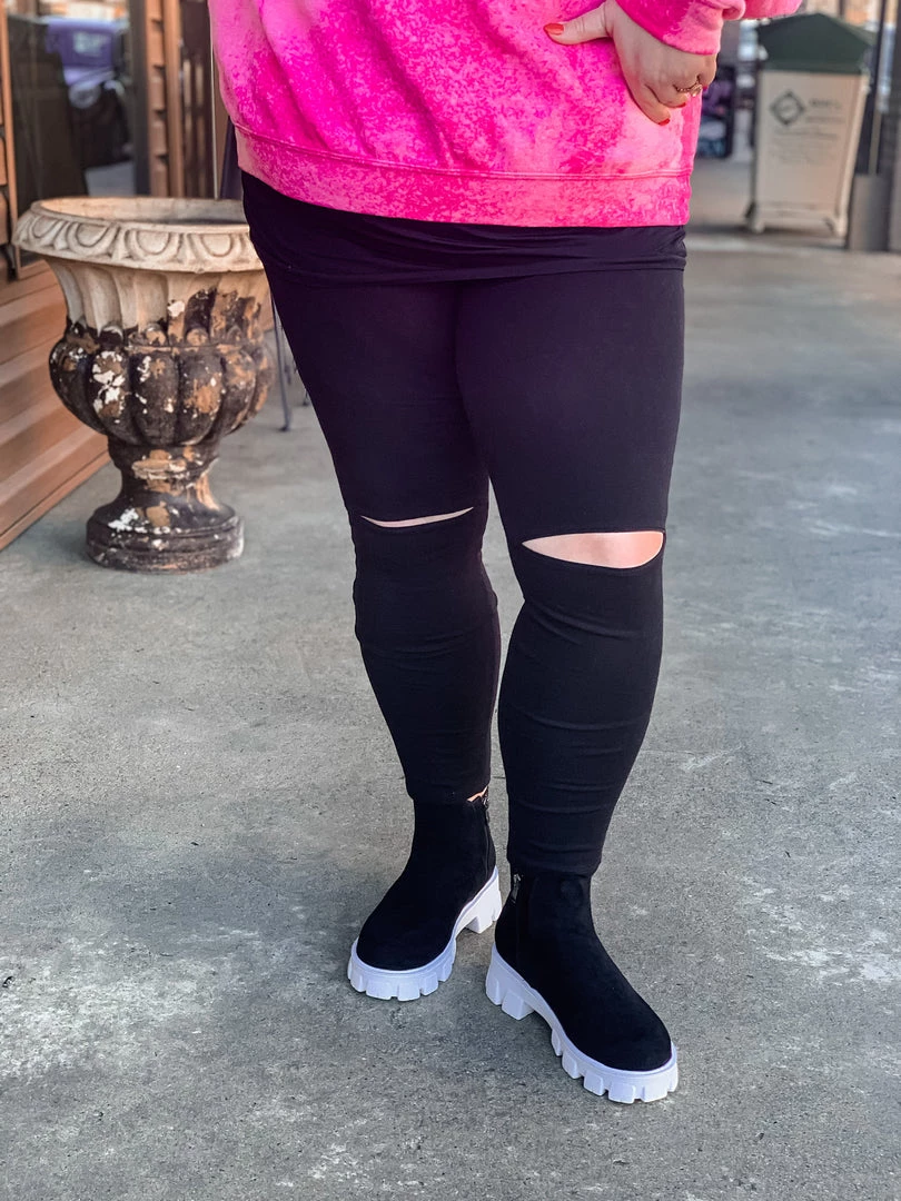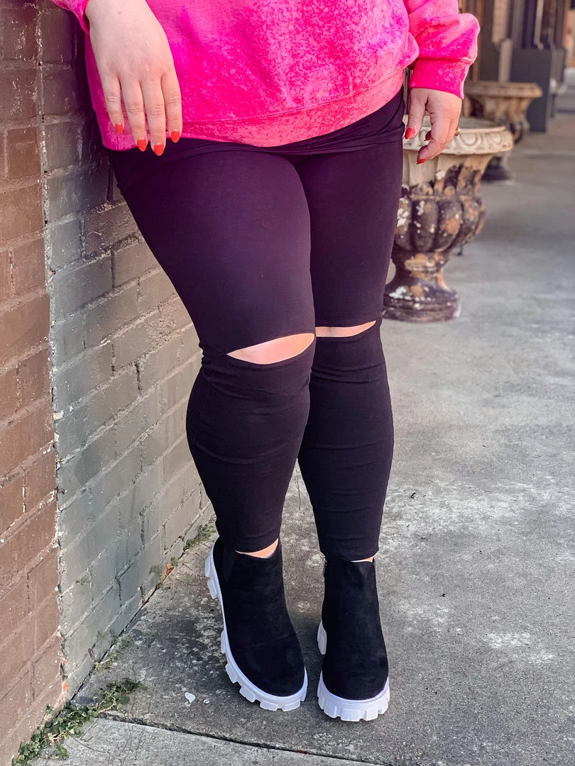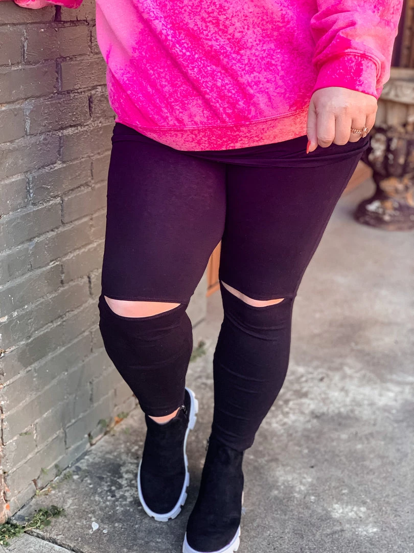 High waisted cotton plus size leggings. Features slashed knee detailing. Perfect with a cute top or graphic tee! So easy to dress up or down.
