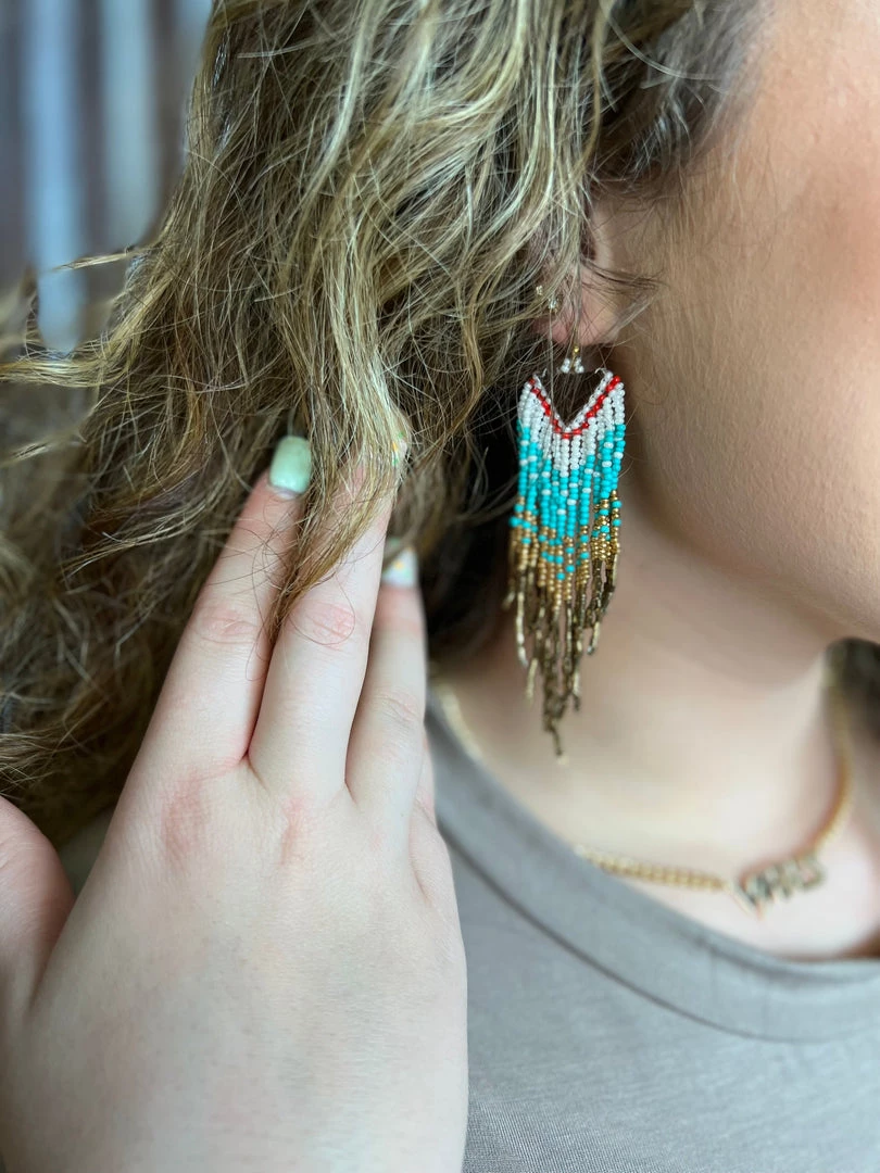 - Pearl white, red, turquoise, gold, and brown beaded aztec beaded earrings