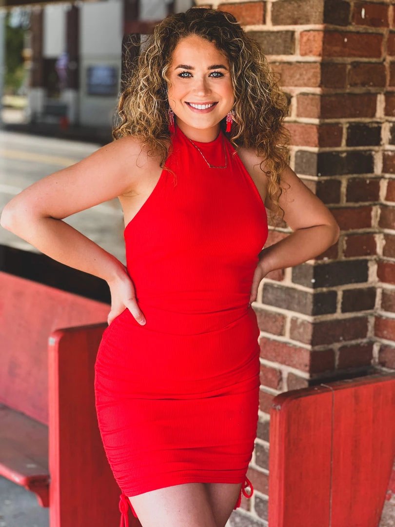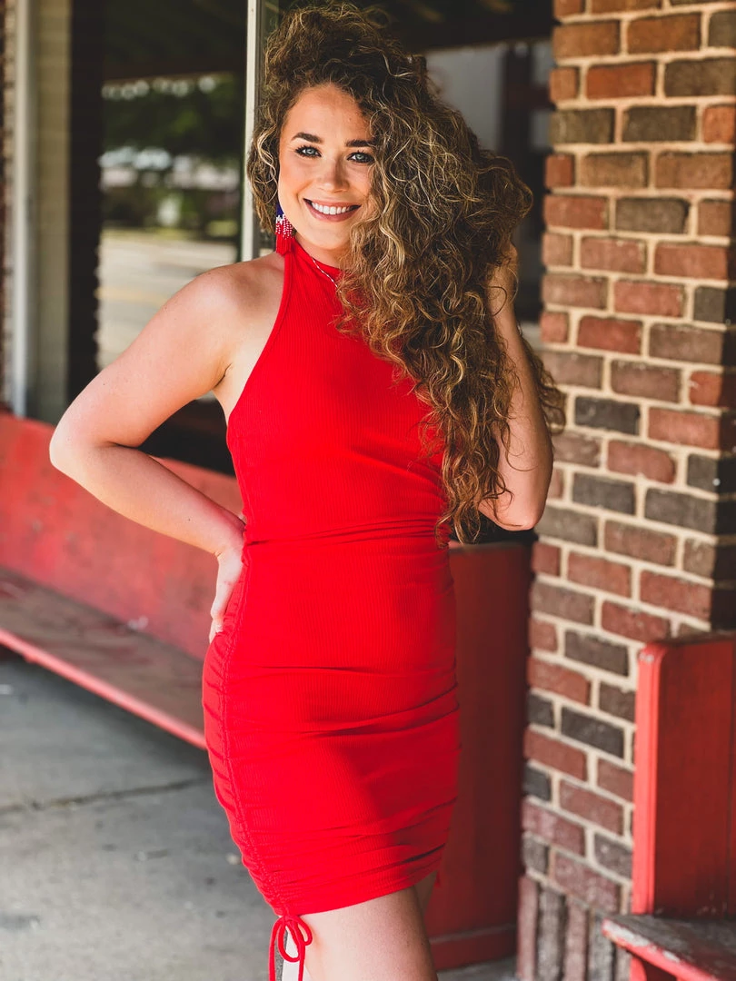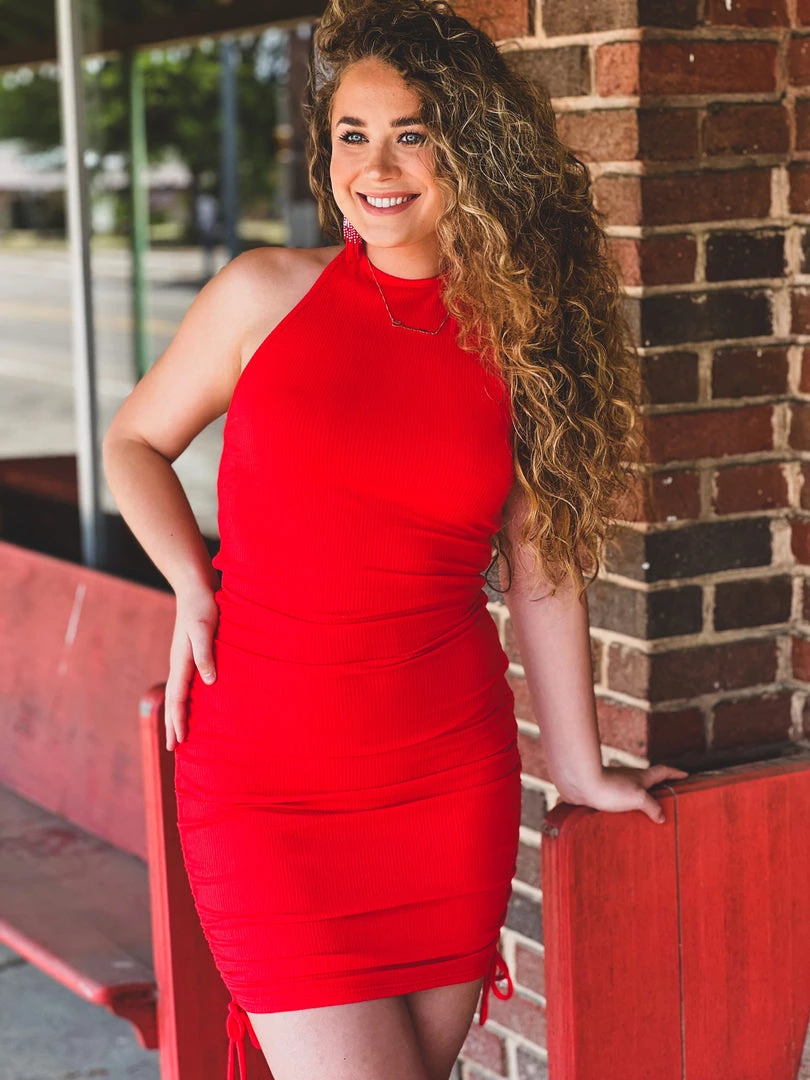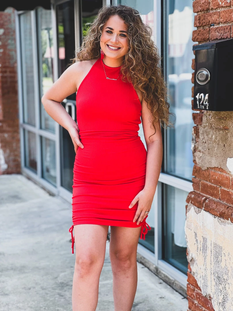 - Halter neck dress with open back, scrunched butt detail, and adjustable ruched drawstring sides