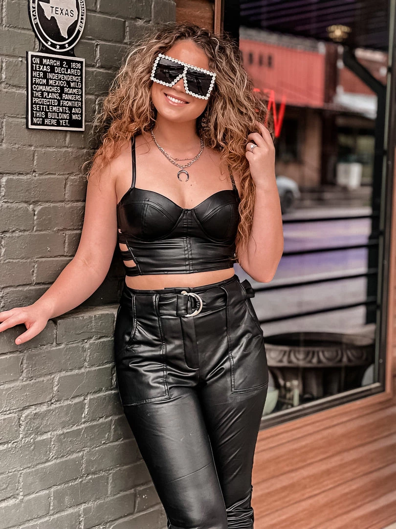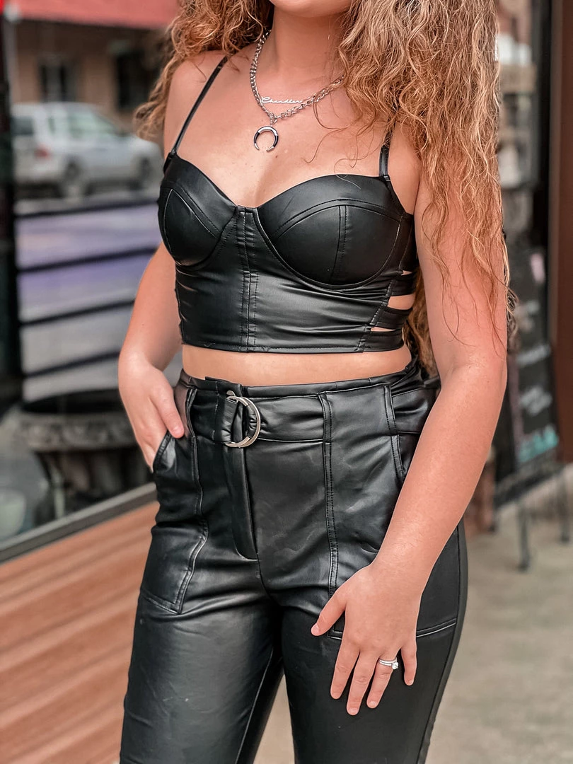 - Black leather crop top, adjustable spaghetti straps, padded, side cute out detail, pull on styleÂ