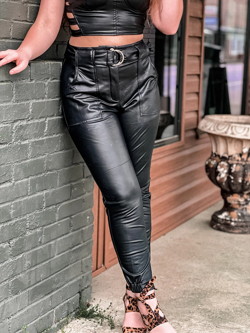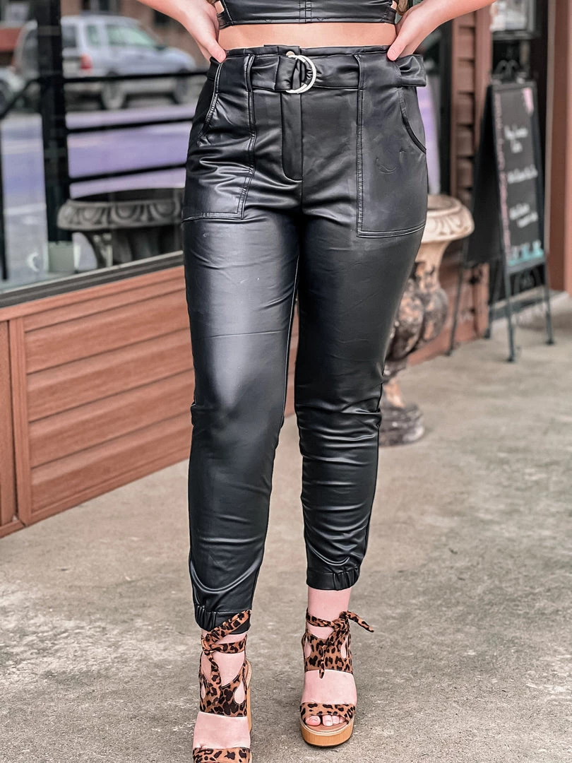- Black leather jogger style pant, high waisted, button front and zipper closure with an adjustable belt, front pockets, elastic ankle cuff