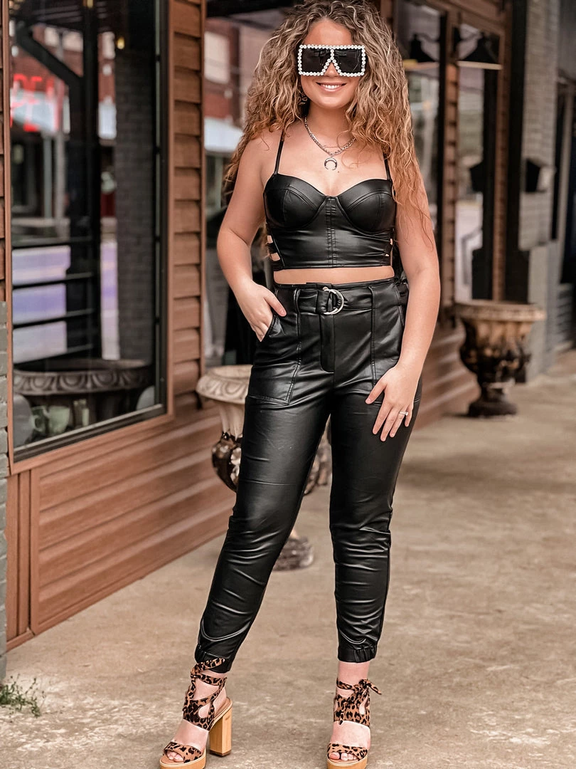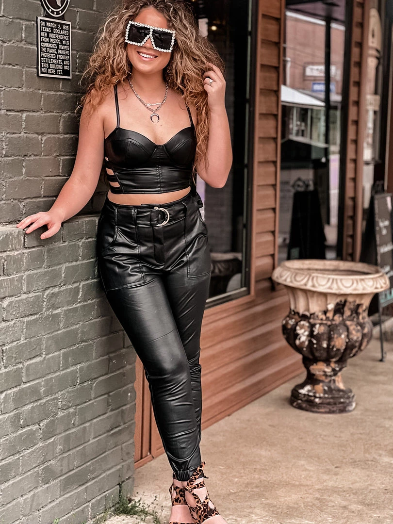 - Must have two piece faux leather top and faux leather high waisted jogger pant setÂ