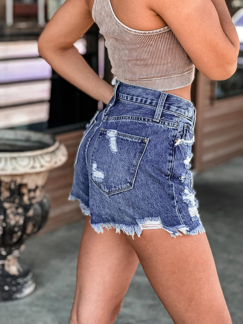 - High rise waist, frayed raw cut hem, traditional front and back pockets, distressed front, distressed pockets, distressed back pockets, relaxed fit through hips and thigh