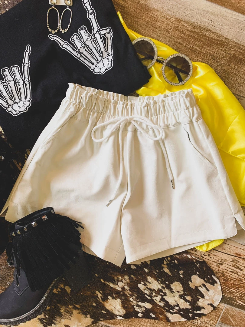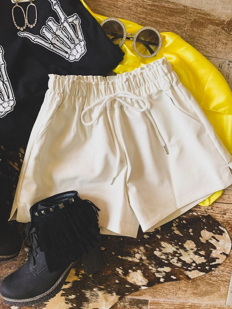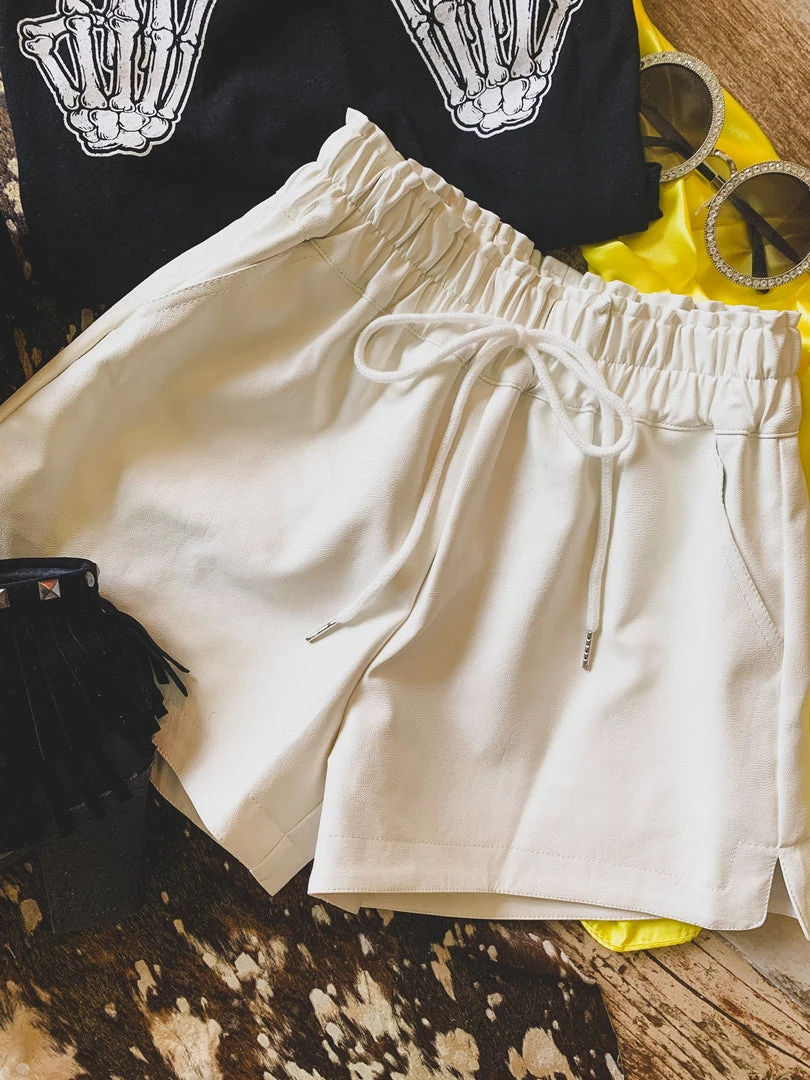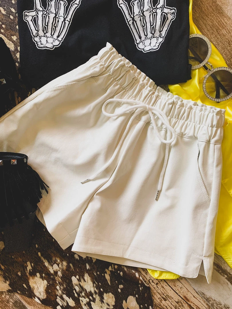 Off white leather shorts are a year round must have! Shorts are perfect to pair with your graphic tees, body suits, and sweaters. Shorts feature a high-waisted gathered elastic waistband with faux drawstring detail, side pockets, a good length, and is inner-lined. Pair with our Rosenburg Sweatshirt for the complete look!Â