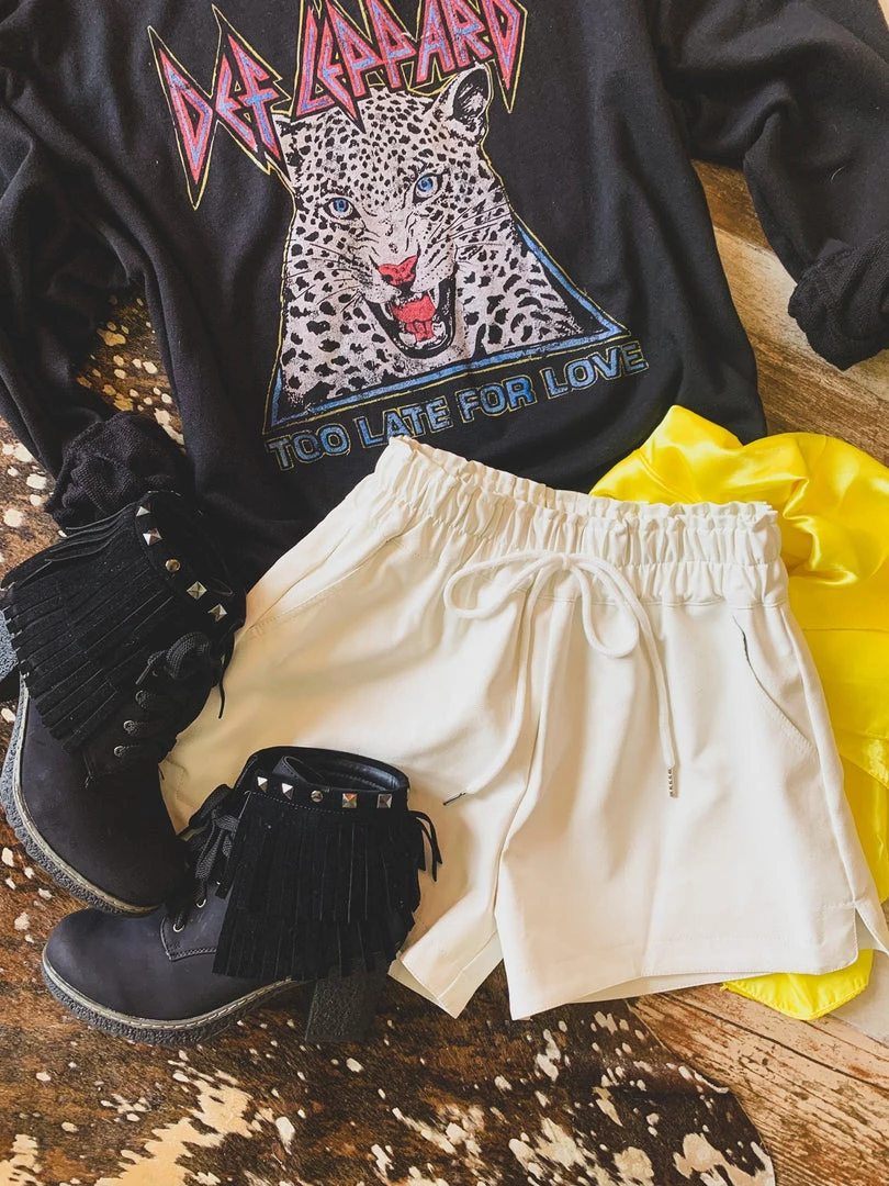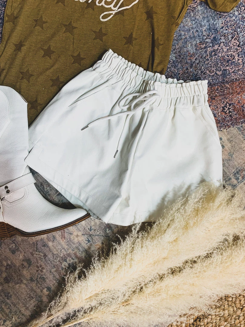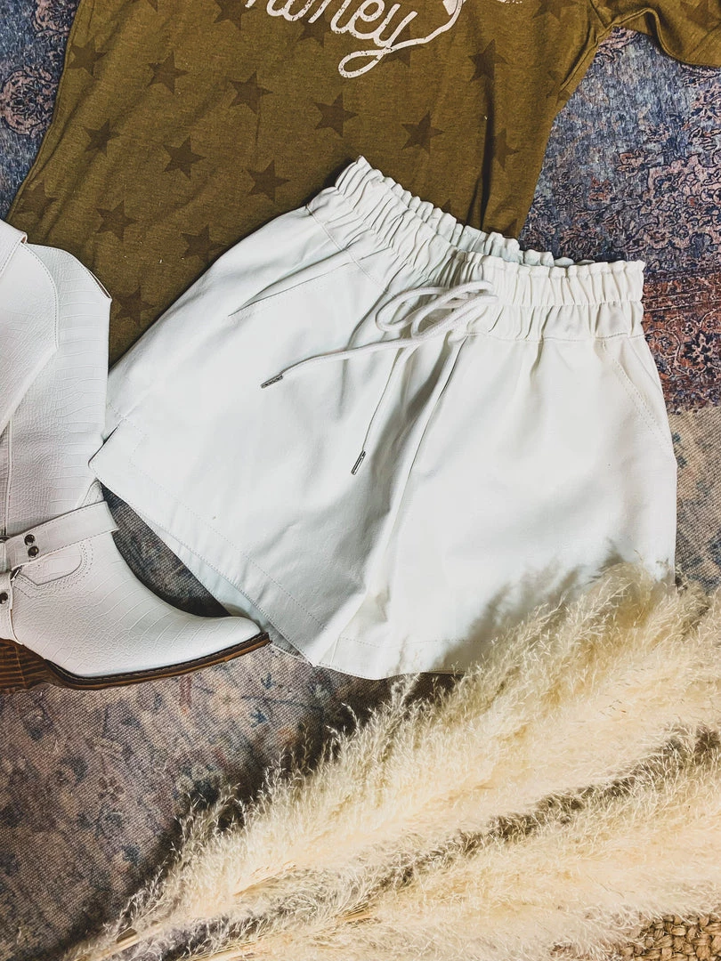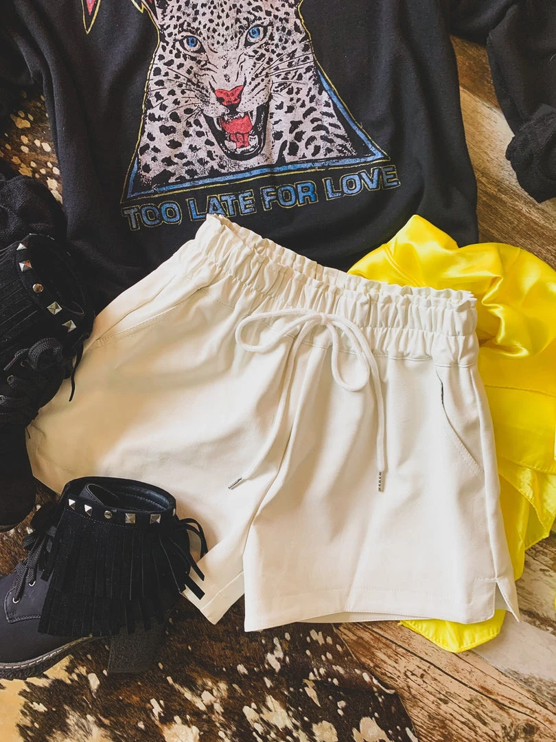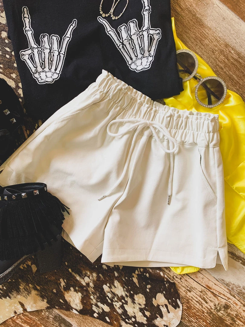 Off white leather shorts are a year round must have! Shorts are perfect to pair with your graphic tees, body suits, and sweaters. Shorts feature a high-waisted gathered elastic waistband with faux drawstring detail, side pockets, a good length, and is inner-lined. Pair with our Rosenburg Sweatshirt for the complete look!Â