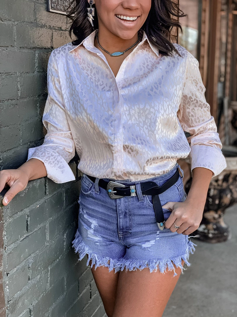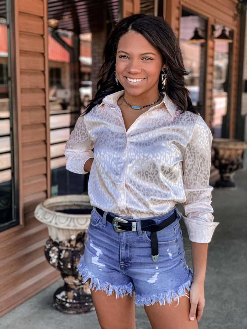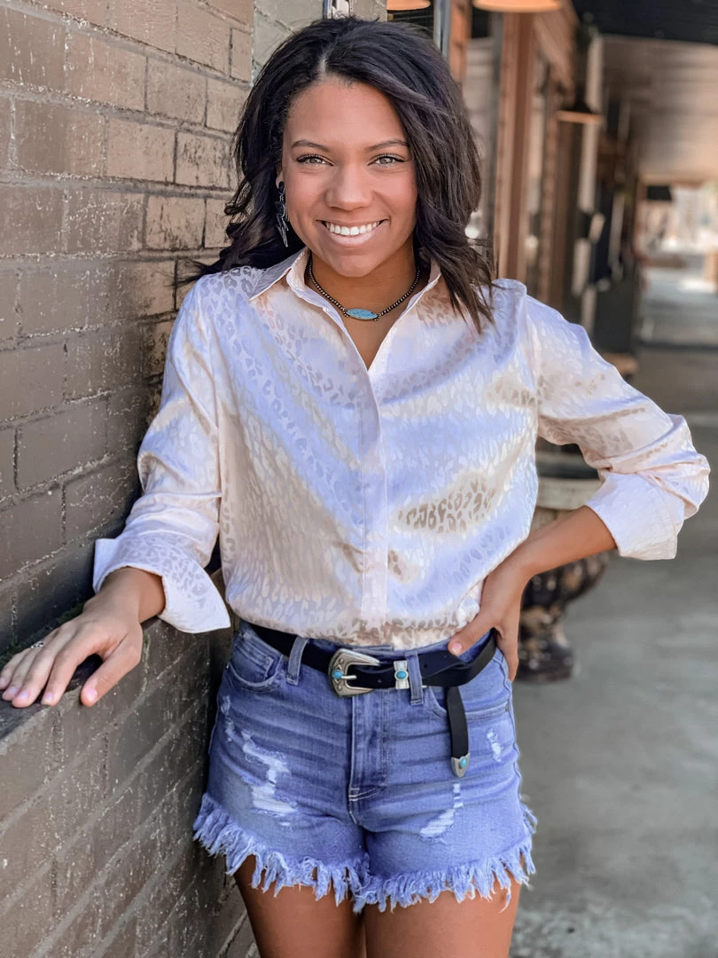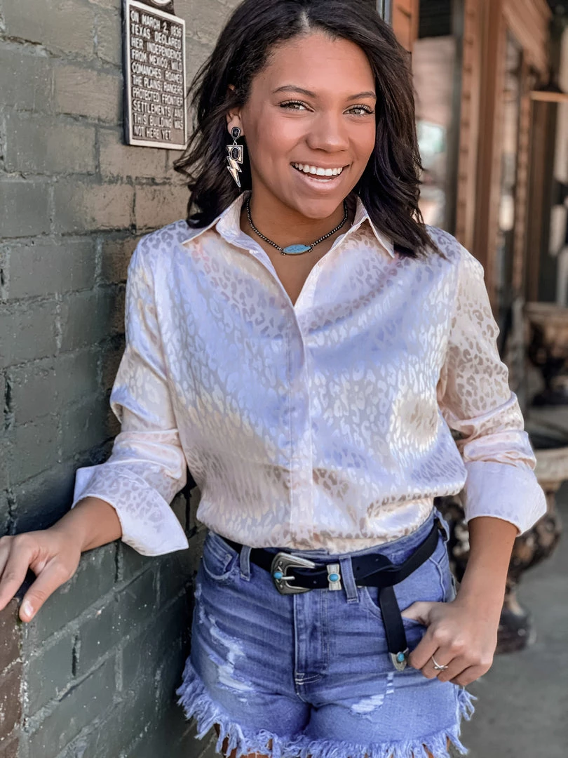 Satin cream leopard print top is so cute and flirty. Features a satin silk fabric with an all over trendy leopard print pattern, collared with button down closure, long sleeves with button wrist cuffs, and the cutest high low hemline. Top is light weight and a new staff favorite! Pair with our Toco Shorts, Screenbuster Turquoise Bellt, and our San Leon Boots in Black for the cutest western chic look!