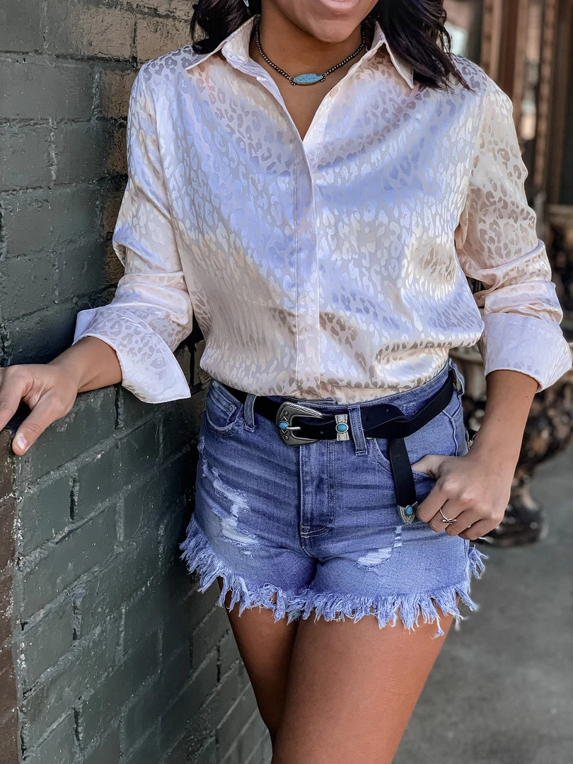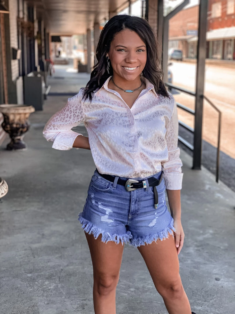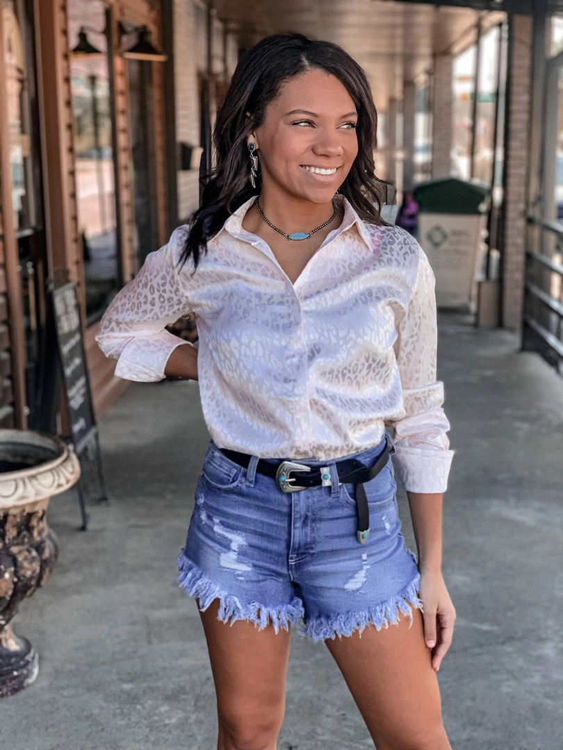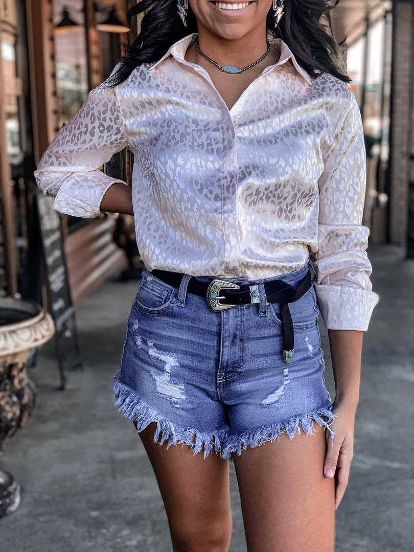 Satin cream leopard print top is so cute and flirty. Features a satin silk fabric with an all over trendy leopard print pattern, collared with button down closure, long sleeves with button wrist cuffs, and the cutest high low hemline. Top is light weight and a new staff favorite! Pair with our Toco Shorts, Screenbuster Turquoise Bellt, and our San Leon Boots in Black for the cutest western chic look!