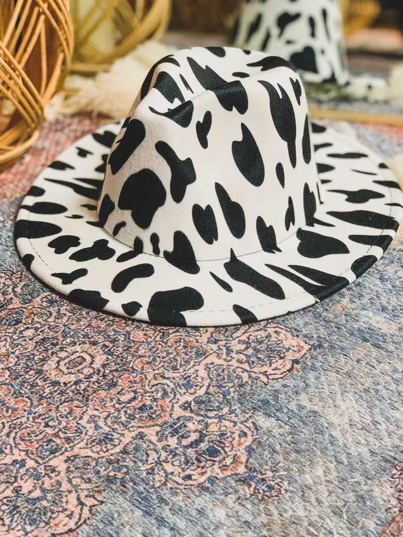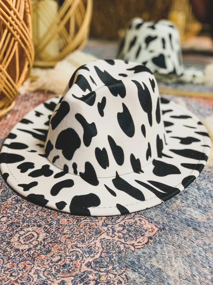 ONE SIZE black and white cow print wool felt hat with a pinched front crown. We ADORE this hat! It is one size, but features an adjustable inner drawstring pull for sizing. SO perfect to wear as is or tie one of our famous wild rag head scarfs for the perfect band!