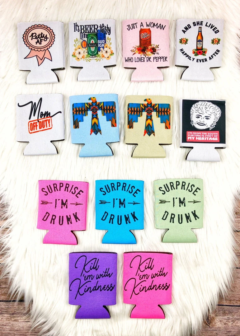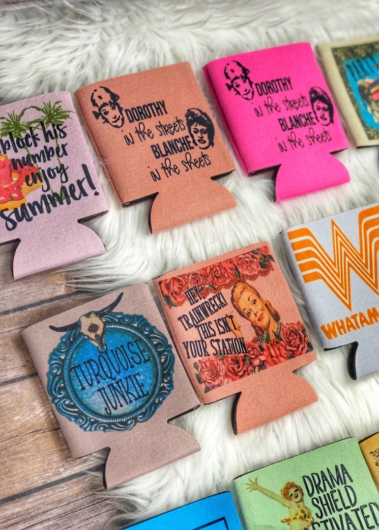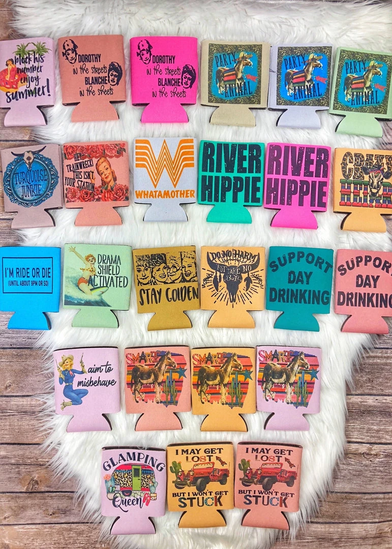 Keep your drink cold and have a good time this Summer using Gypsy Waltz can coolies! Comes in a mystery bag of 3 can coolies randomly picked just for YOU. Not all 3 will be the same, so thats 3 DIFFERENT pairs of coolies. Different styles, colors, quotes. The sun is SHININ’, the beer is cold, and it’s the perfect day to snag you some coolies.Â