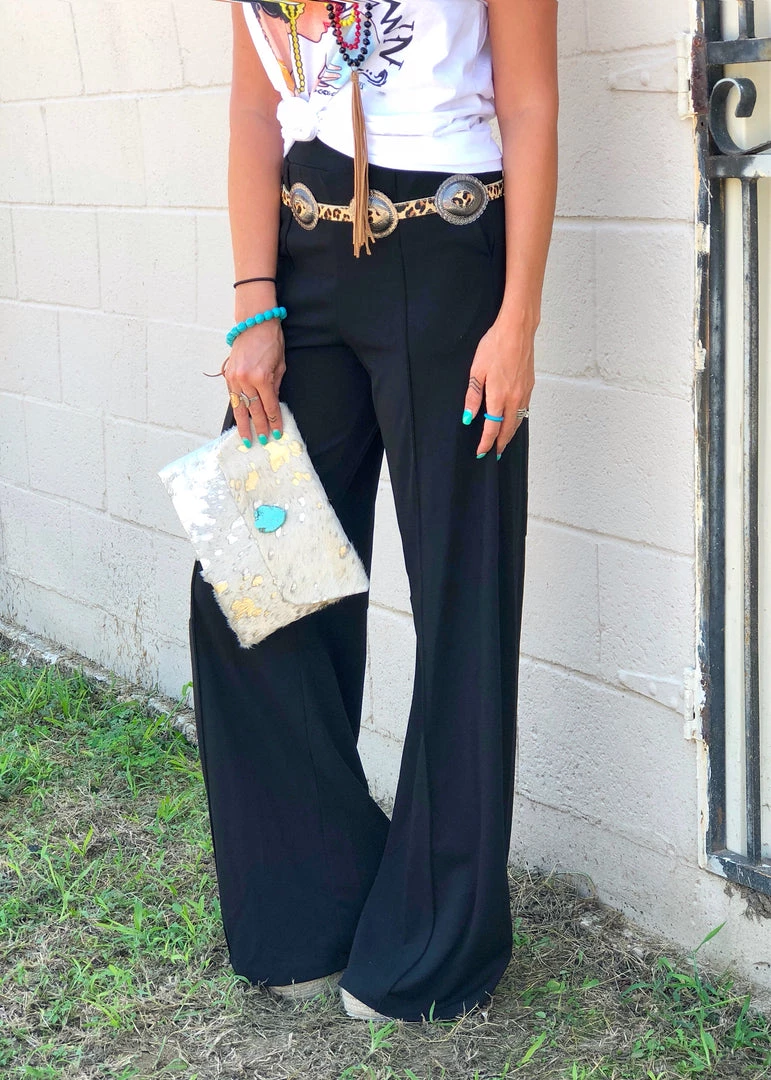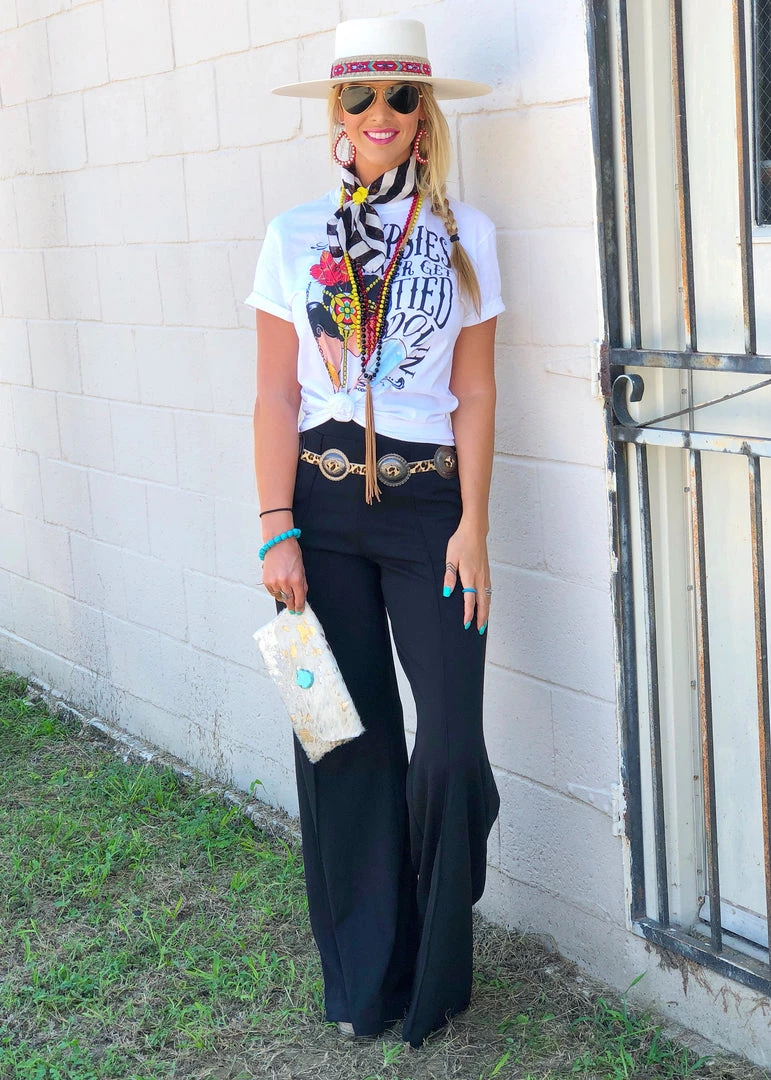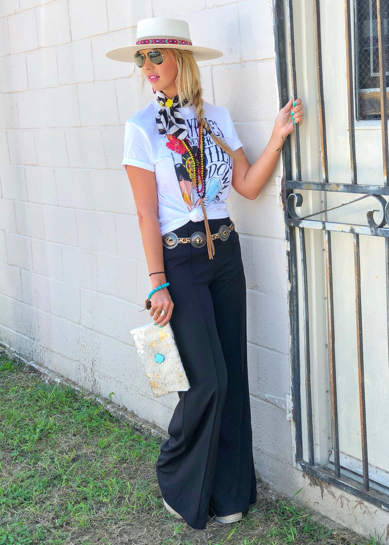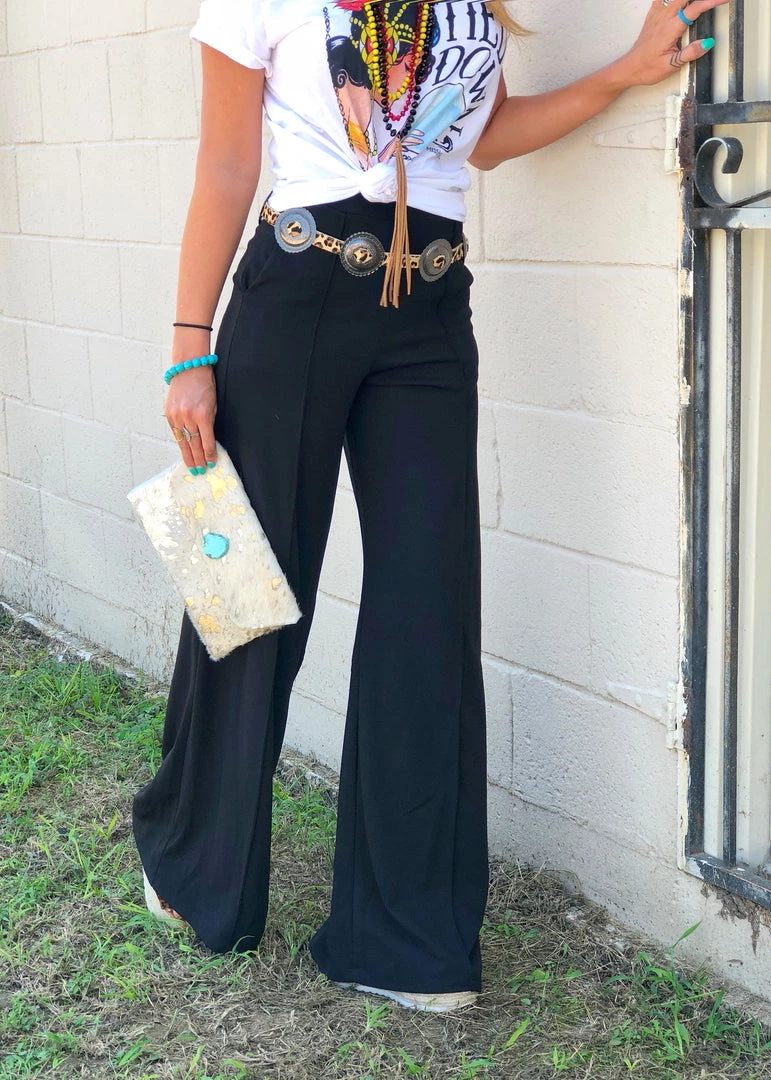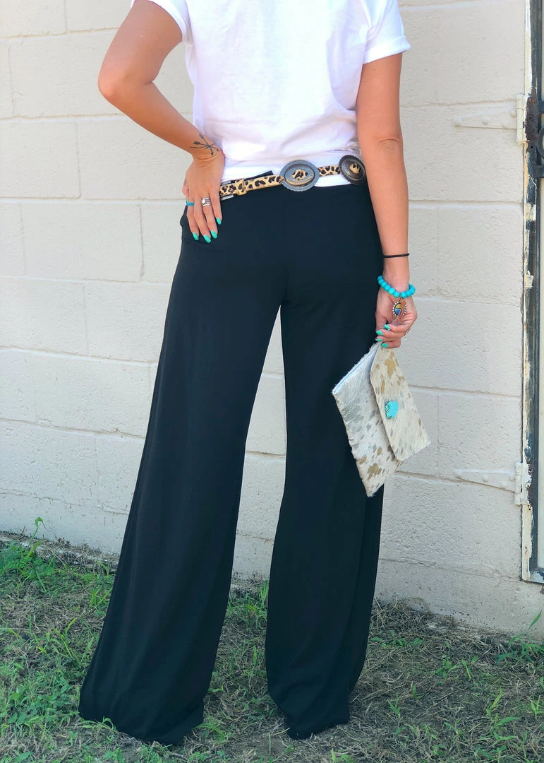 Our sell out palazzo pants are back and better than ever!! Features an elastic waist , front pleats, and side pockets. So many ways to style these cute pants. Perfect pants to strut in at the NFR.