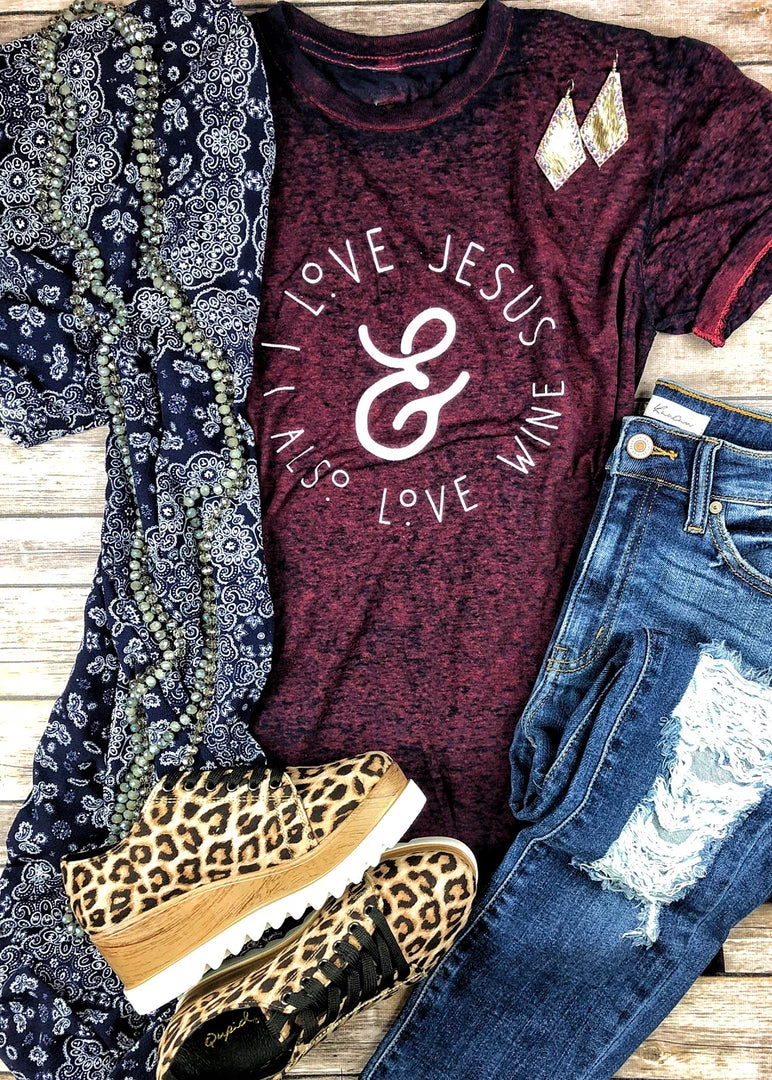 “I love Jesus & I also love wine” quote on a maroon bleached graphic tee. Perfect paired with our Sillsbee Vest and Bell Bottoms.
