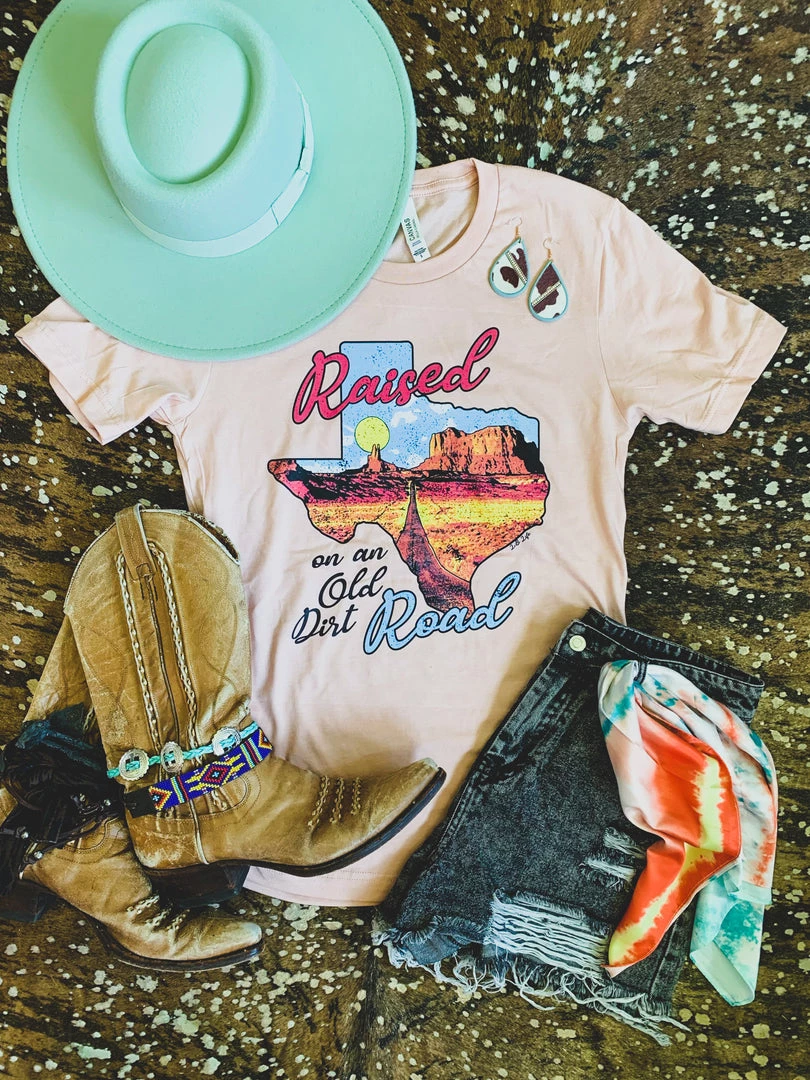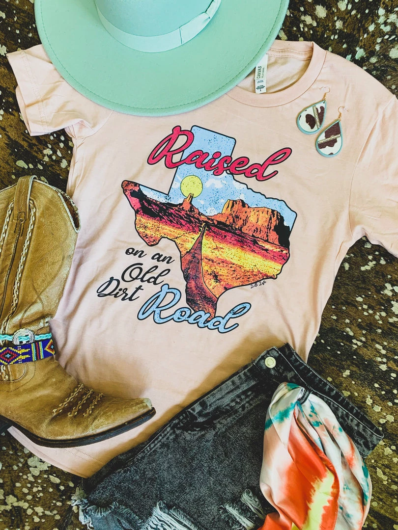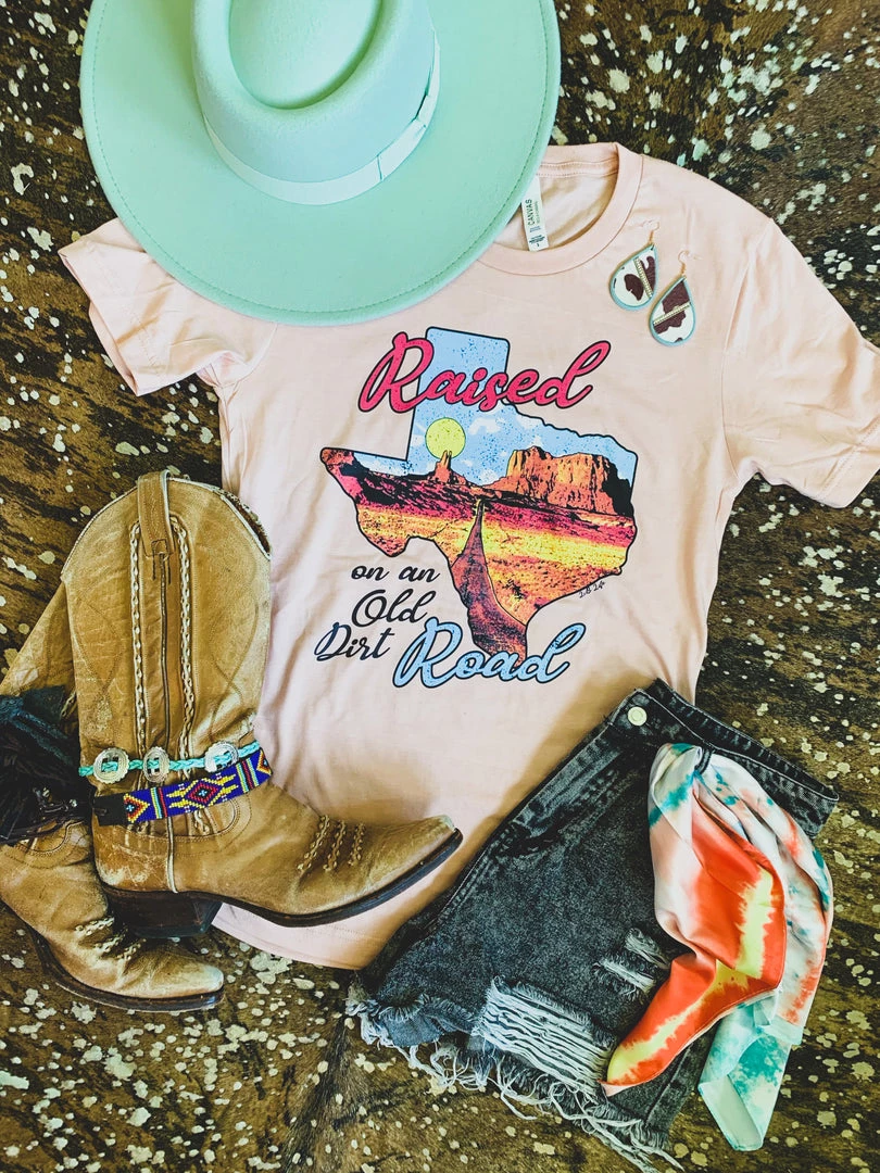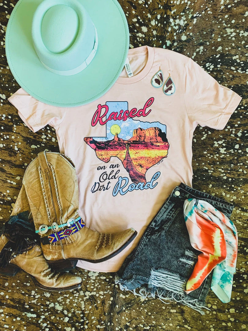 Peach colored graphic tee features the quote, “Raised on an old dirt road” on the shape of Texas. The Texas distressed graphic is a vintage desert with an old dirt road. Such a cute western style tee!