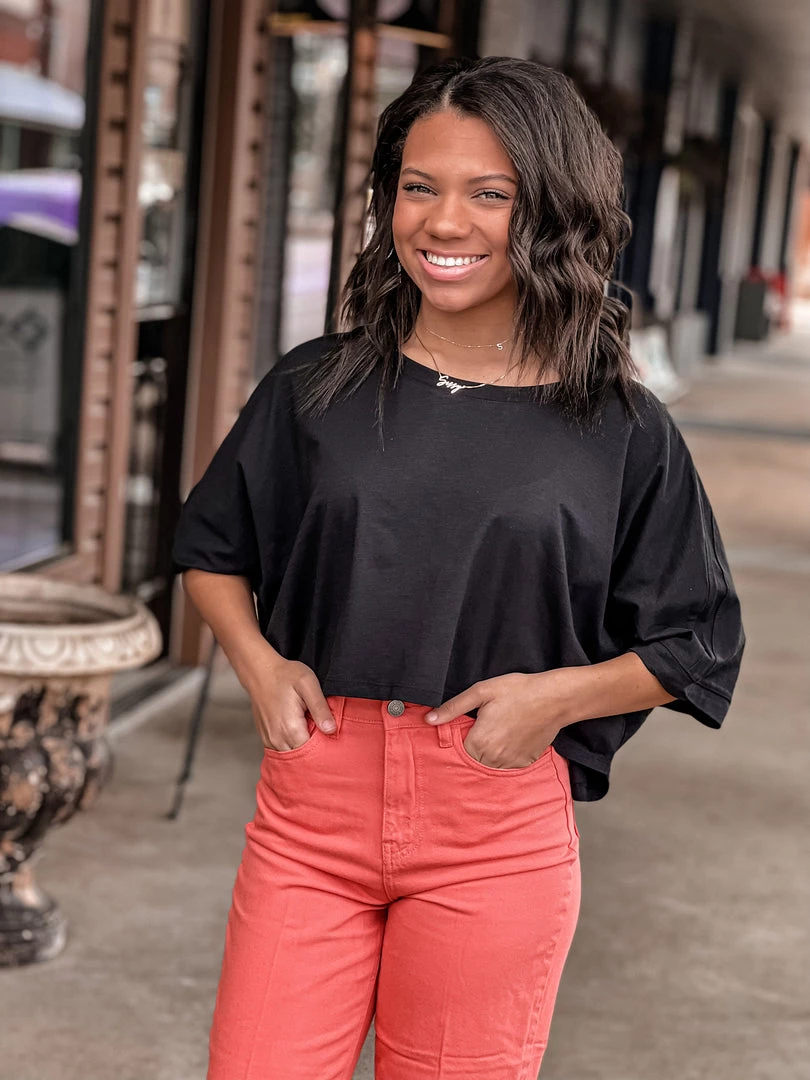 - T-shirt style top with round neckline, drop shoulders, cropped lengthÂ