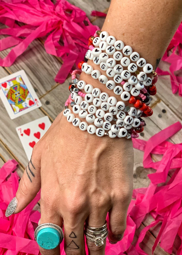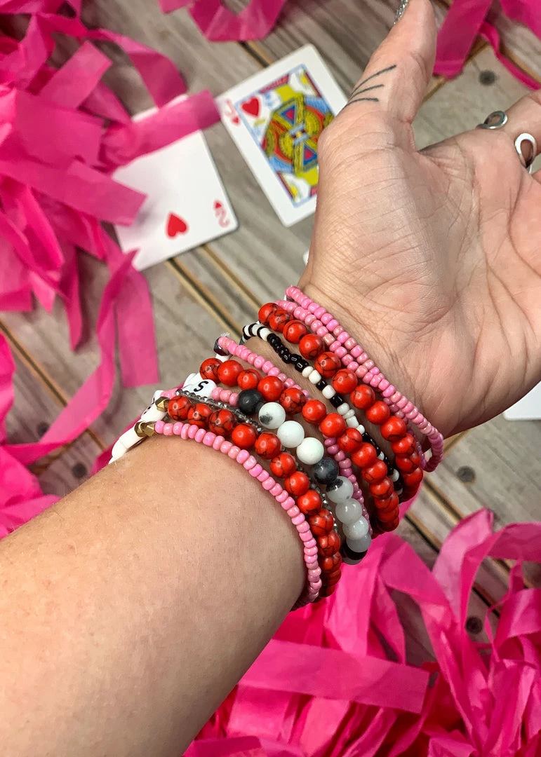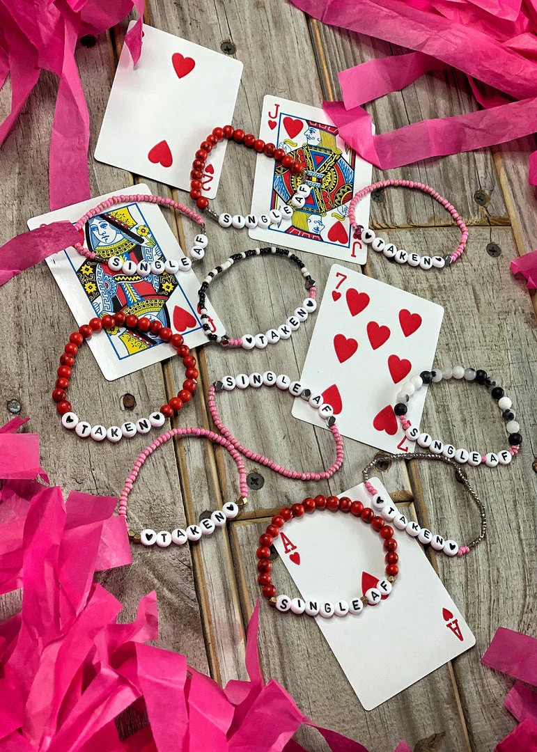 Stretchy beaded bracelets with various beads of different styles and colors, of red, pink, and black. Each bracelet features a round shaped alphabet bead spelling out a cute word, that is SO relatable. So perfect for Valentines, whether you’re single or taken!