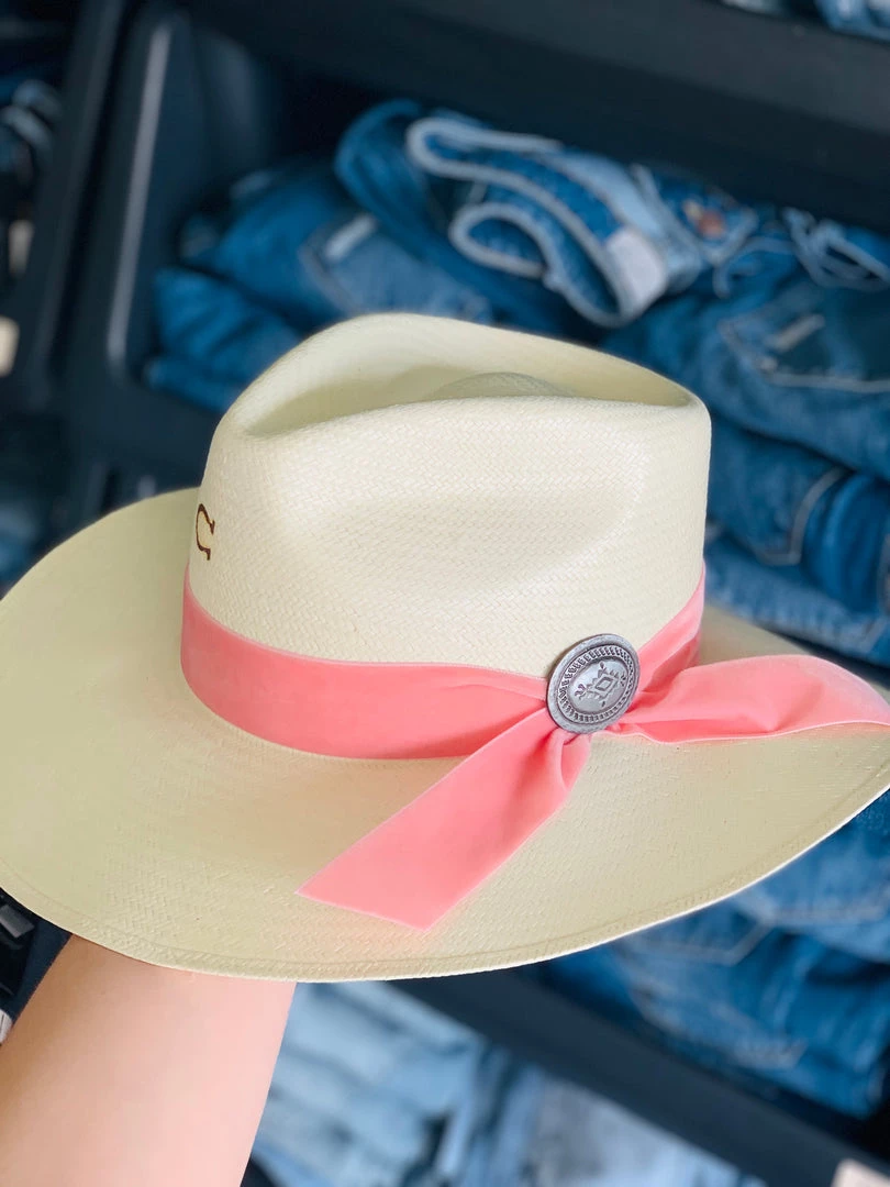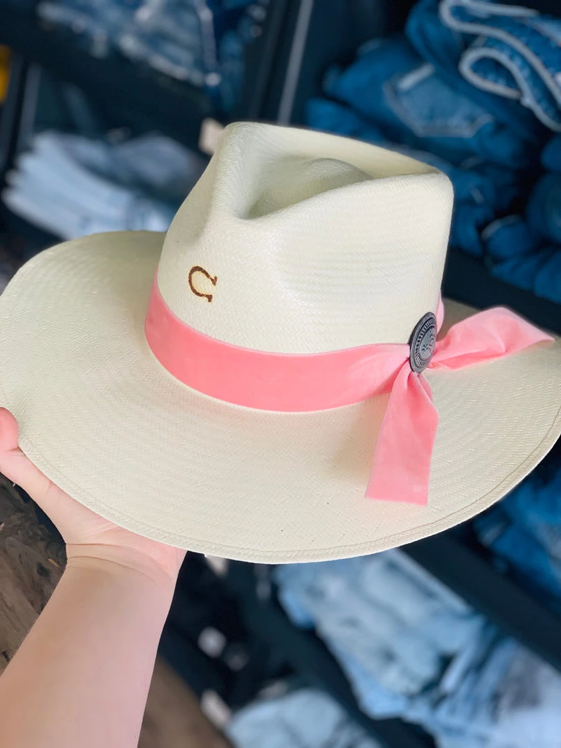 Gorgeous natural colored straw Charlie1 horse structured hat. Straw hat features a 3 1/2″ Brim, with a velvet pink hat band and a beautiful engraved matte silver western aztec navajo oval pendent that makes for an ideal accessory in every woman’s travel wardrobe. Hat has a traditional pinch front crease with a branded C logo. Hat is super light weight and comfortable. This hat adds a whimsical charm to any babes western flair! The ready to hit the road look is carefree and goes well with both western and urban cowgirl looks.